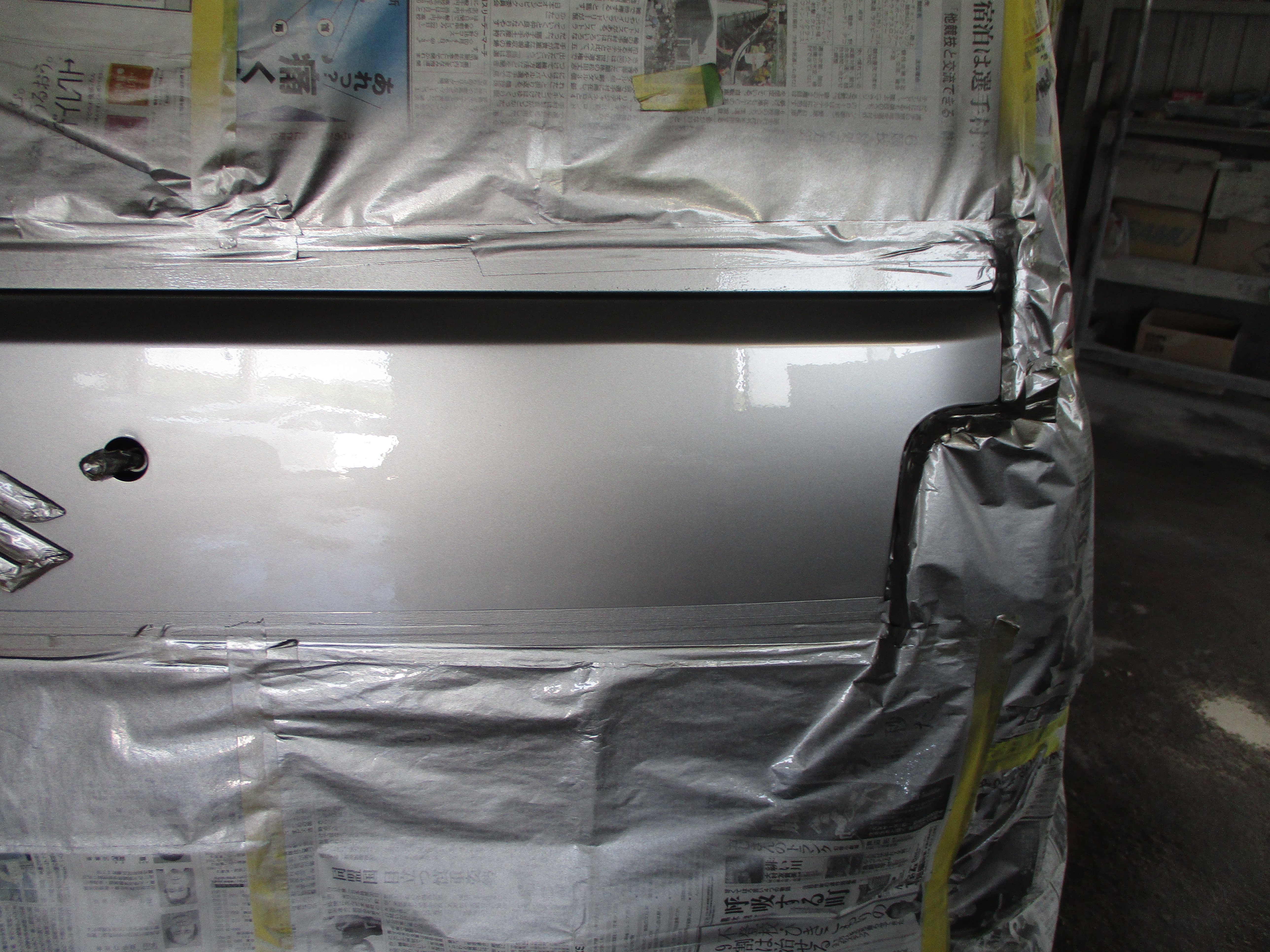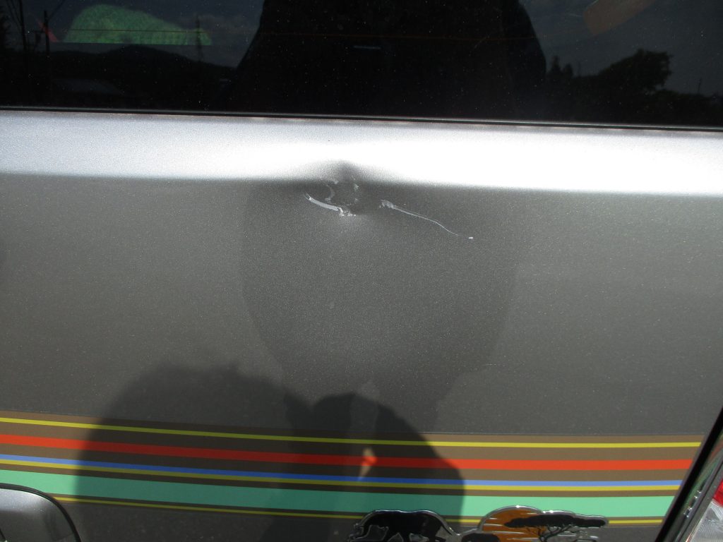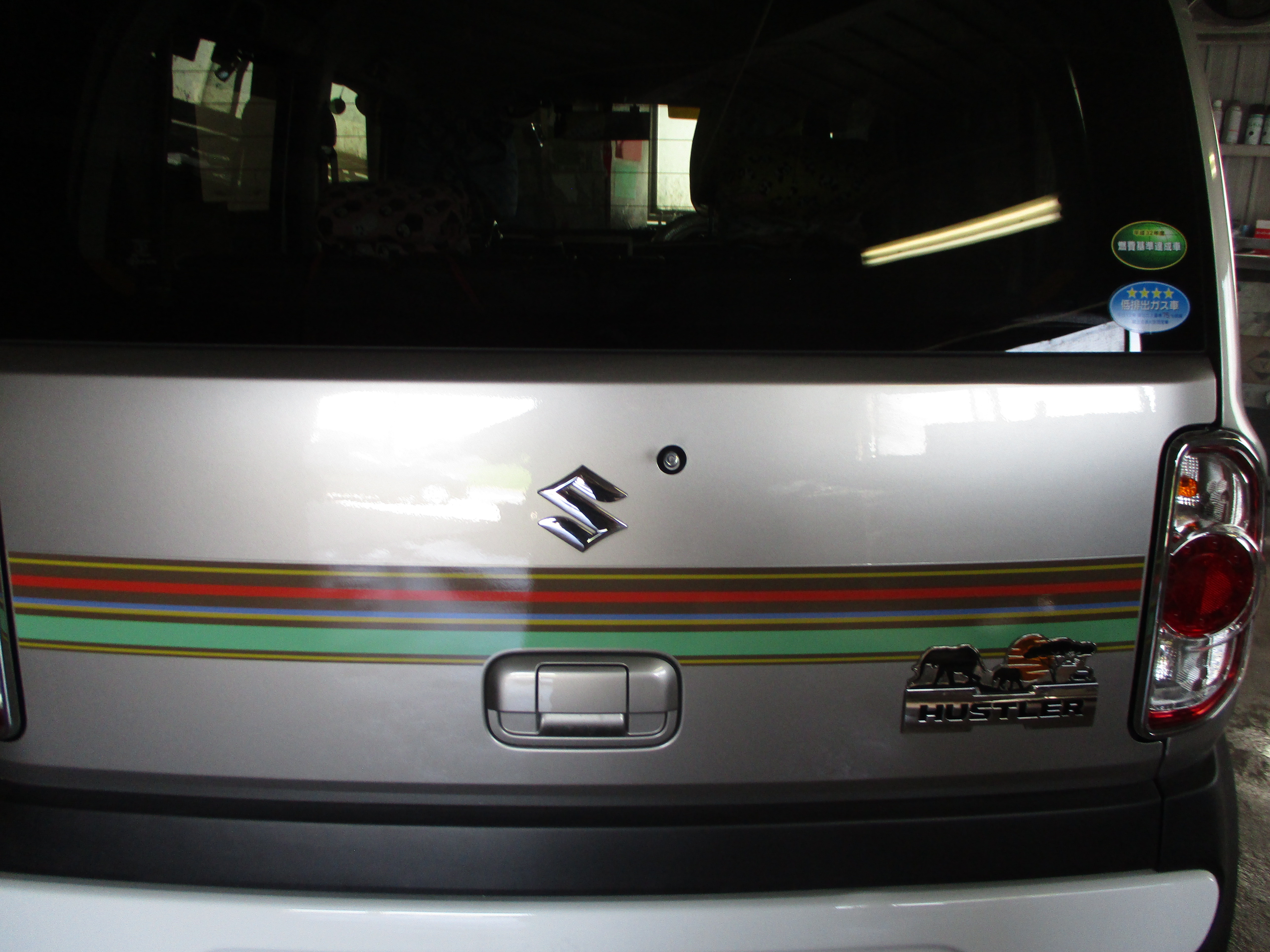 バックドアのリアガラスの下側の角部分が縦に少し凹んでいて、傷が二本入っています。バックドアの真ん中に純正のステッカーが貼ってありますが剥がして貼るとかなり手間ですので養生しての塗装となります。