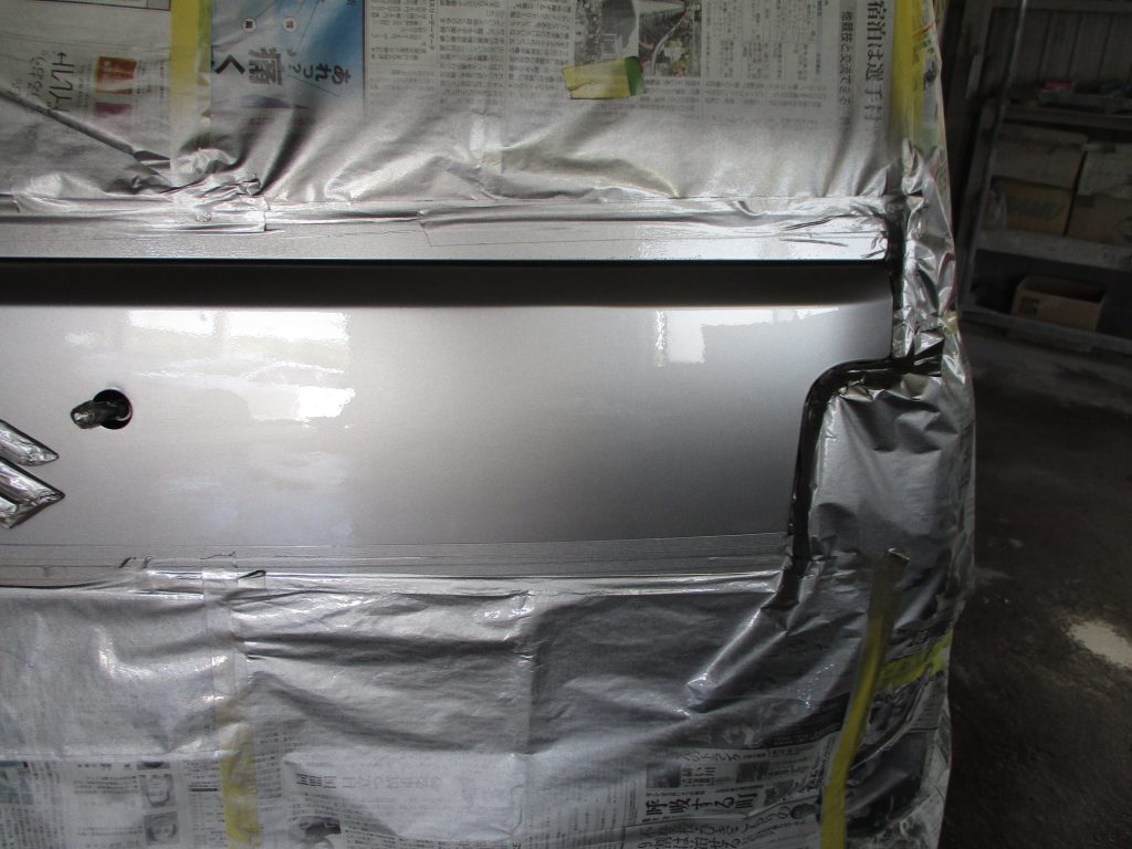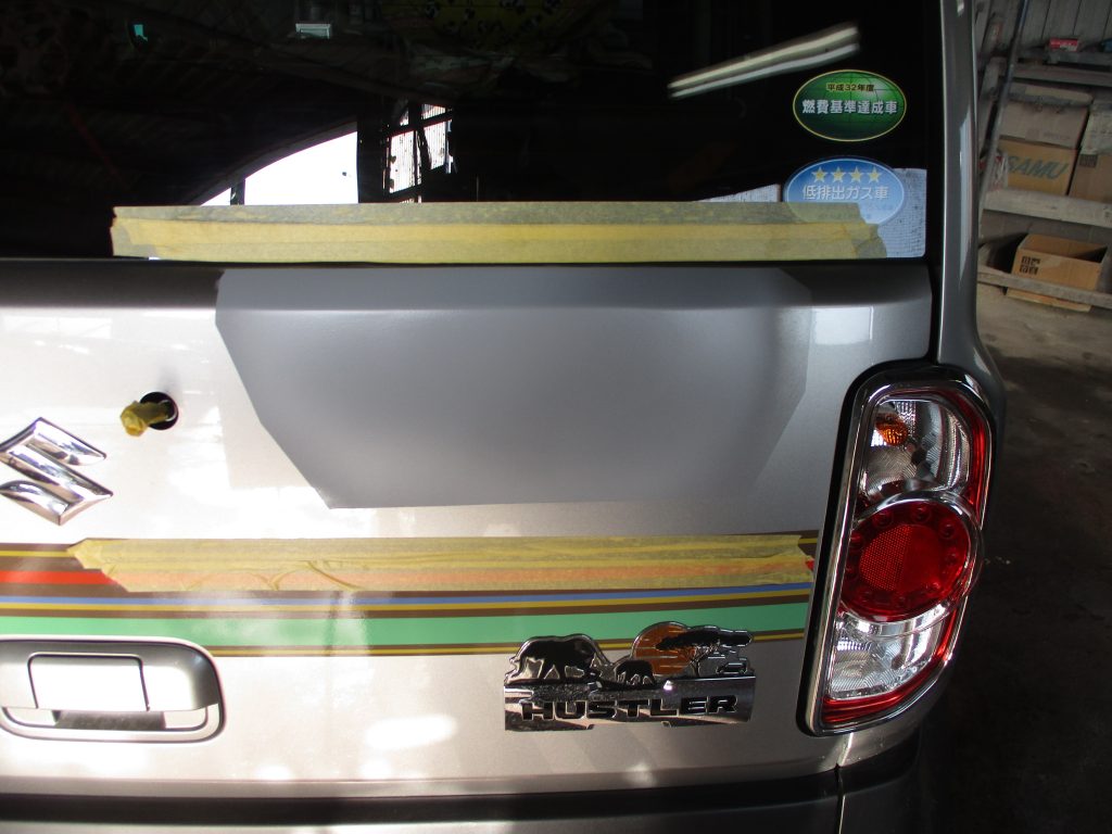 パテの工程が終わったら、サフェーサーを吹き付けて塗膜が落ち着いたらペーパーで滑らかにしていきます。次に塗装に移りますが最初に塗装する色を作ります。色番をコーションラベルから確認してハスラーの色を調色します。一回目の調色では合いませんのでそこから現車に色を正確に近付けていき出来上がったら、最後はバックドアをスプレーガンで綺麗に塗っていきます。