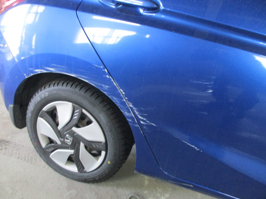 ネットでの検索でサイオ板金にご連絡していただいて、今回はこちらから出張で見積りさせていただきました。まず損傷の確認してからお見積り金額を提示させていただきました。他社よりもお安くできましたのでその場でご依頼をいただきました。損傷はリアドアとリアクォータに数か所にキズがあり少しヘコミもあります。