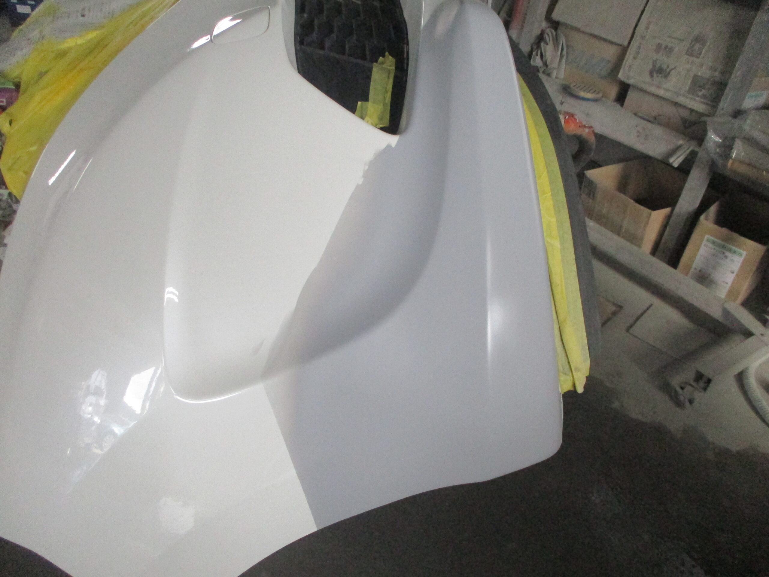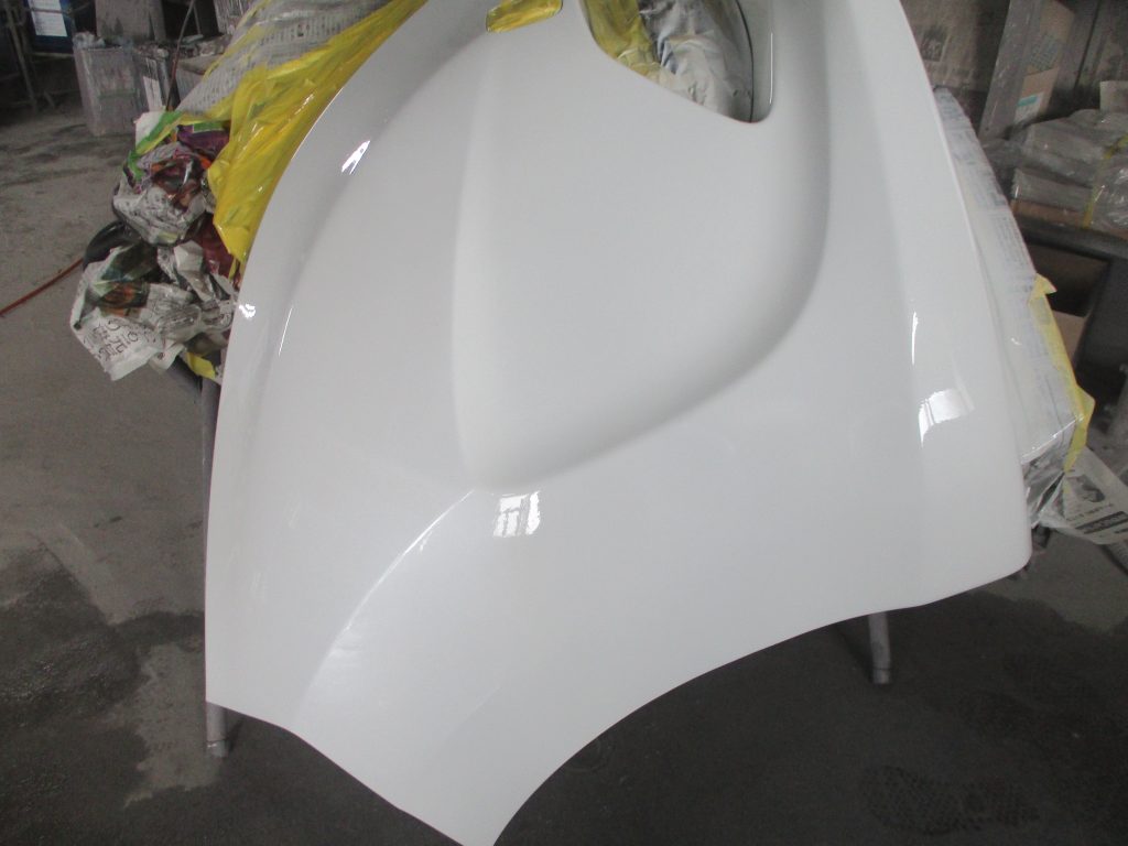 塗装が出来たらフロントバンパーに熱を加えて炙り、乾いたフロントバンパーを車体に組み付けたら、最後にフロントバンパーをポリッシャーで丁寧に磨いたら修理完了となります。