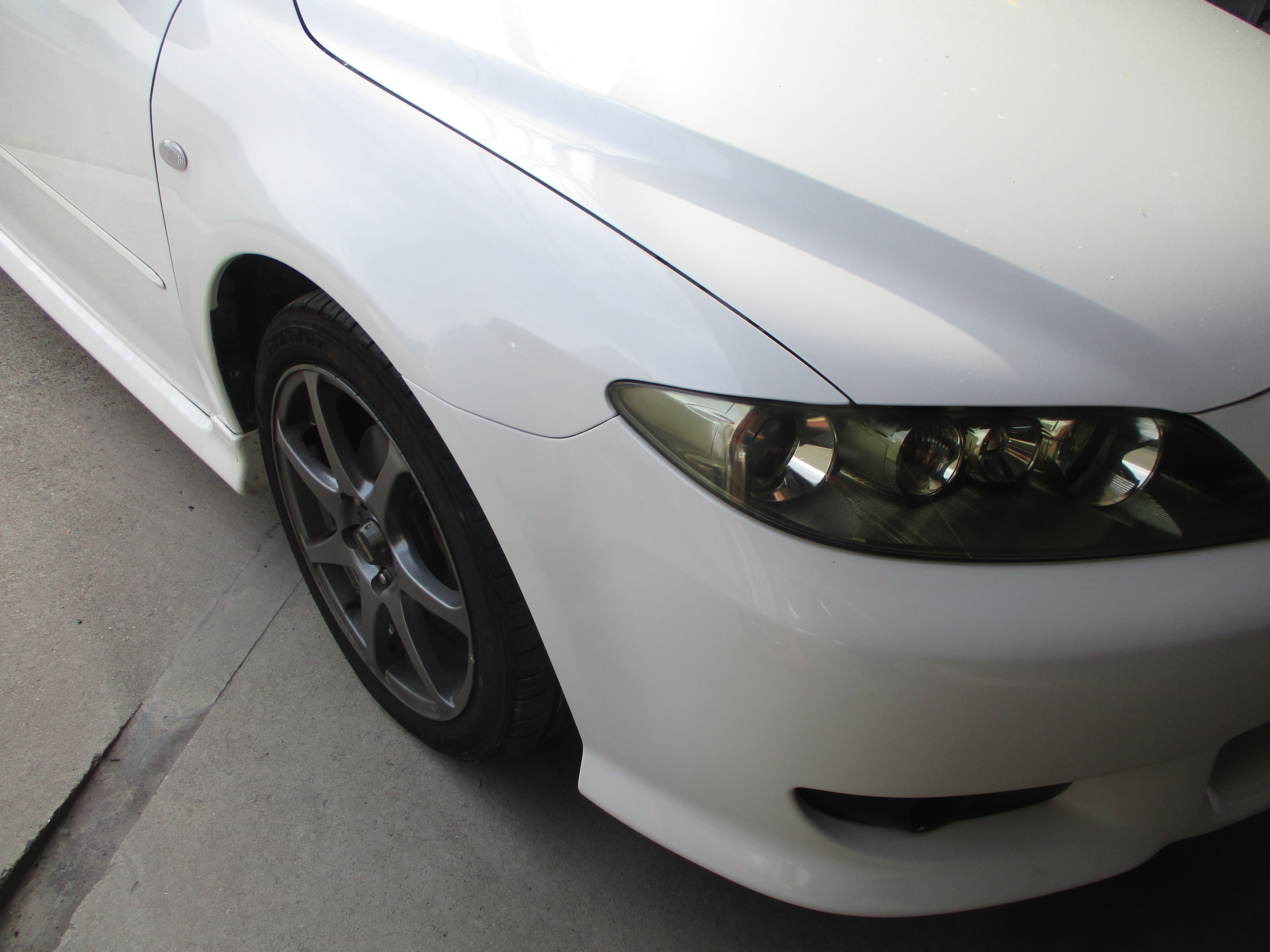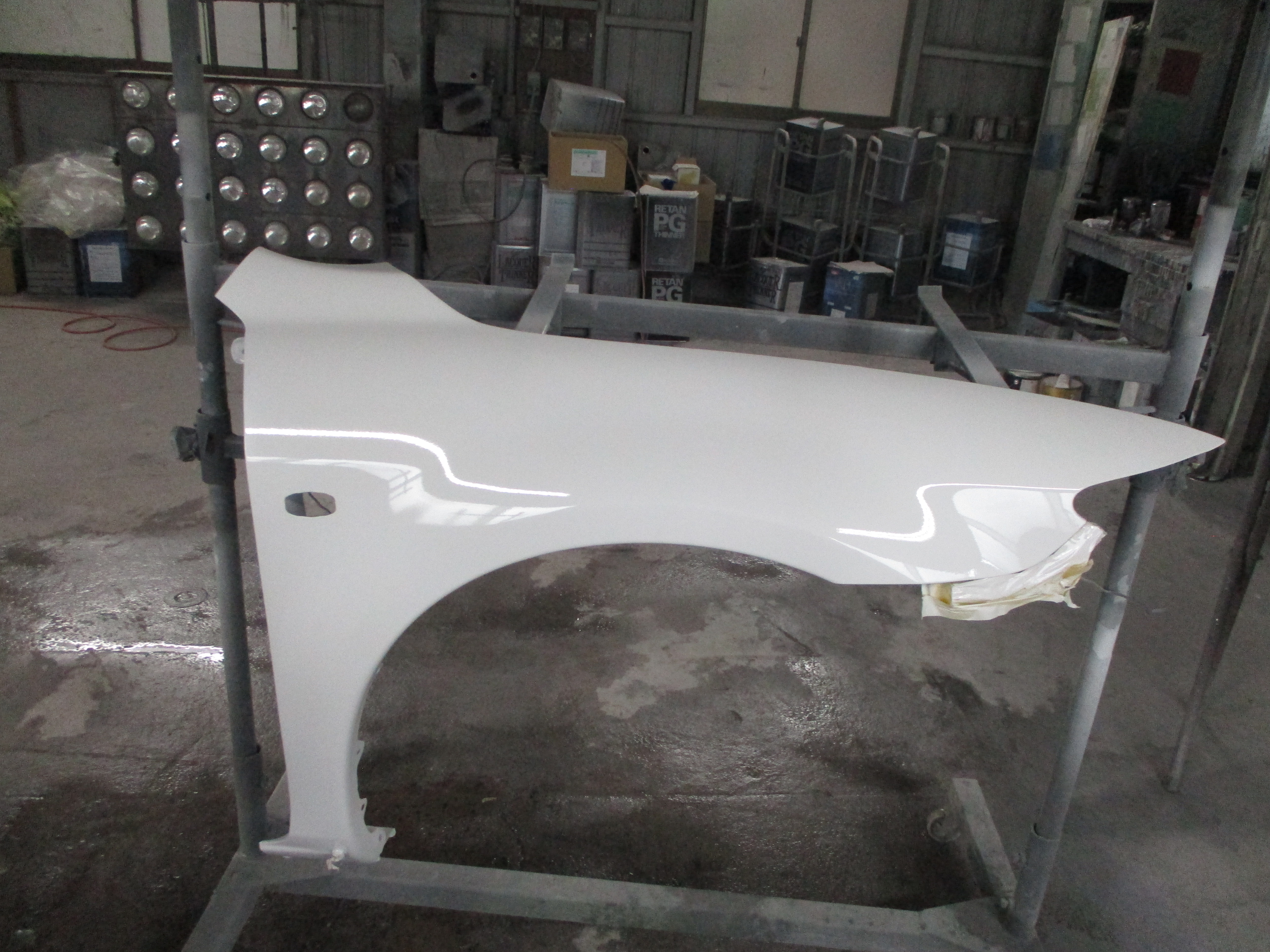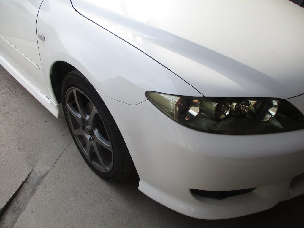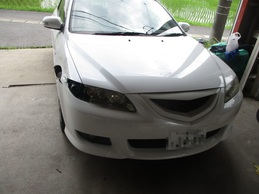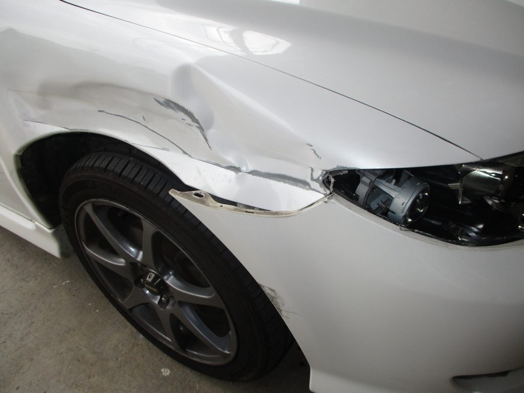 今回はフロントフェンダーとヘッドライトはリサイクル部品に交換しますので、まずバンパーを先に外してからフェンダーとヘッドライトを外す作業をしていきます。バンパーを外して中の状態を見るとインナーサポートが曲がっていたので、フェンダーを合わせながら板金して修正します。そしてヘッドライトも合わせて隙間と噛み合わせなど確認します。