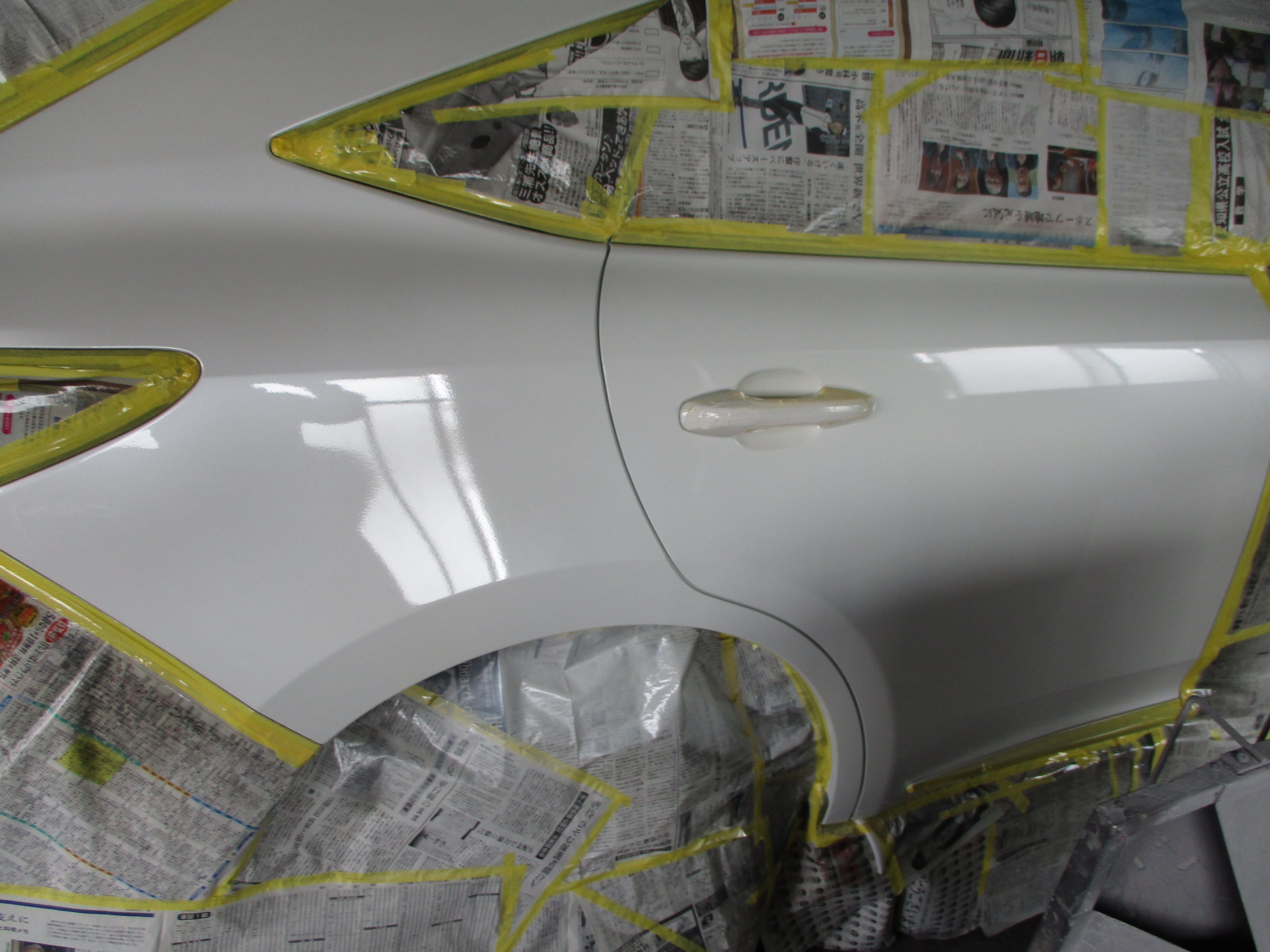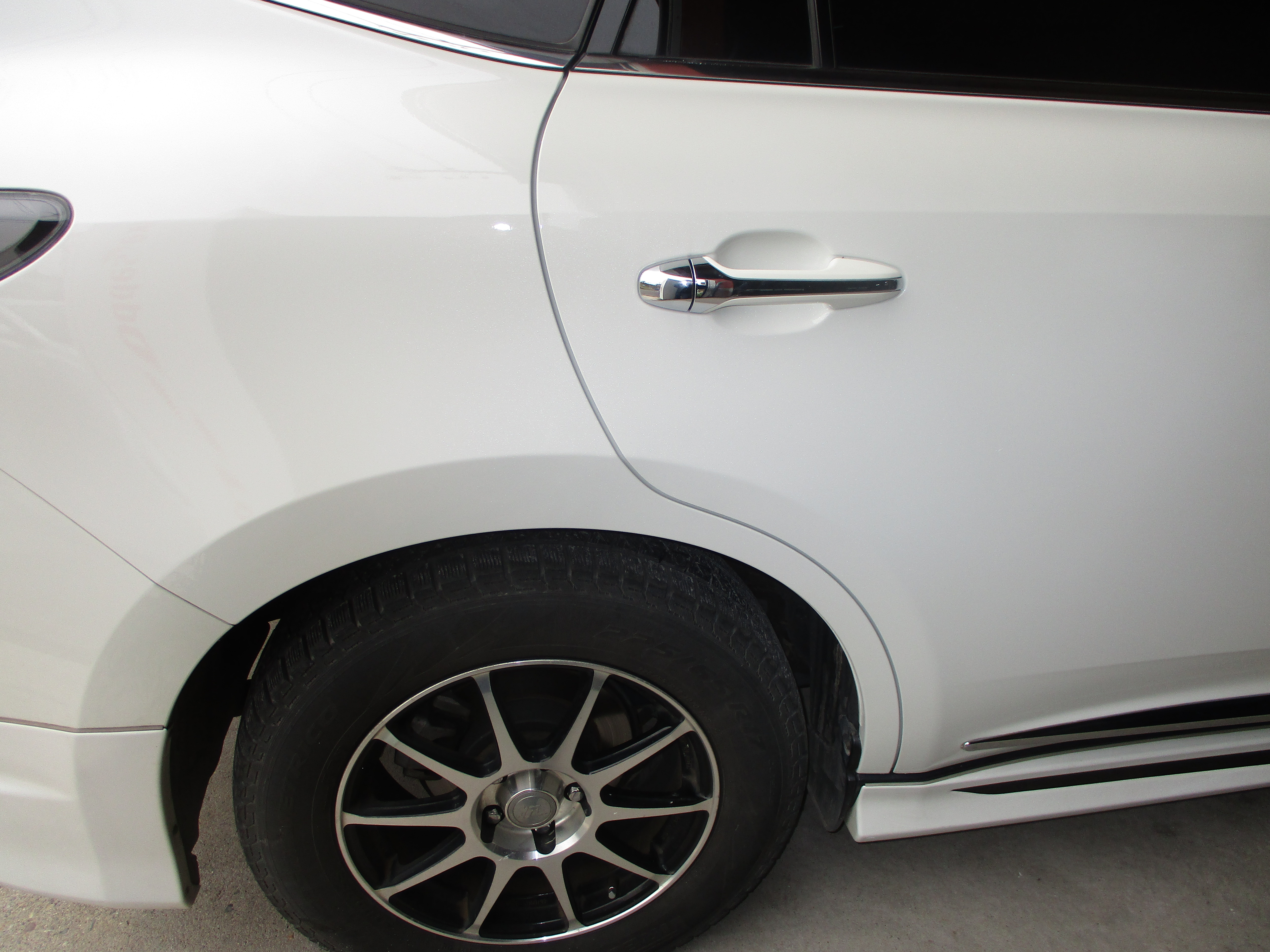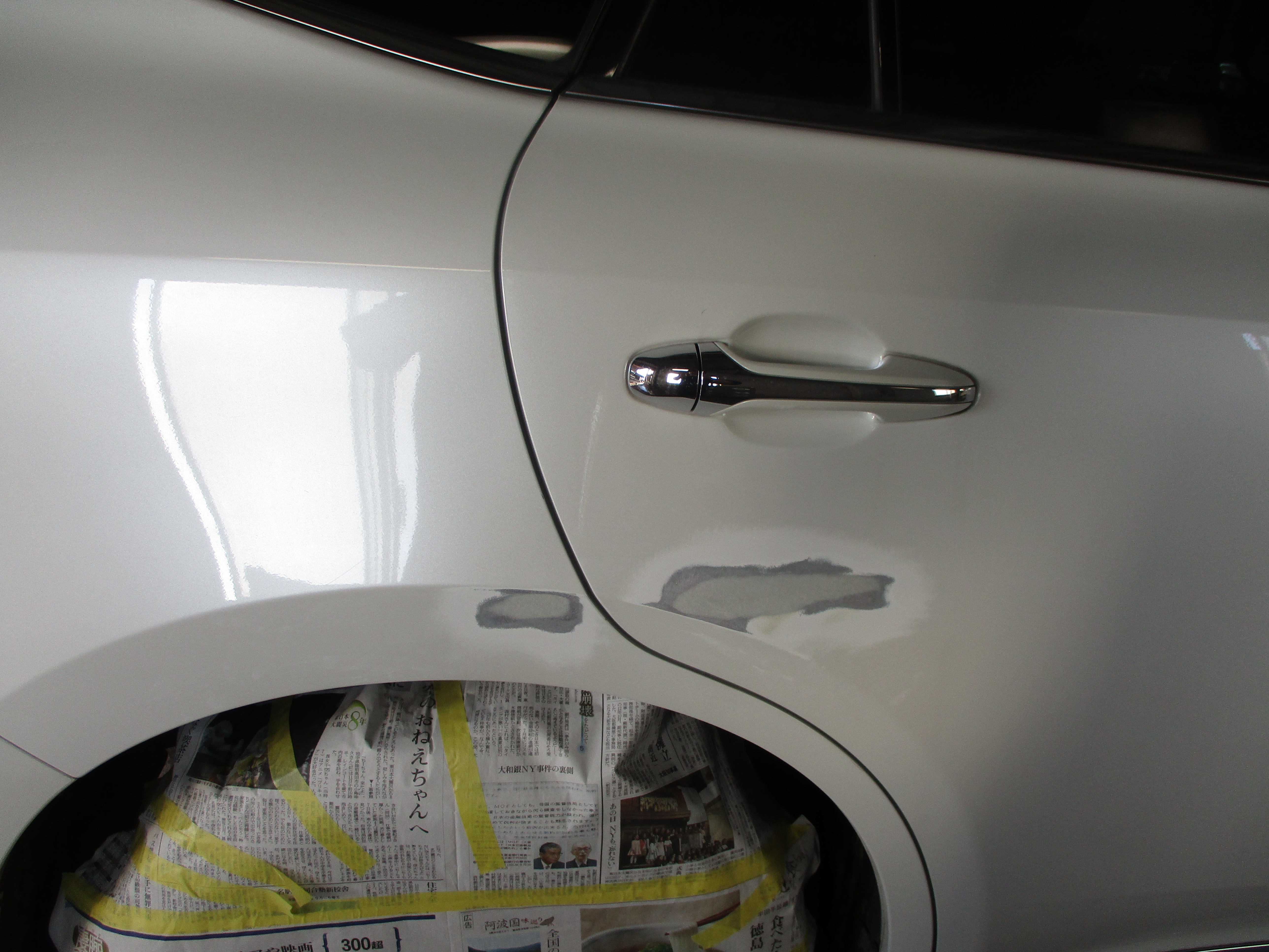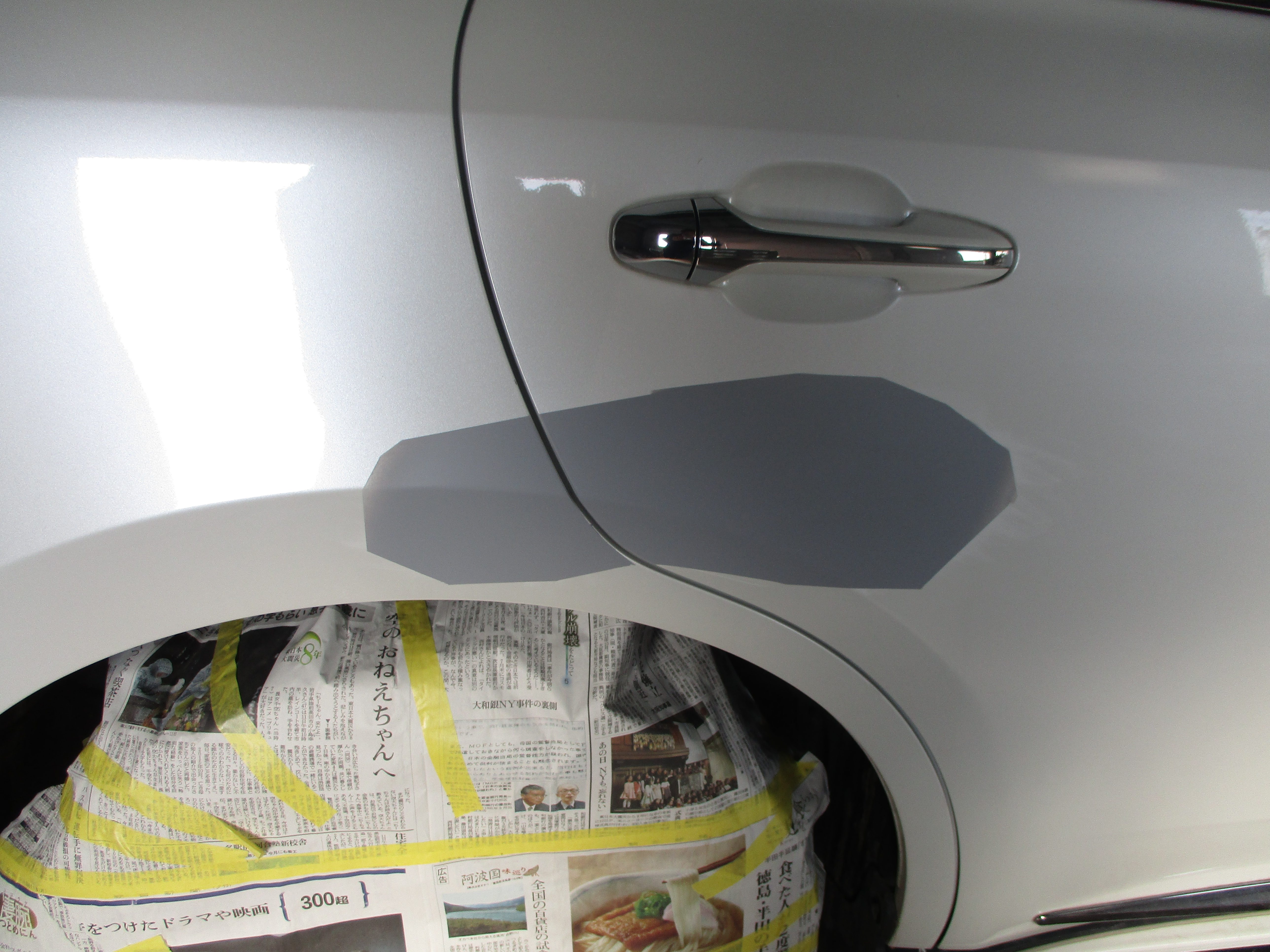 今回のハリアーは最初にお客様から損傷個所を見せていただいた時、少し遠目から見たときにドコッてツッコミたくなるレベルのヘコミでしたが、いざお車に近くまで寄ってみると画像では見えずらいですがリアドアよりもクォーターの方が明らかにへこみが深かったのですが、パテからでも十分に治せる範囲ですので早速修理を取り掛かりましょう。