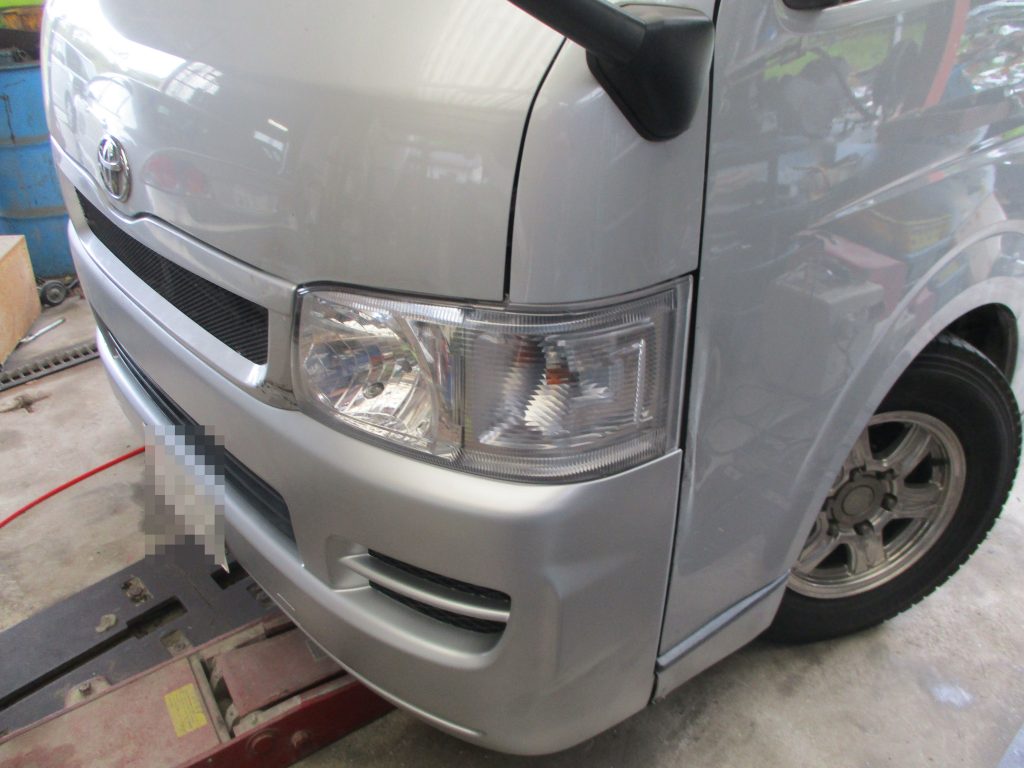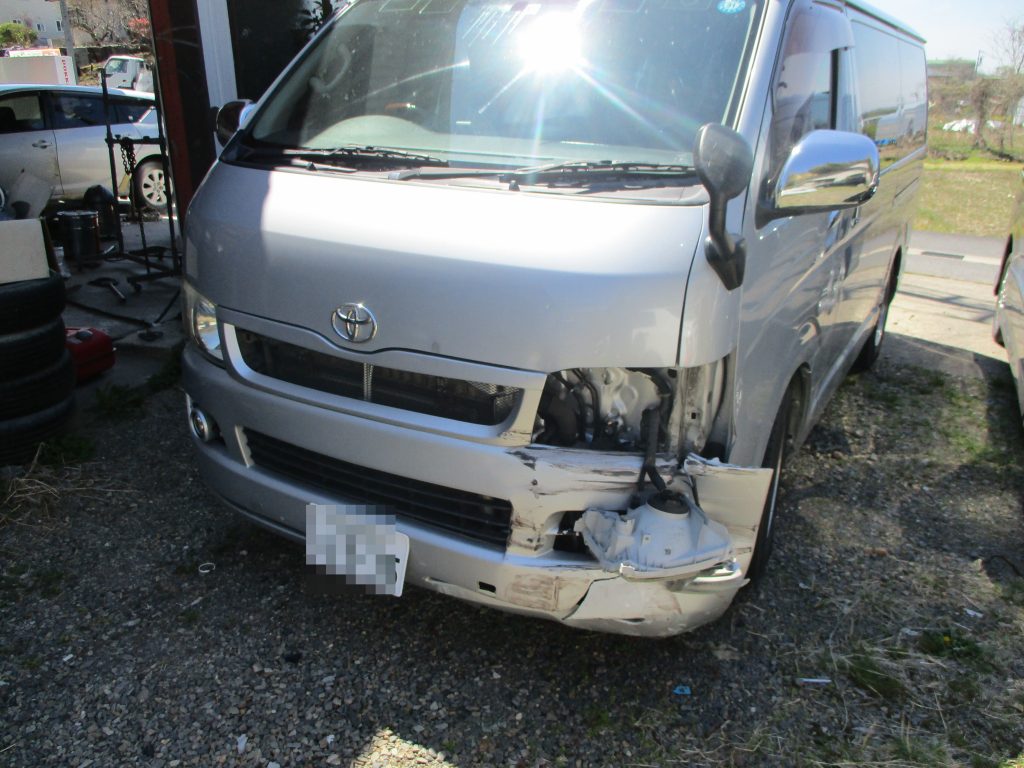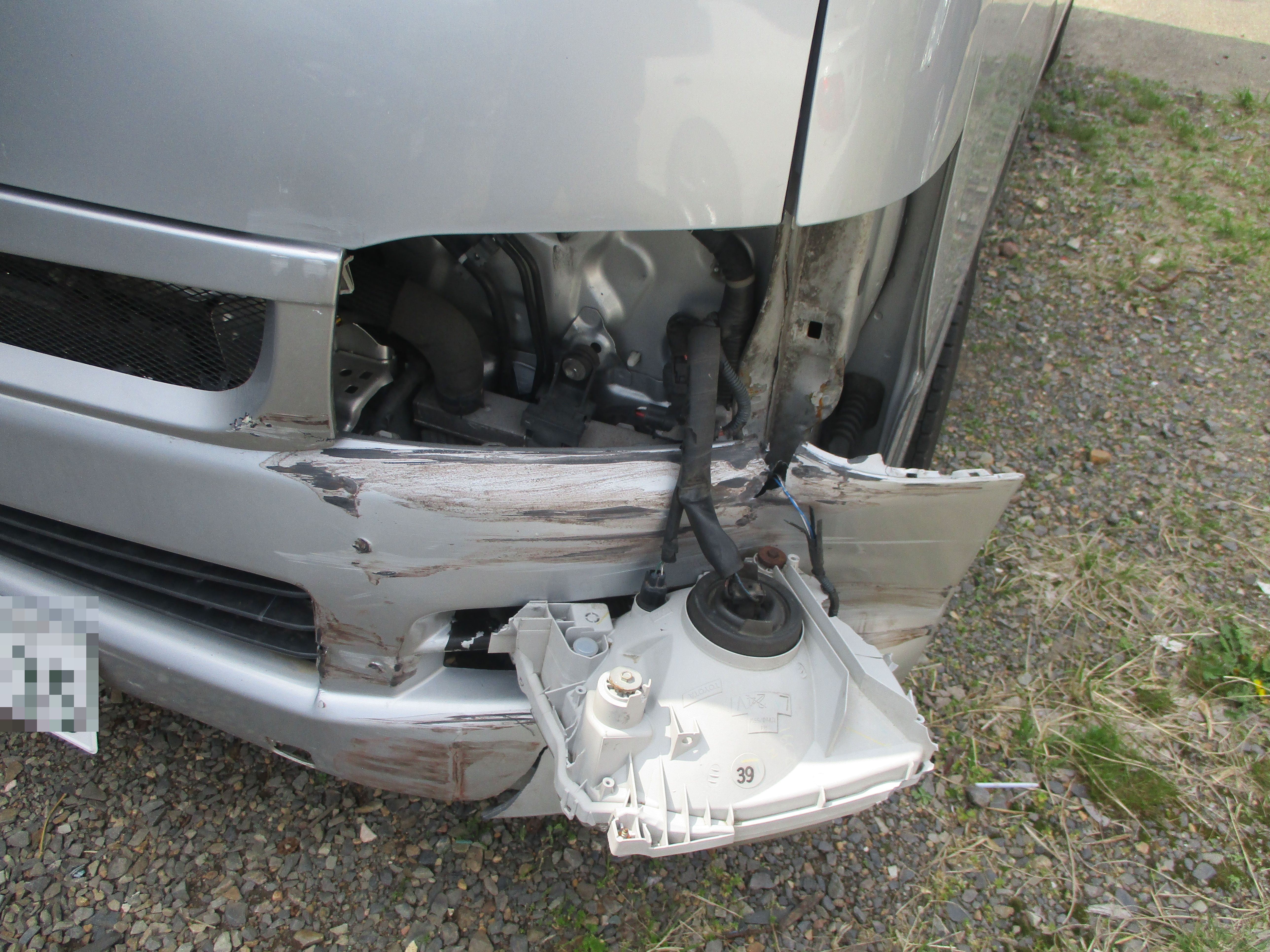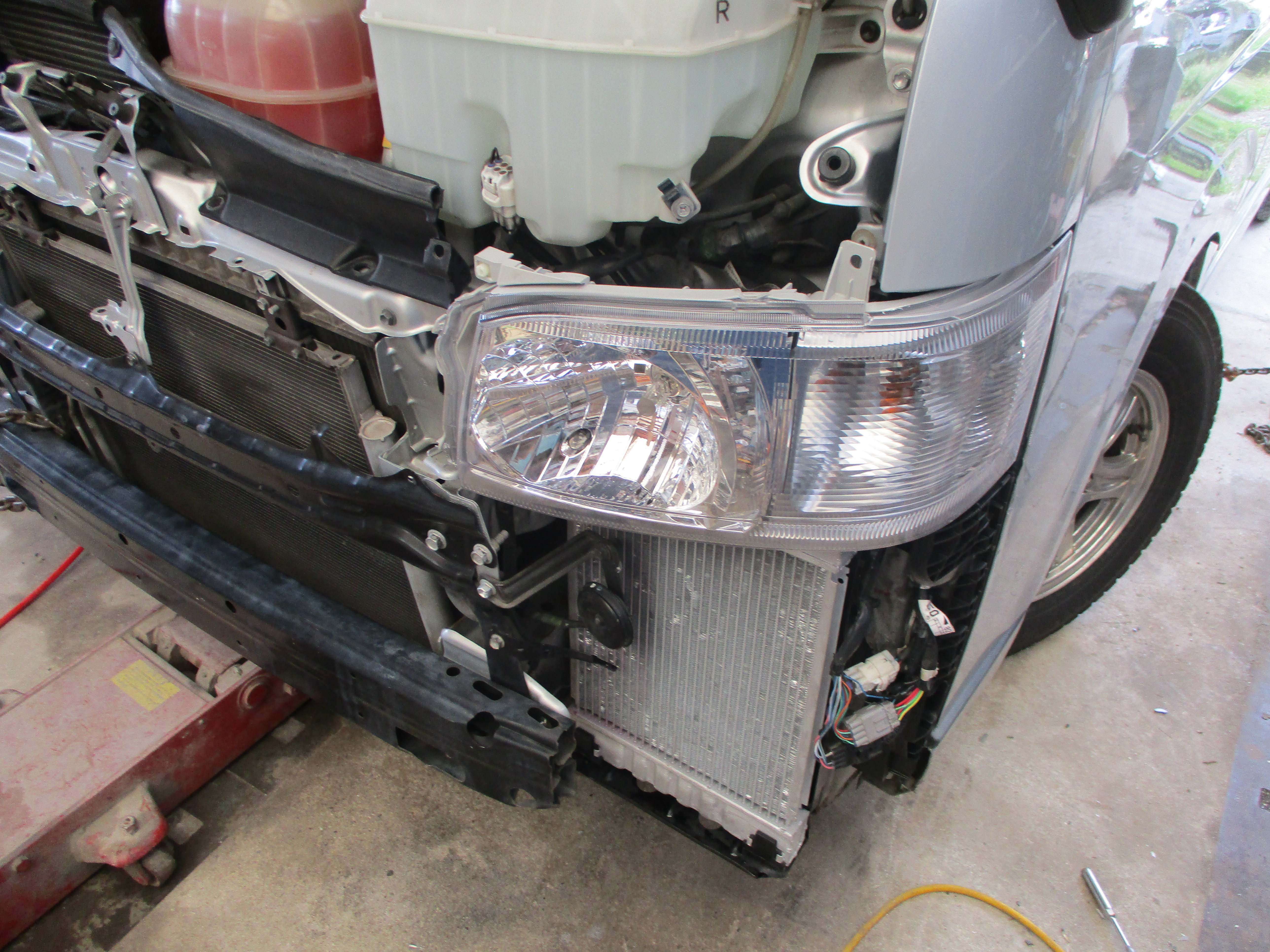 フロントバンパーが折れ曲って変形していて、ヘッドライトも画像の通り表のレンズがバキバキ割れて裏も破損して下にぶら下がってがっていましたので、こちらの部品は交換していきます。