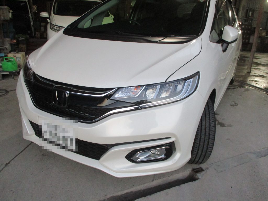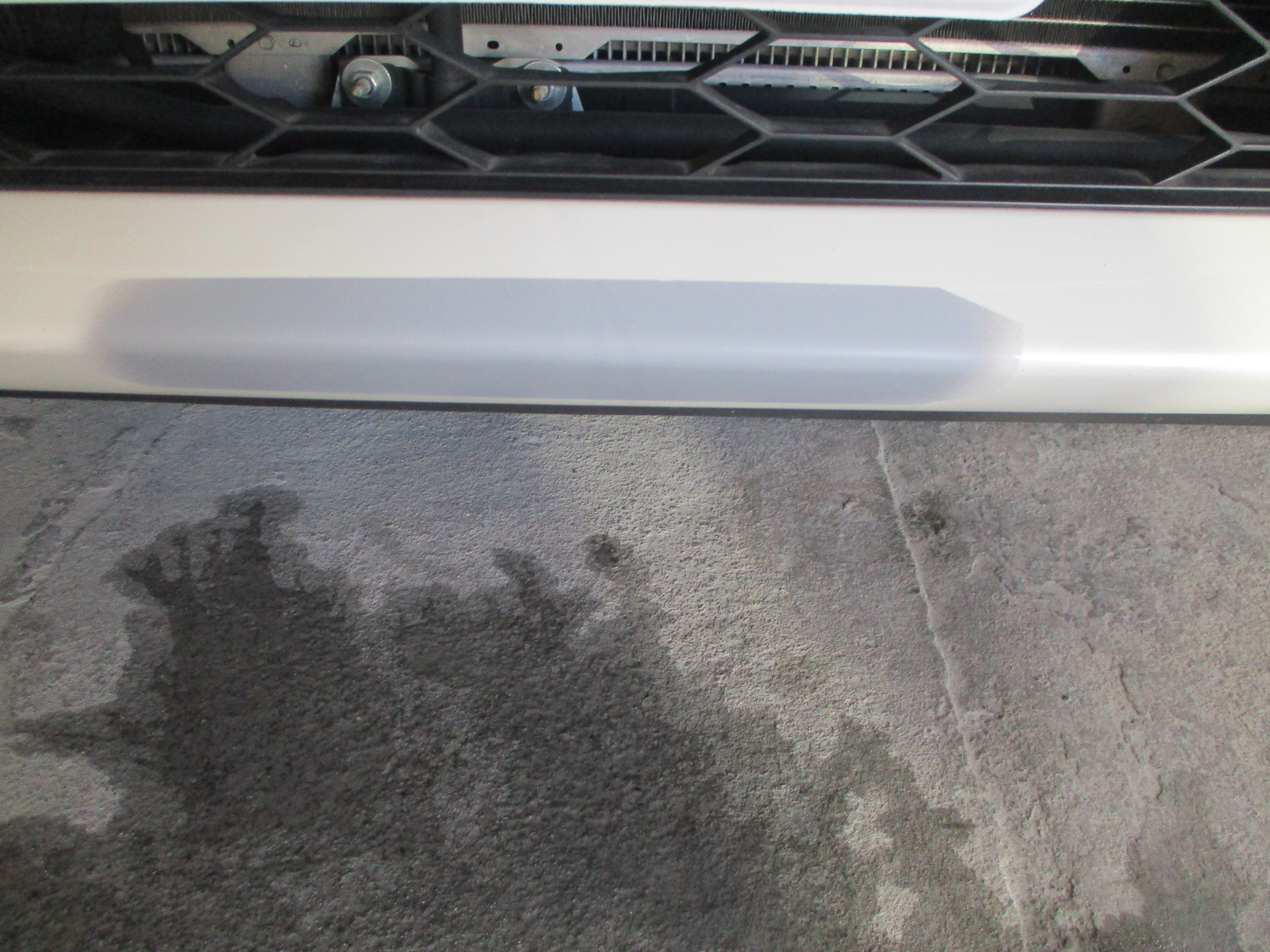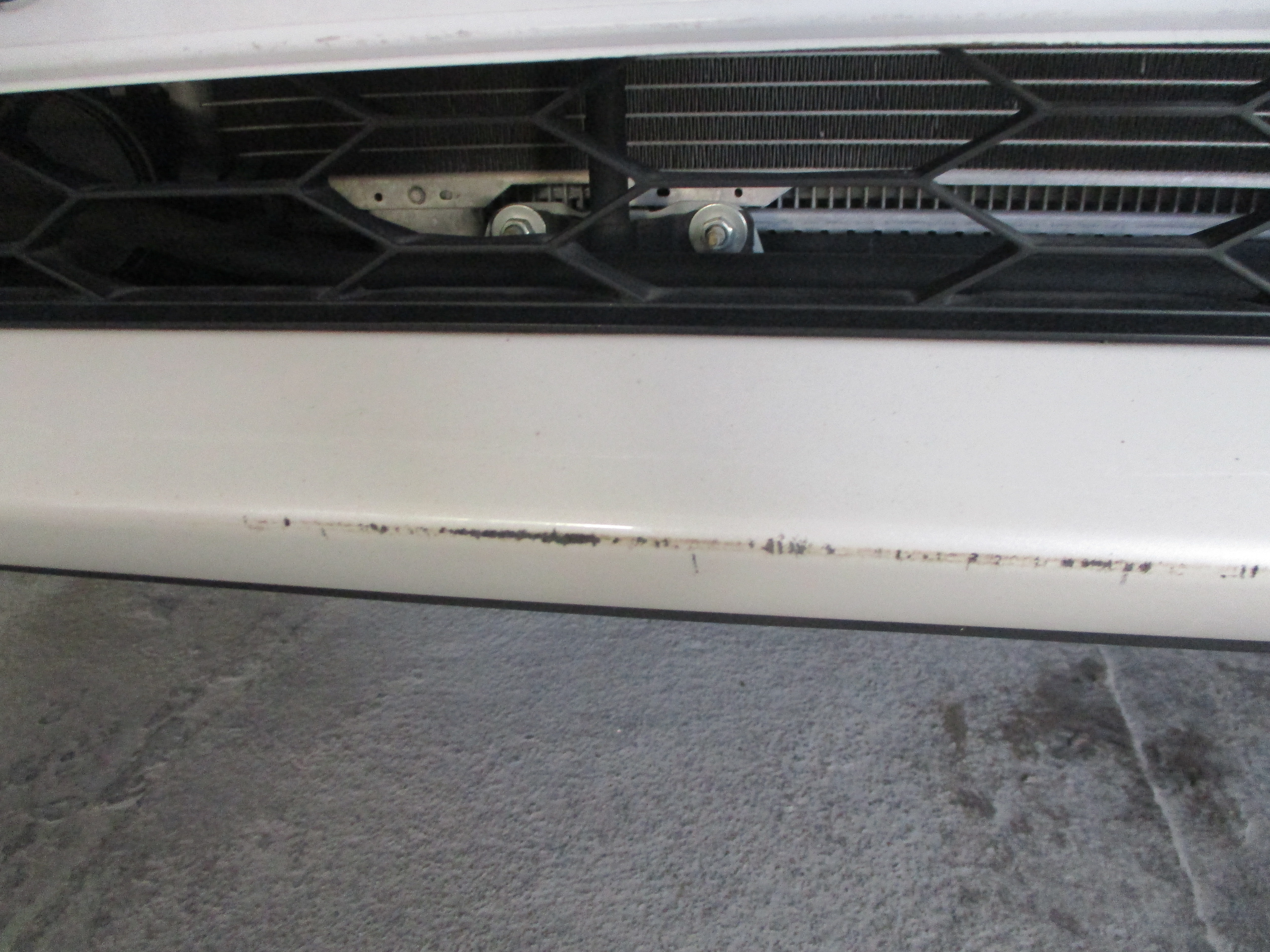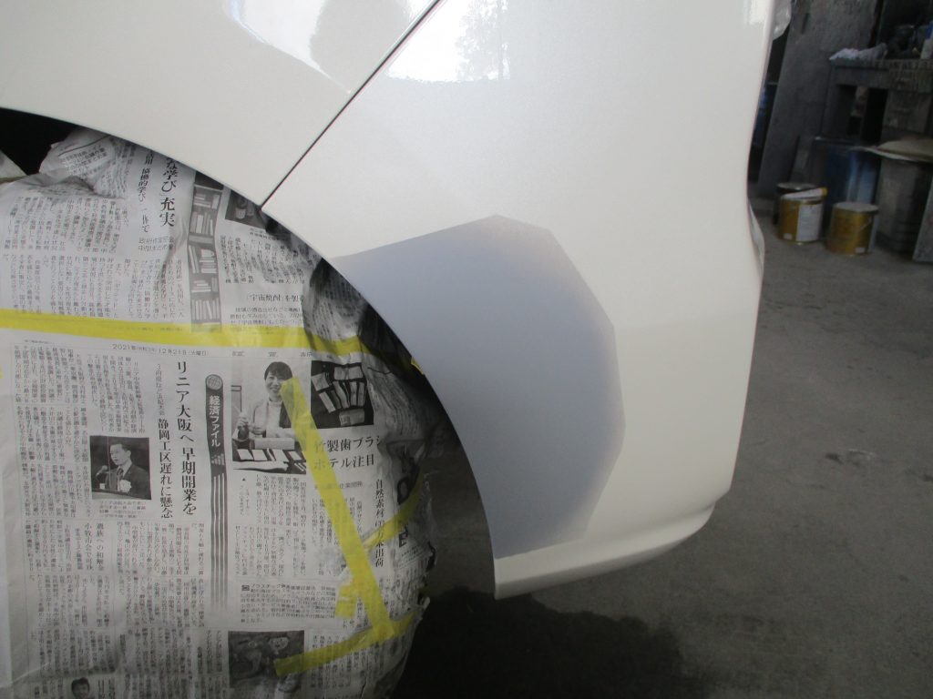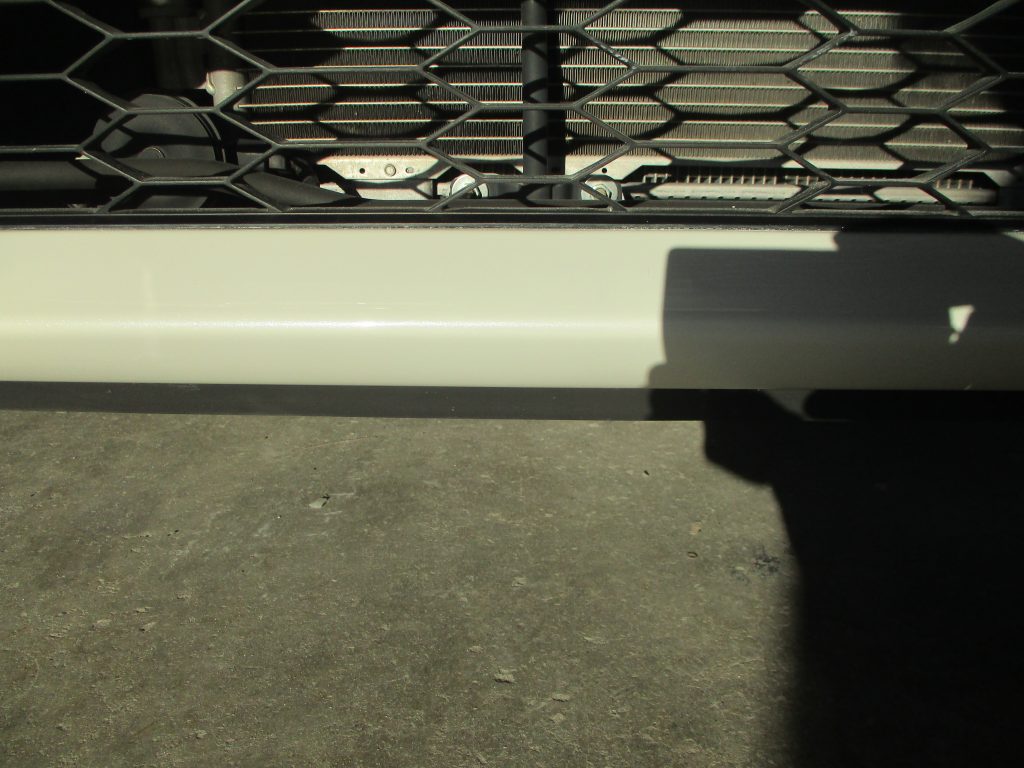 フロントバンパーの真ん中の一番下側の細い部分の先端に擦りキズがあります。そしてリアバンパーの方も左側に軽い凹みキズがありますので同時に修理作業していきます。