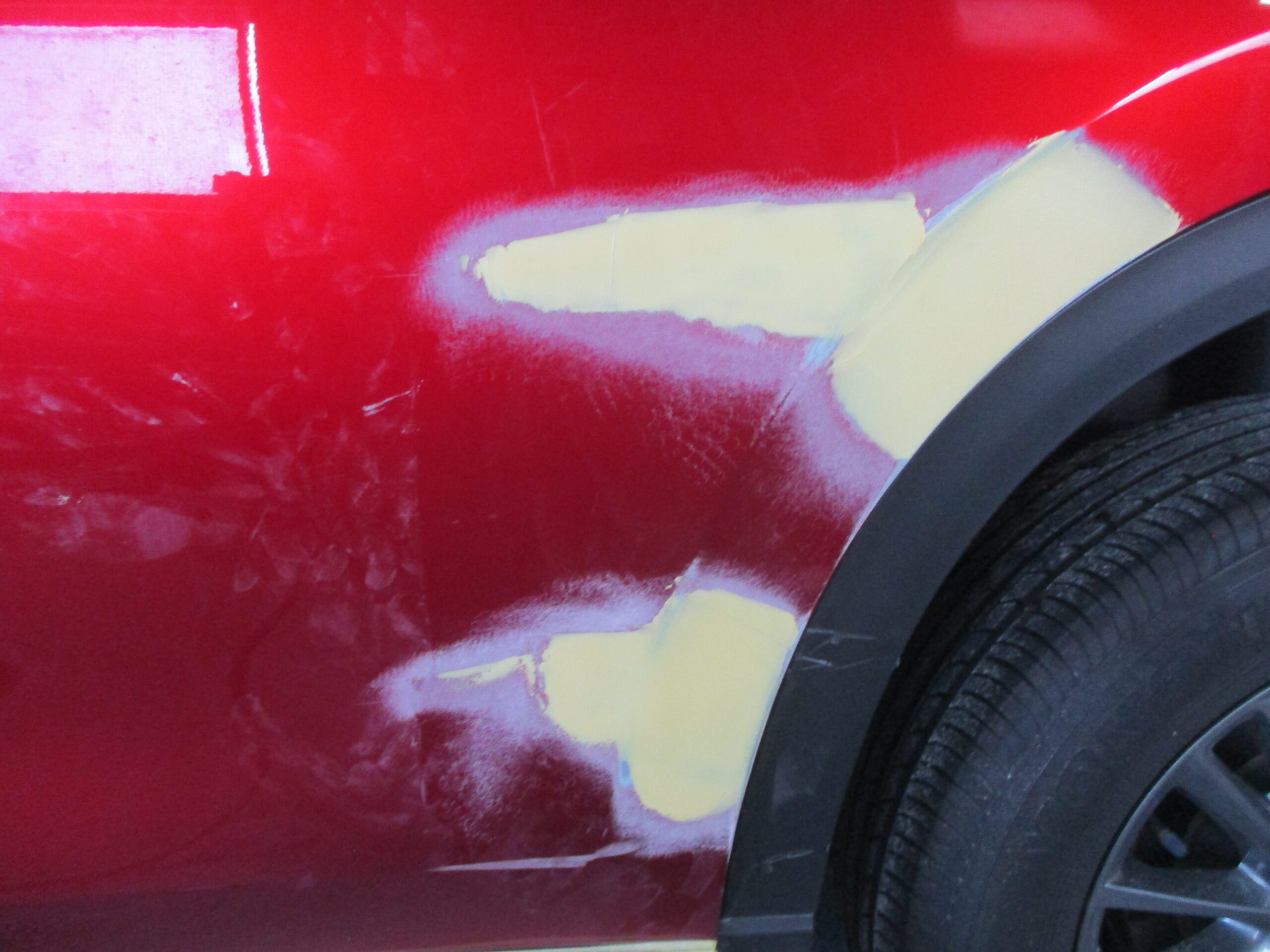 CX-5の左のリアドアのキズ・ヘコミによる板金・塗装での修理になります。
