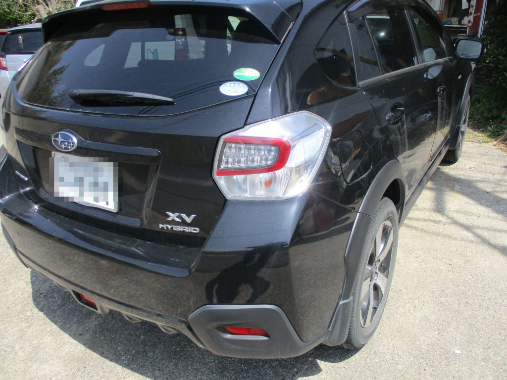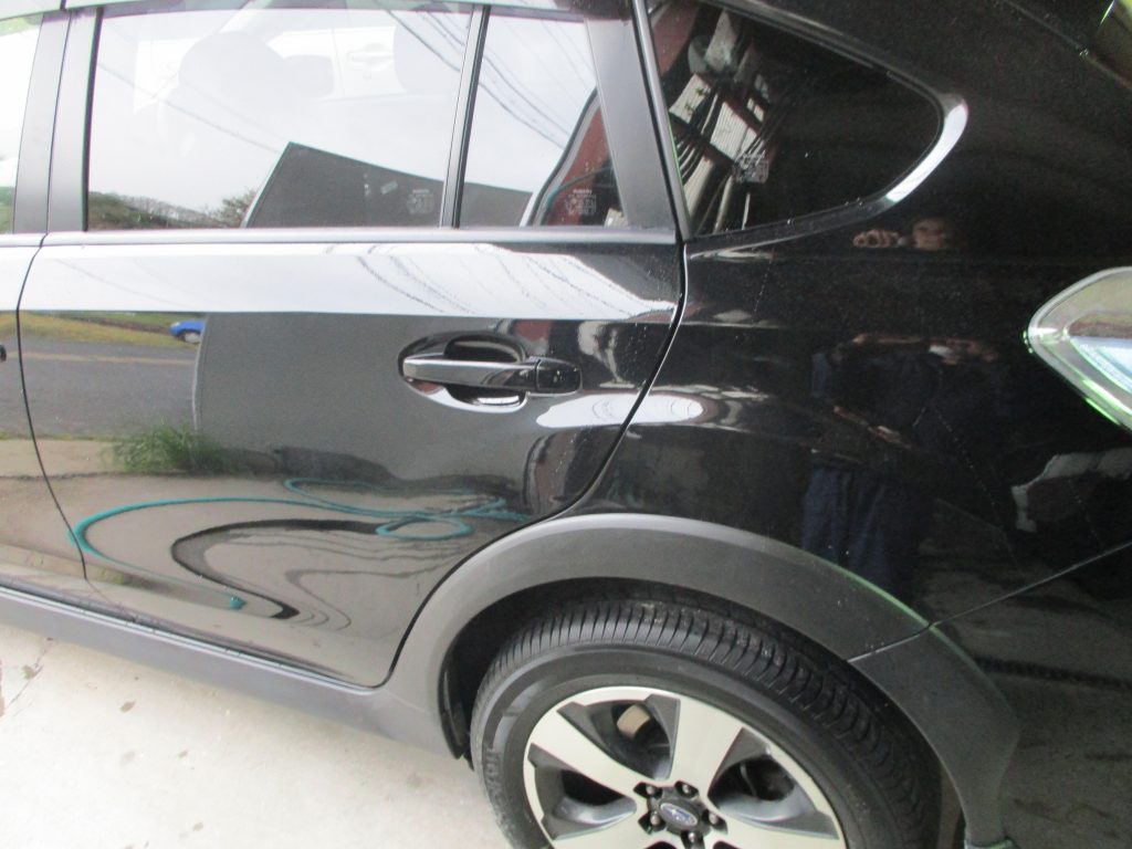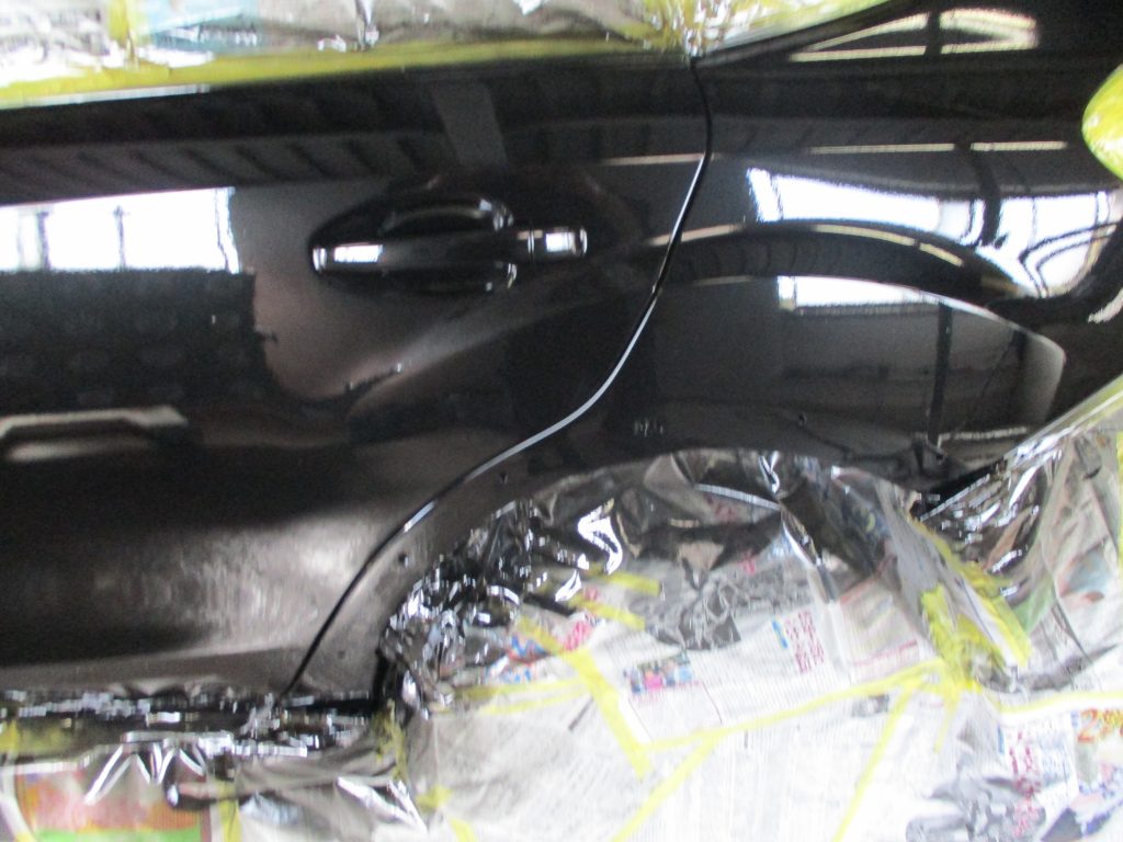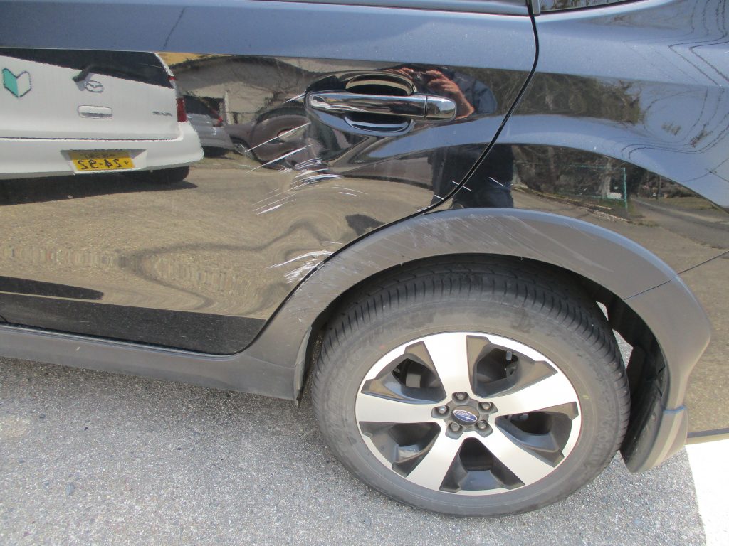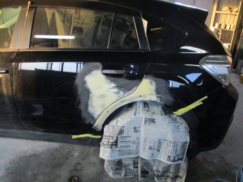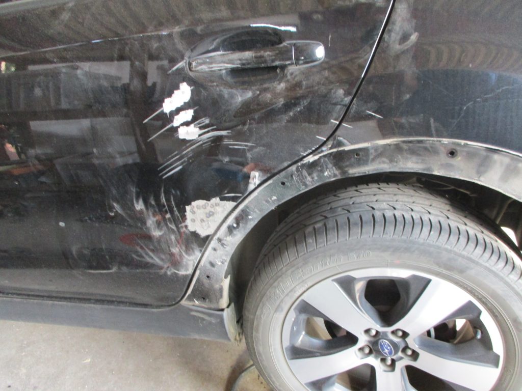 画像では分かりにくいですが、アーチモールの奥のロッカーパネルも押されて、深いヘコミと変形があります。この部分も板金で直します。表のアーチモールは新品でも安い部品ですので交換します。それとリアドアのドアノブにもキズがありますので、これも一緒に塗装します。