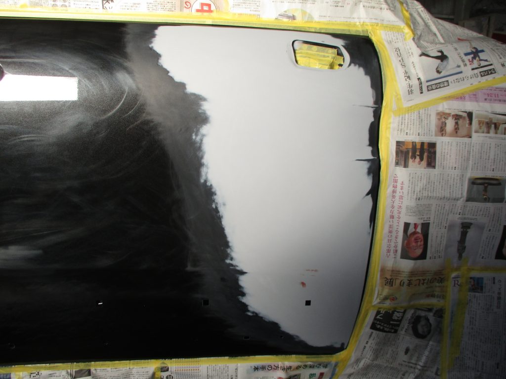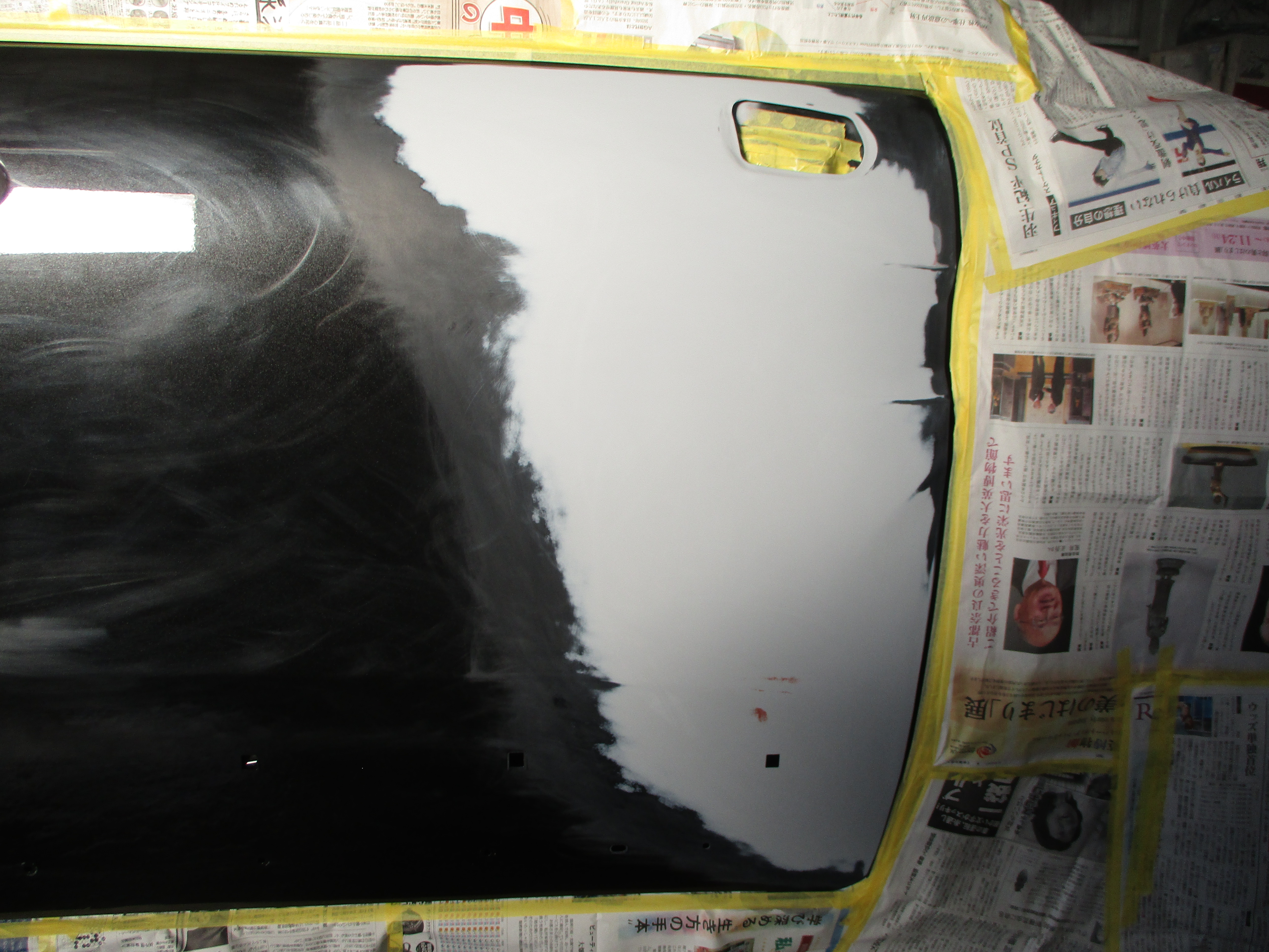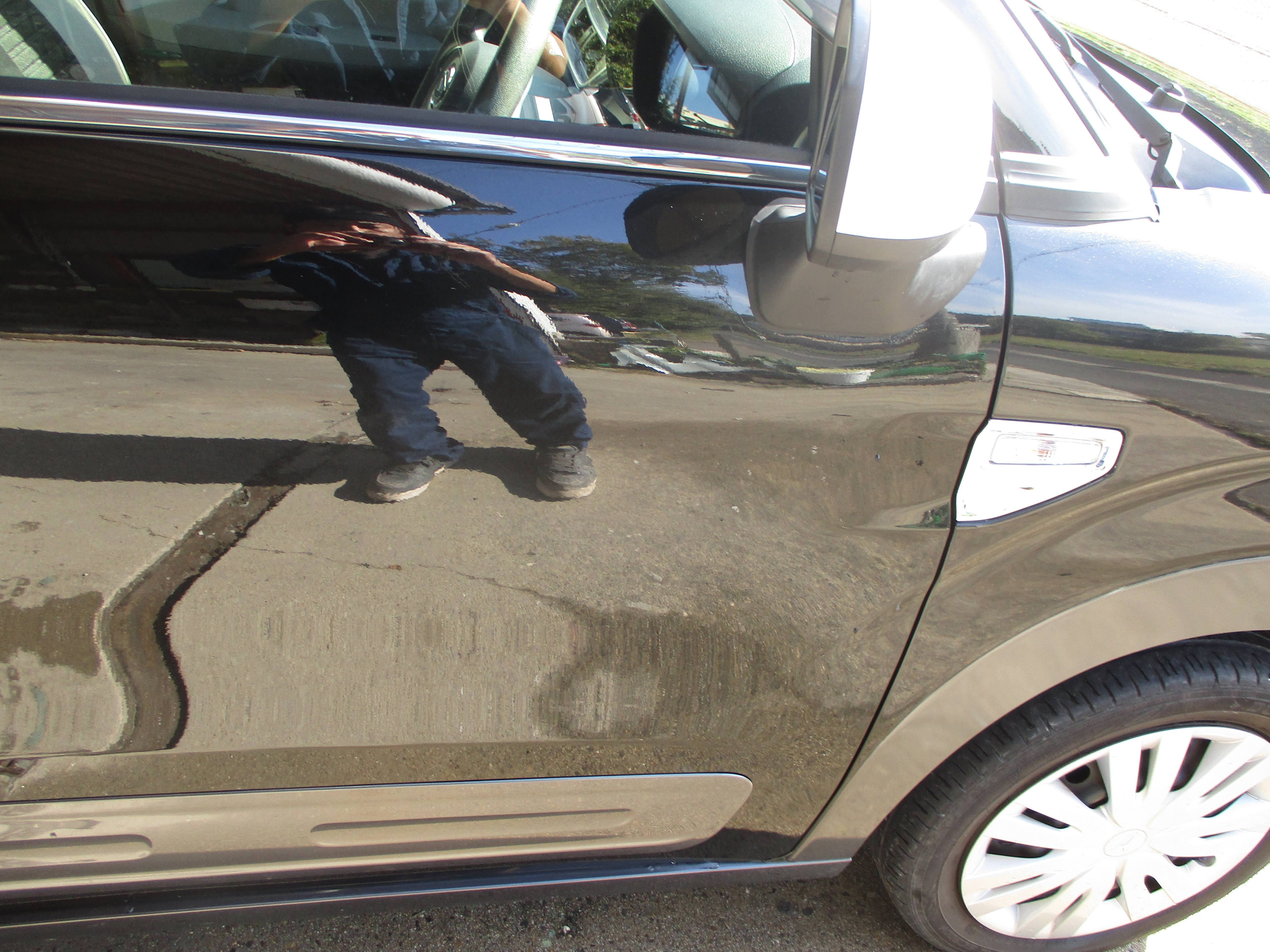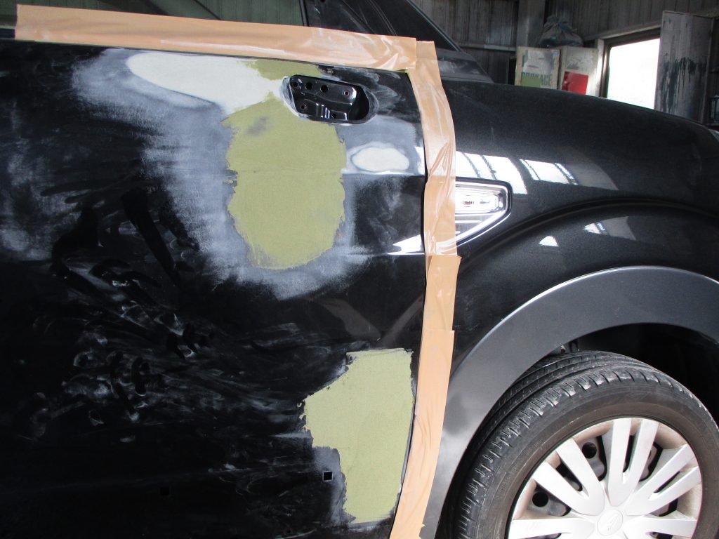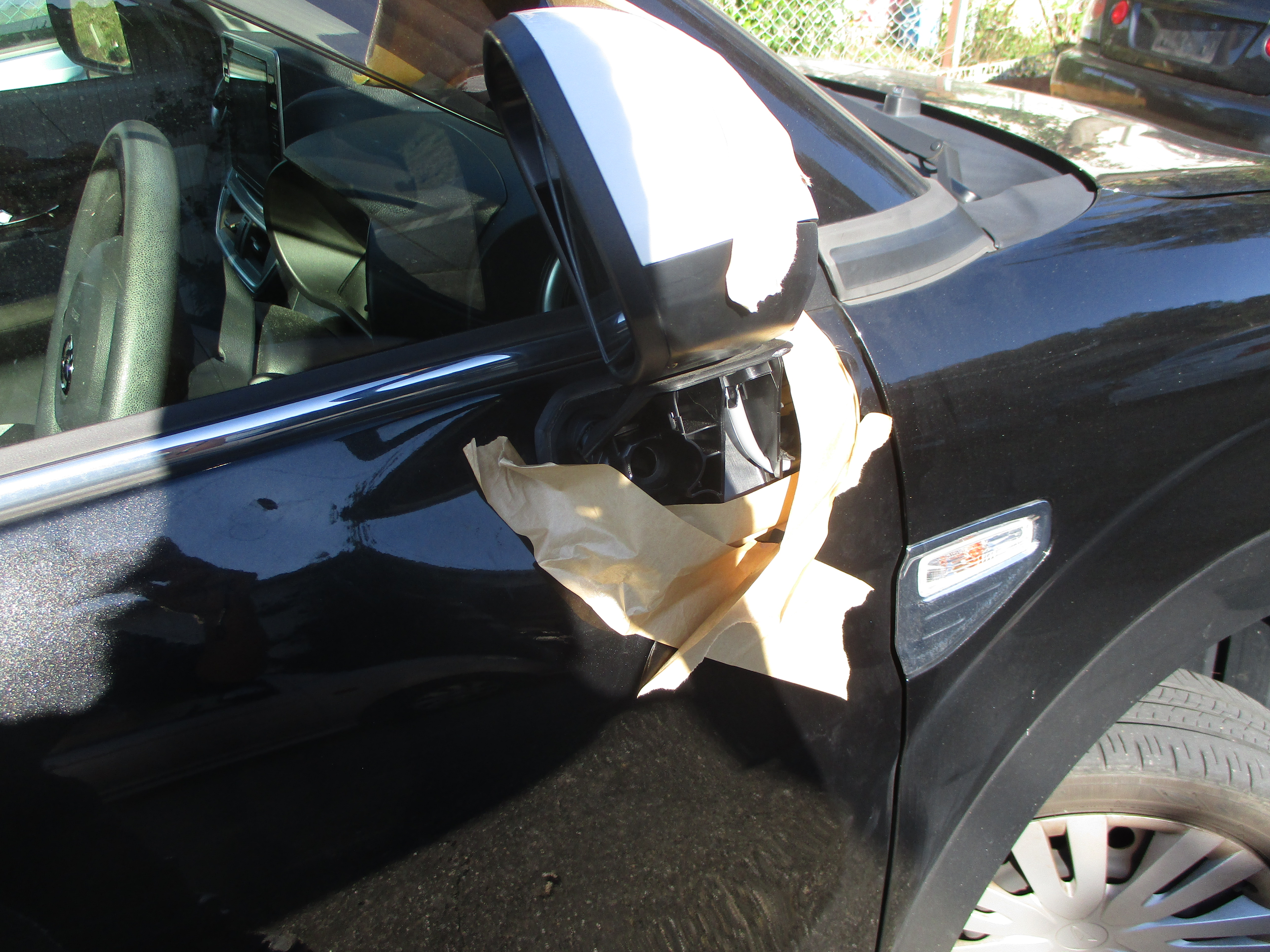 右のドアミラーが酷く損傷していて、ガムテープが貼ってありますが取れかかってて落ちそうになっています。そしてドアミラーをぶつけた衝撃で土台のフロントドア周辺が押し込まれて凹んでいます。ドアミラーは新品に交換して、フロントドアは直します。それと下側にも小さいヘコミがありますので、そちらも板金します。