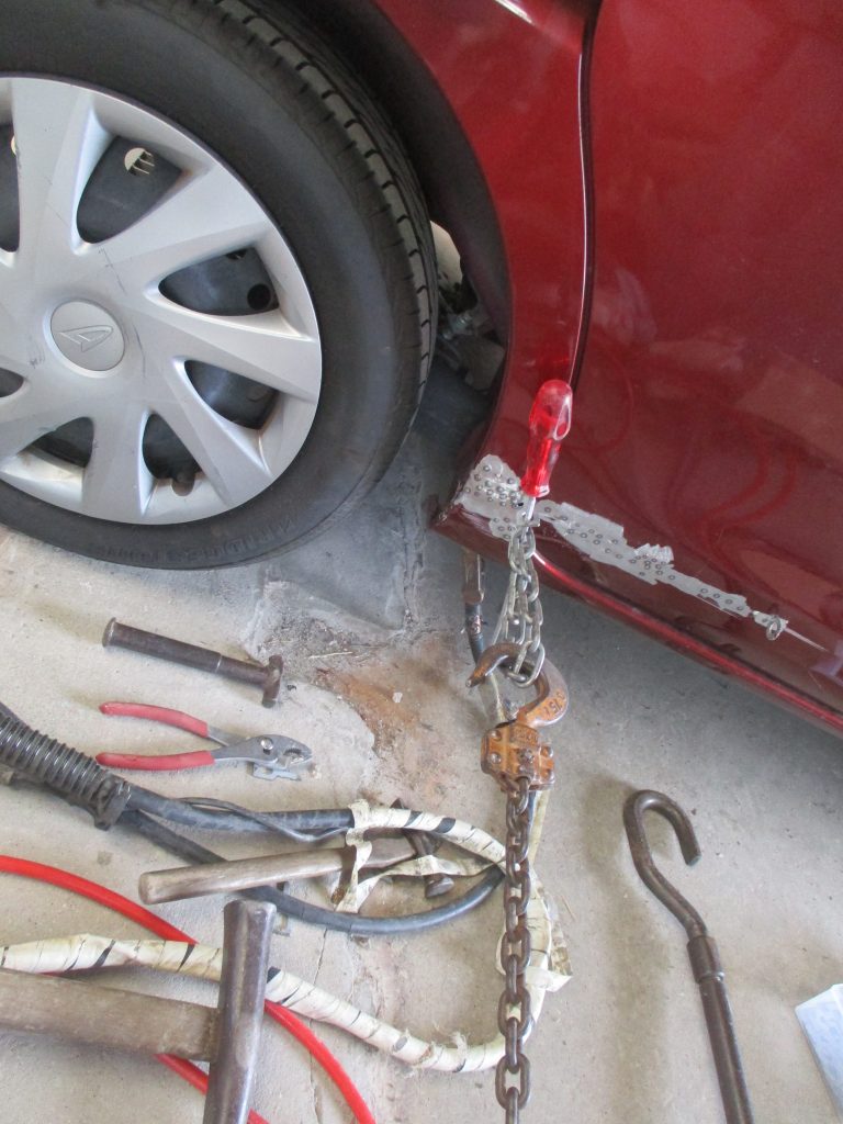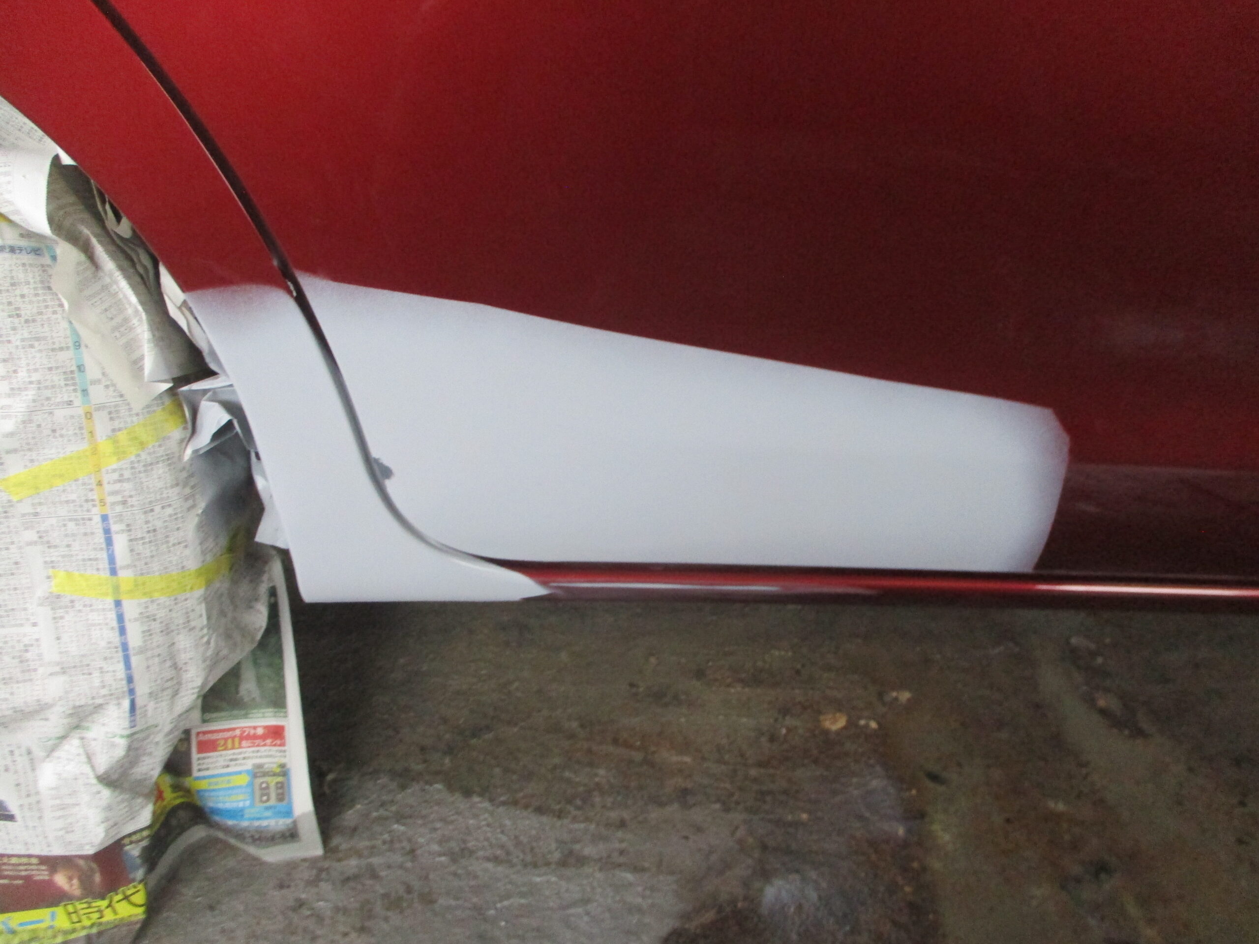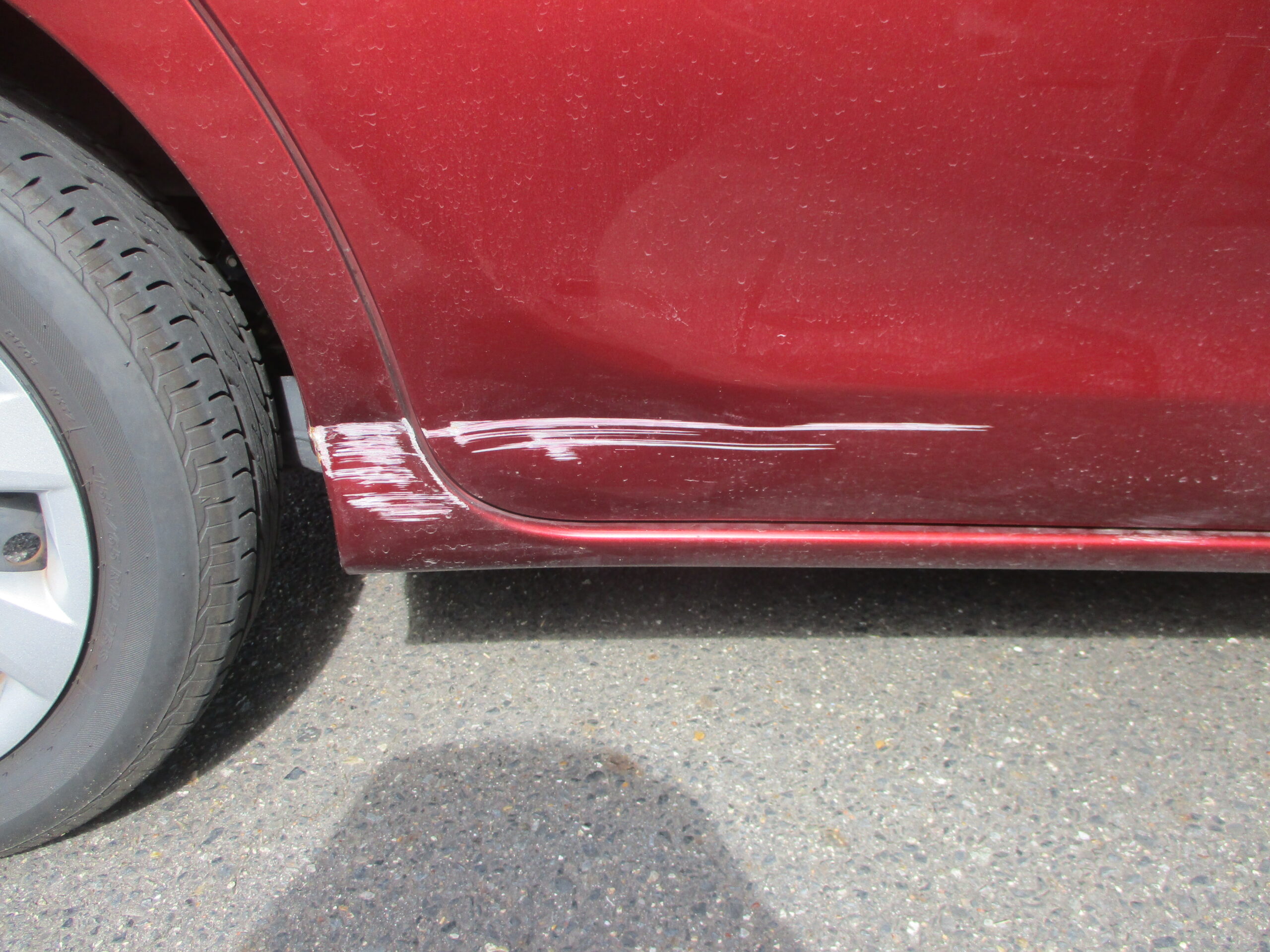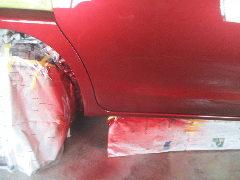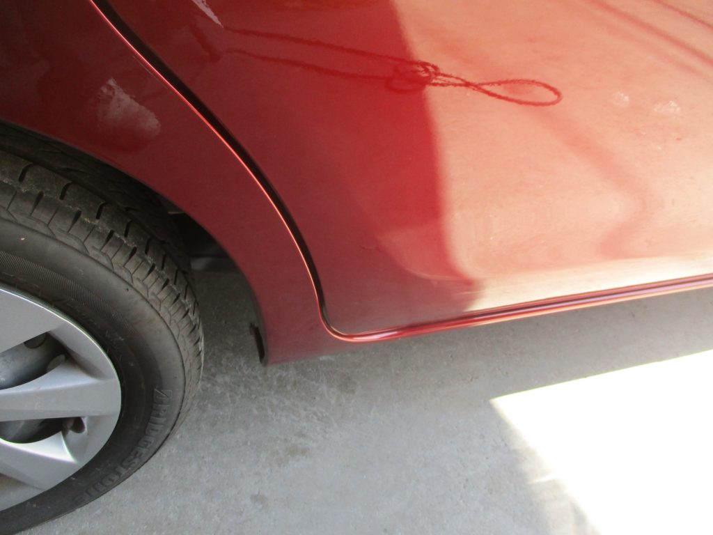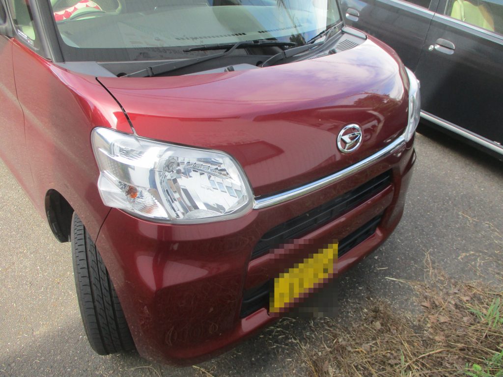 今回はタントの右のスライドドア下側から、すぐ後ろの右リアクォータをブロックに巻き込んで出来た傷ヘコミになります。当社の既存のお客様からのご紹介ですが、お値打ちに修理してほしいとご相談を受けました。流れとしてはお見積りをこちらから提示して、ご予約の日時を決めていただいてご入庫とされました。