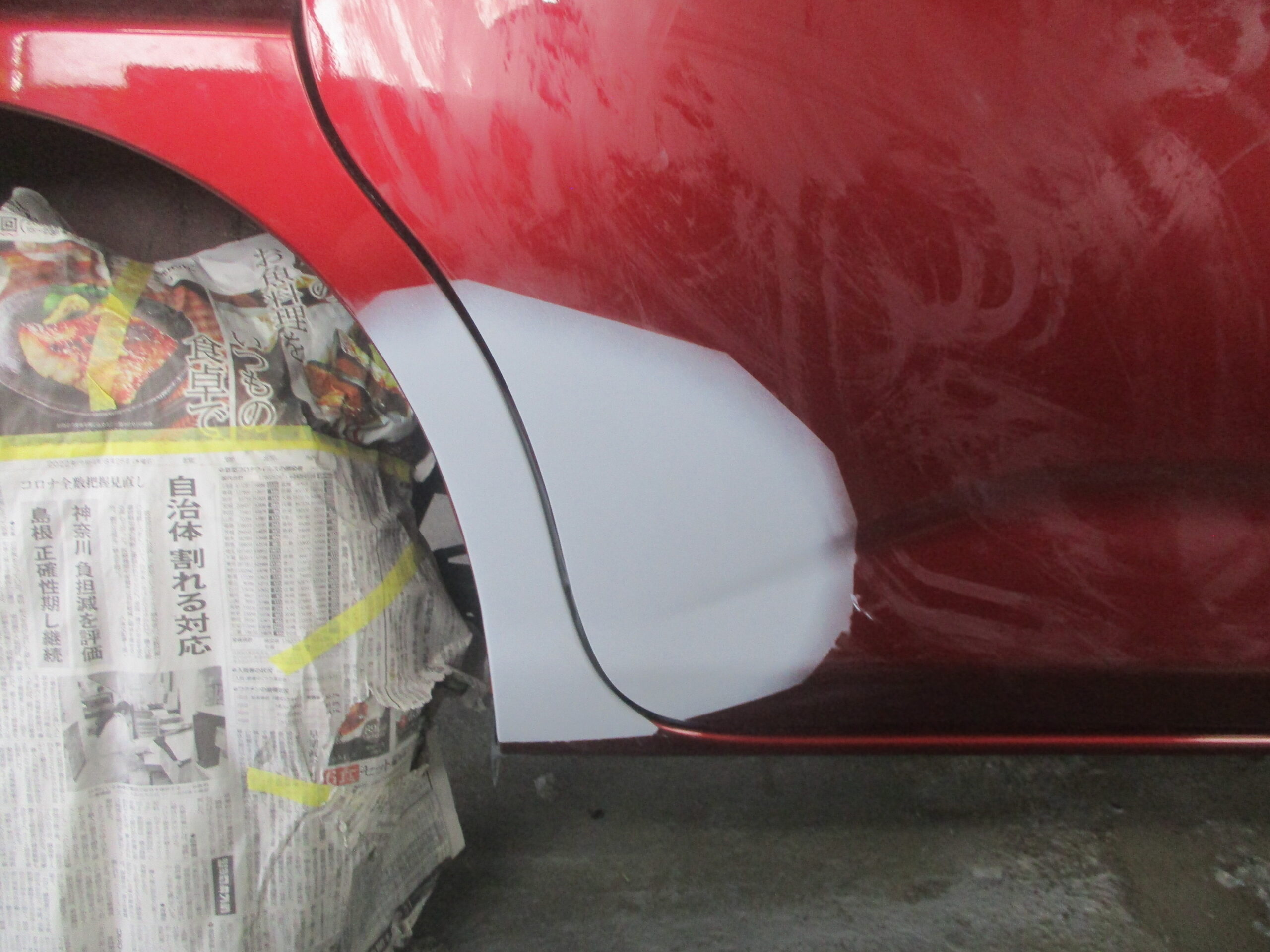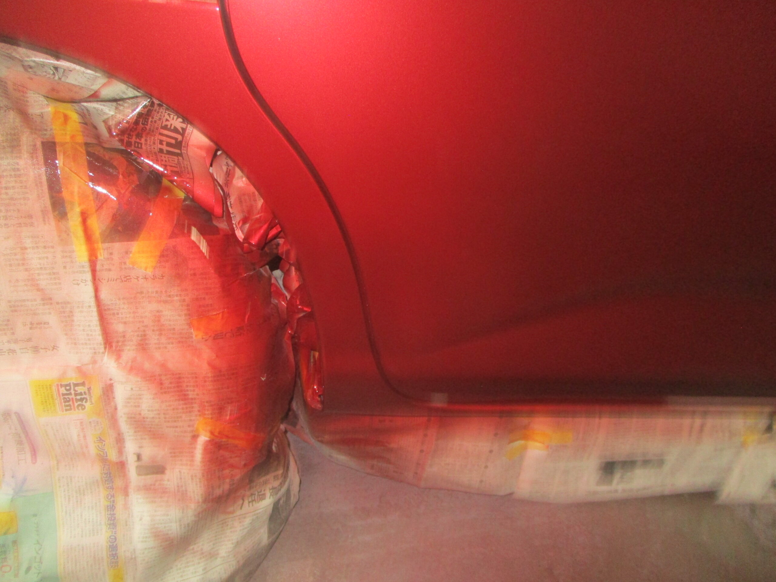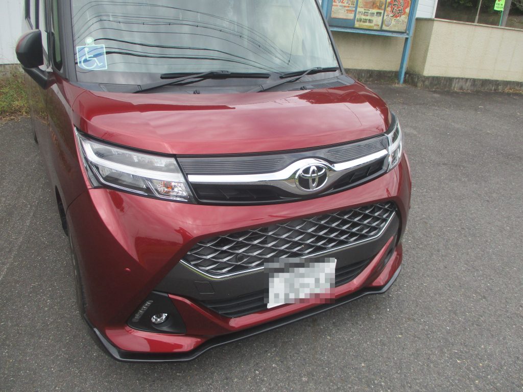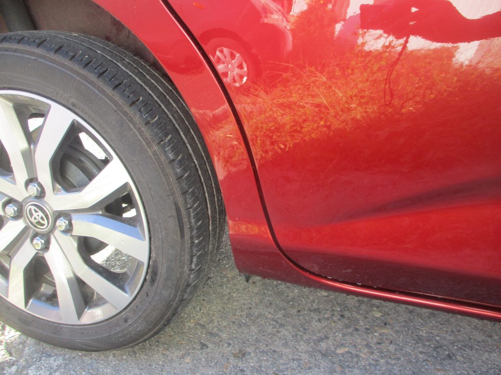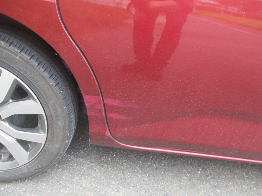 右のスライドドアと右のリアクォータをまたいで傷と凹みがあります。今はお客様の方で応急処置としてサビ止めで上からタッチアップしてあります。