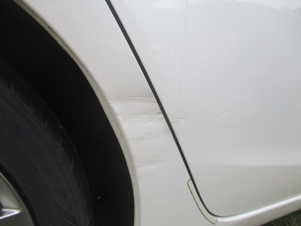 リアクォータ側に横に数か所ヘコミ傷が入っていて、リアドア側にも少しヘコミがあります。