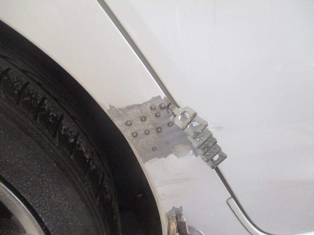アテンザの板金です。まず塗装を剥がして鉄板部分が出てきたら、そこに引き出すワッシャーを順に溶接して板金工具で引き出して、リアクォータとリアドアの高さをある程度揃えます。