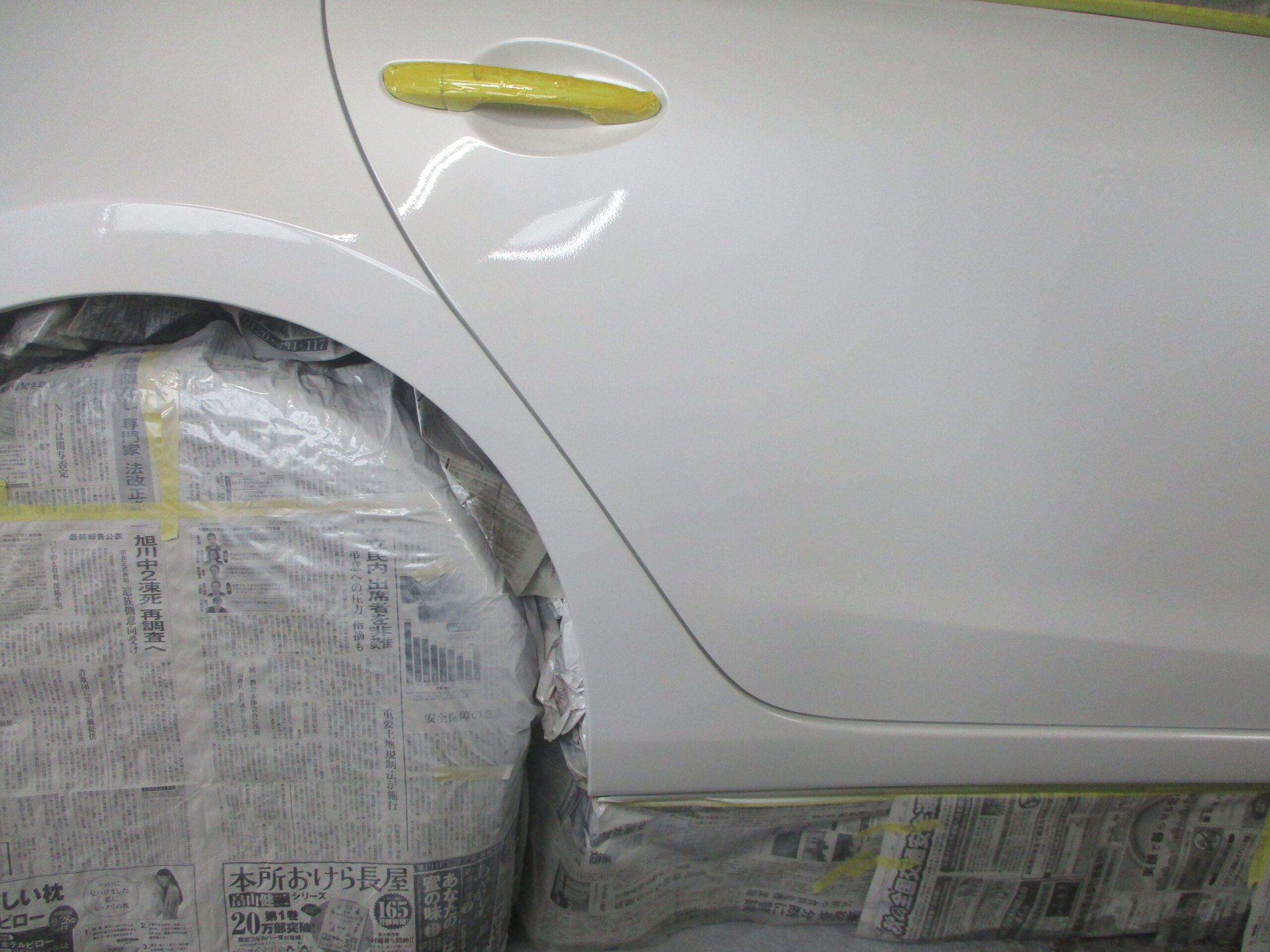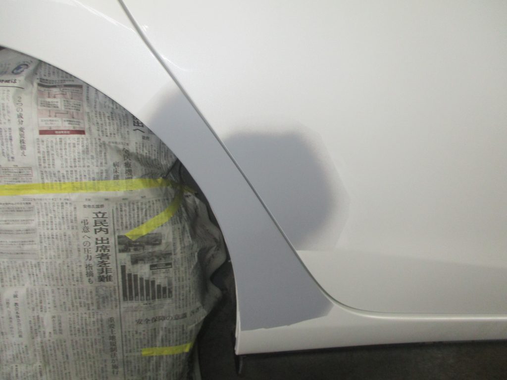 塗装後は一旦そのまま自然乾燥して、ヒーターで熱を加えて一気に乾燥させます。養生を剥がしたら最後に塗装した部分を綺麗に磨いてコンパウンドをしっかり拭き取ったら修理完了です。