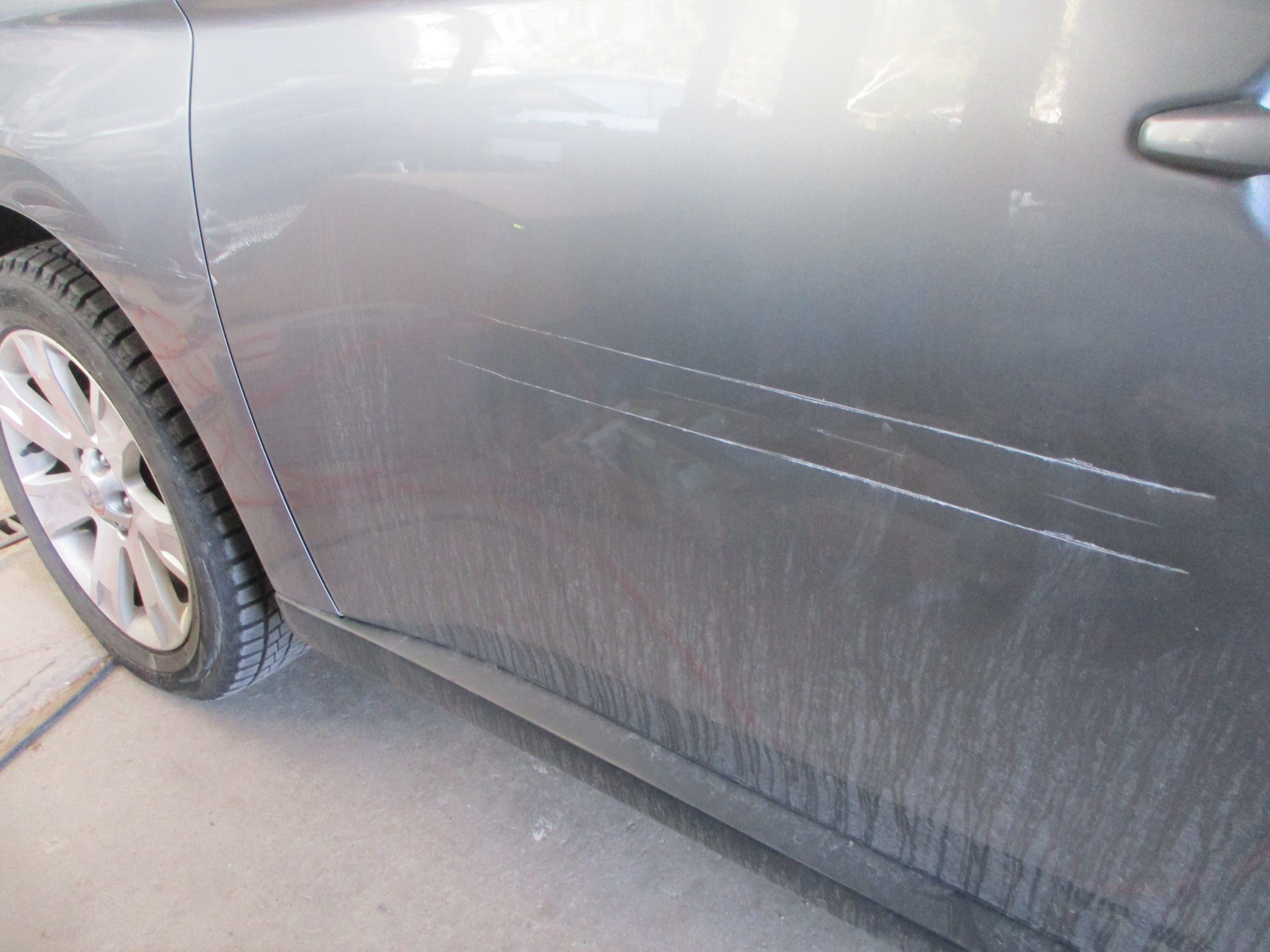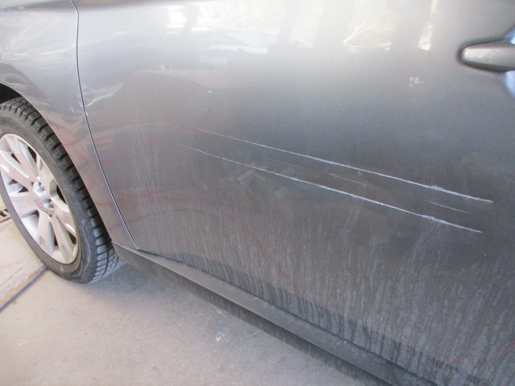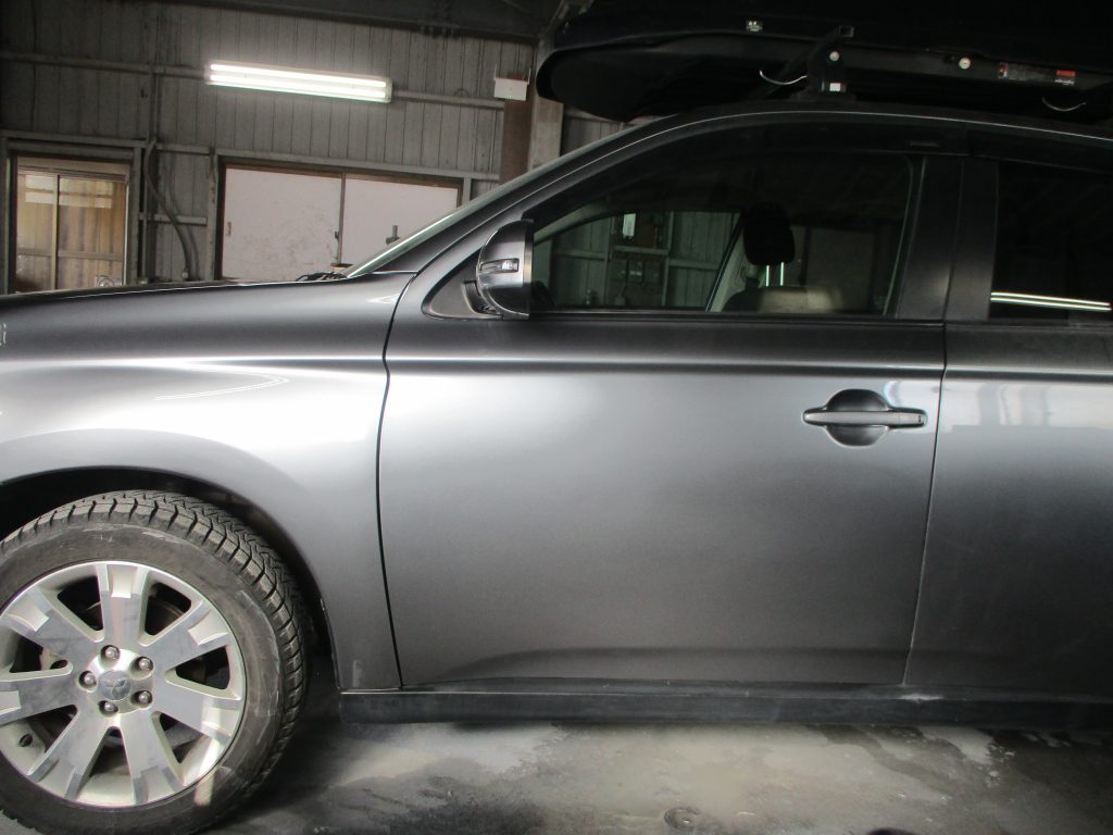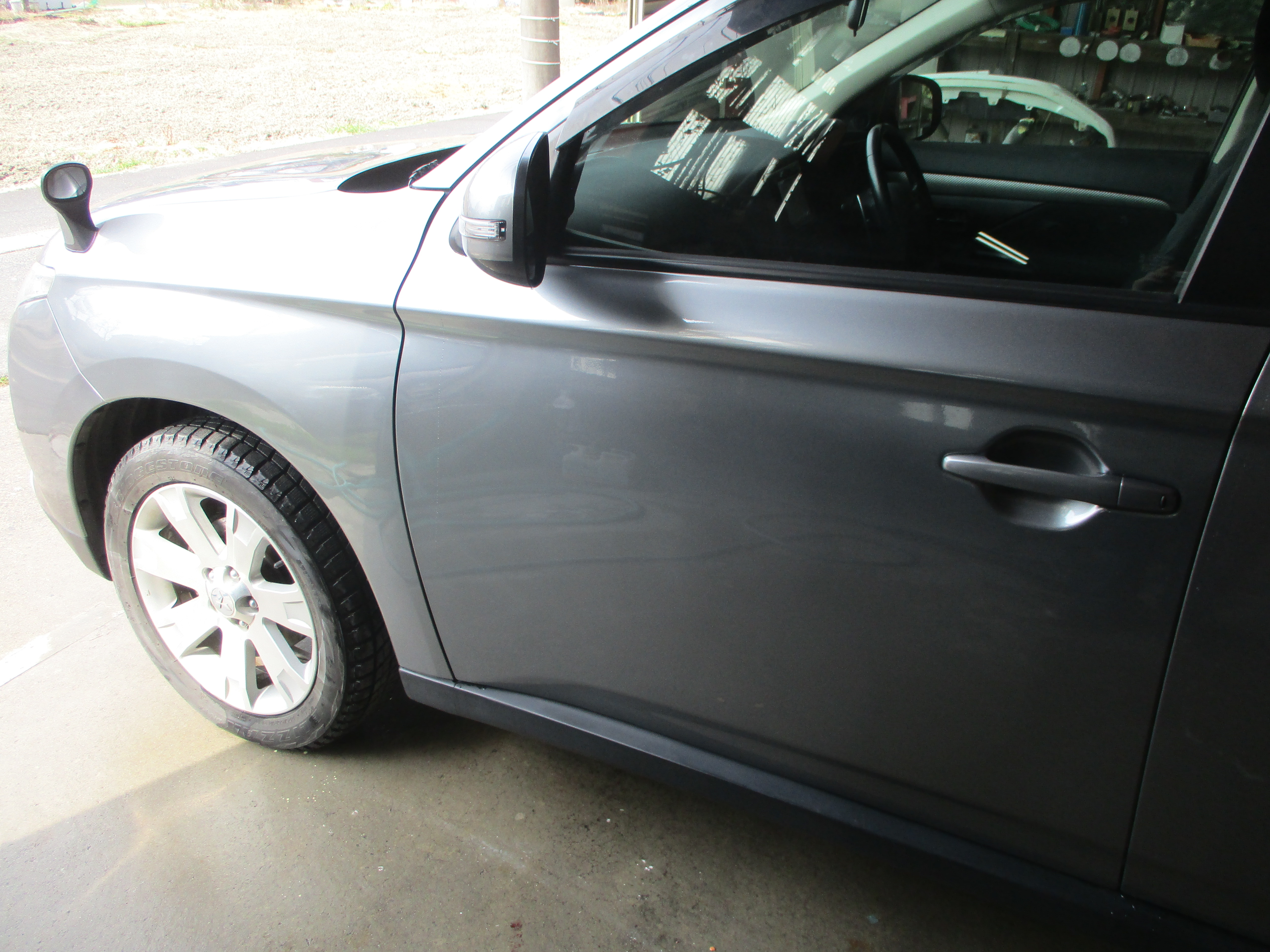 ネットで検索して当社のHPから見積もりのお電話をいただきました。今回は出張見積で対応しました。アウトランダーのフロントフェンダーの方に小さいキズヘコミがあって、後ろのフロントドアは20センチぐらいの二本のヘコミがあります。ドア側は鉄板が伸びていそうでしたのでラインが作れるかがポイントになります。