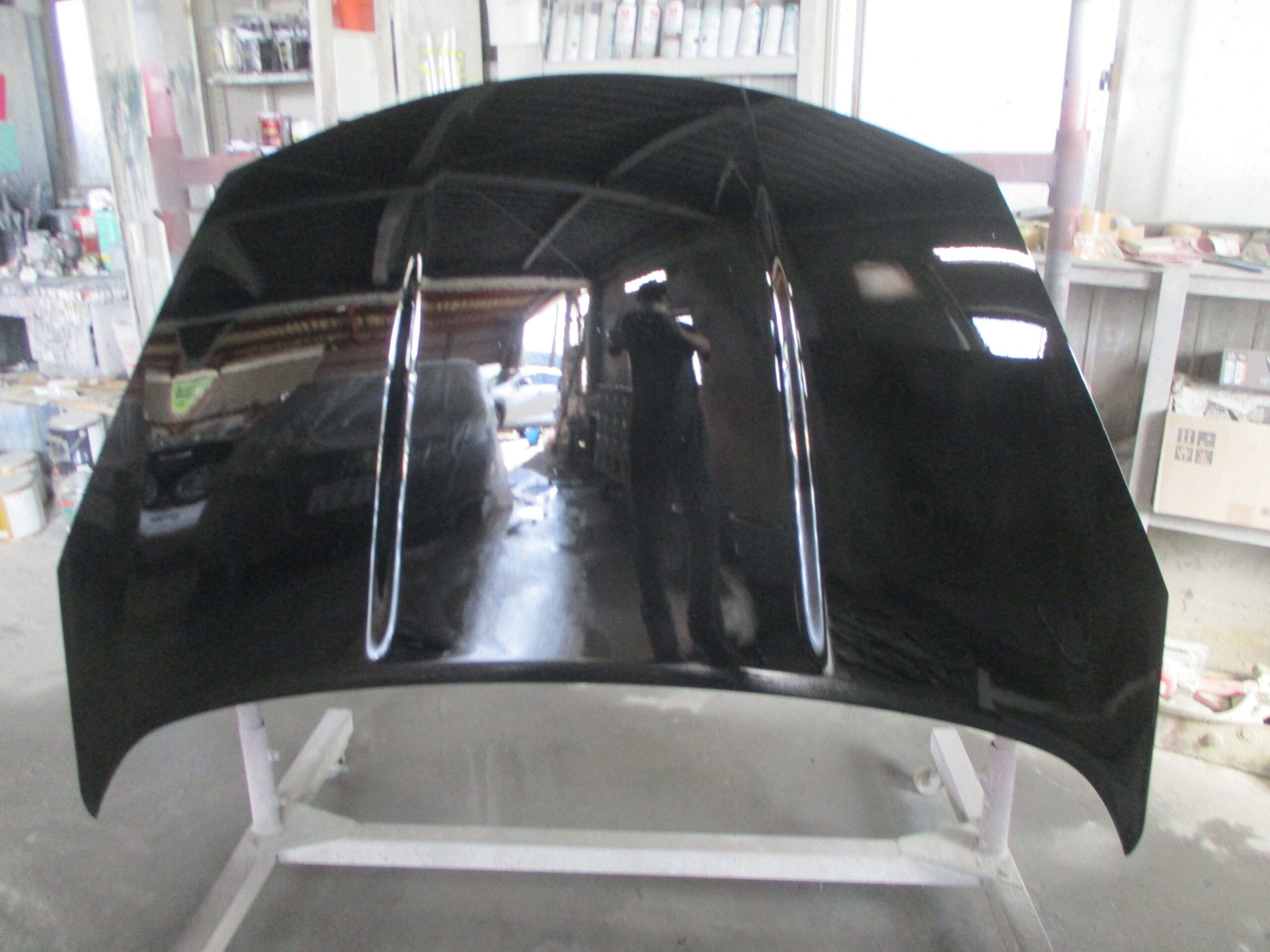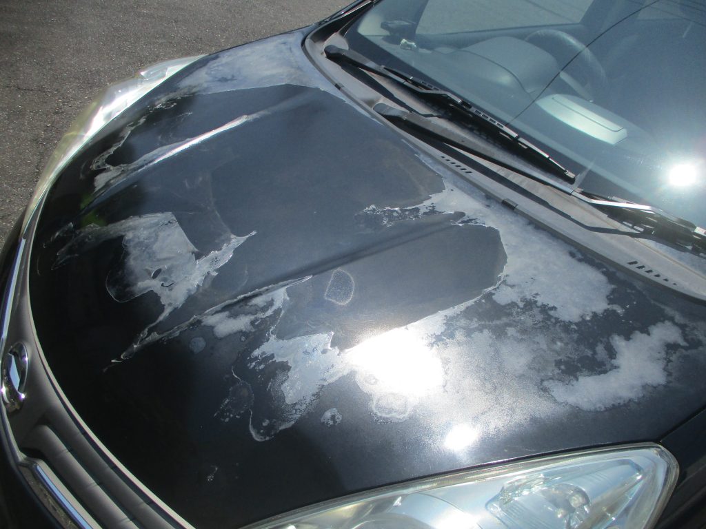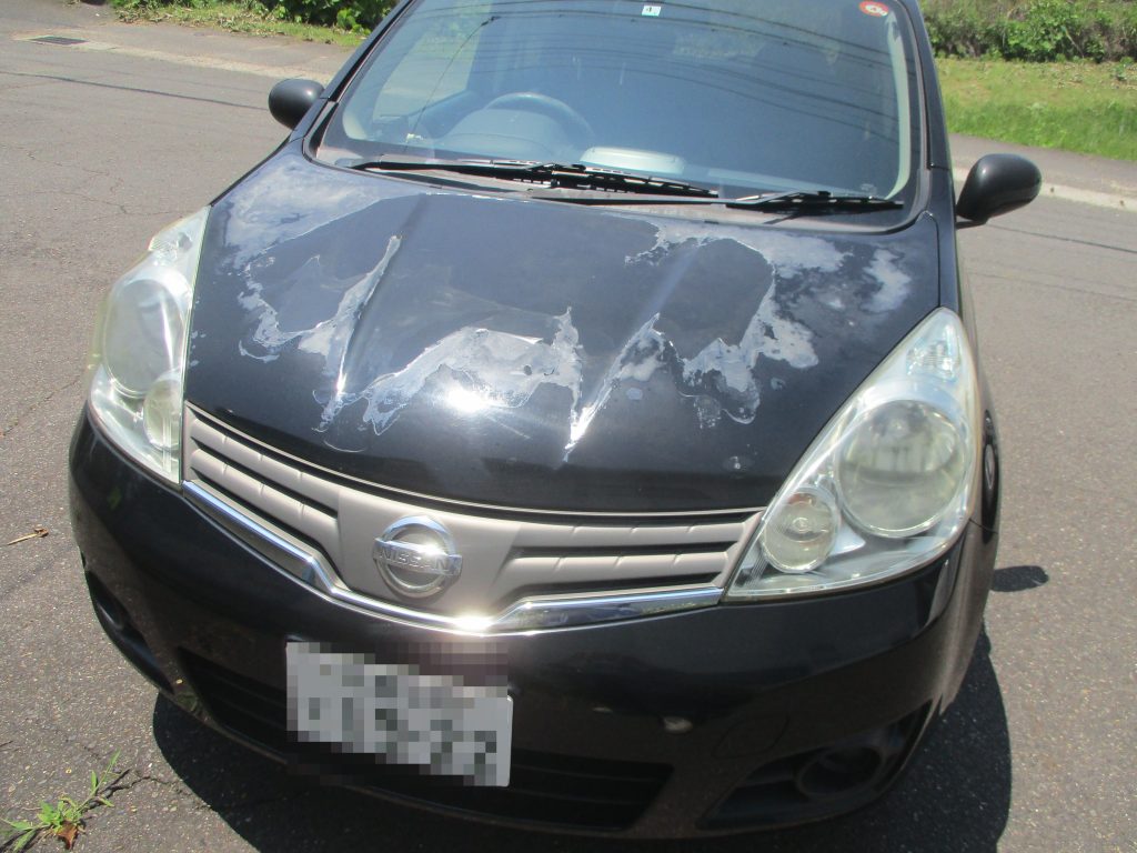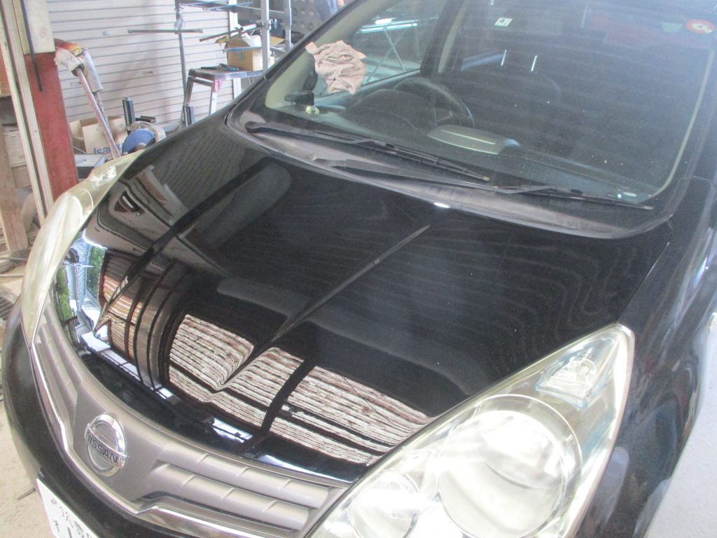 ノートのボンネットが経年劣化でクリヤー塗装が下地から離れて、所々が白くボヤけた状態になっています。どうしても普段から屋根無しで駐車してると劣化が早いです。インターネットで検索してからお電話をいただきました。ご来店していただき、お見積りと作業内容をご説明して後日ご入庫となります。