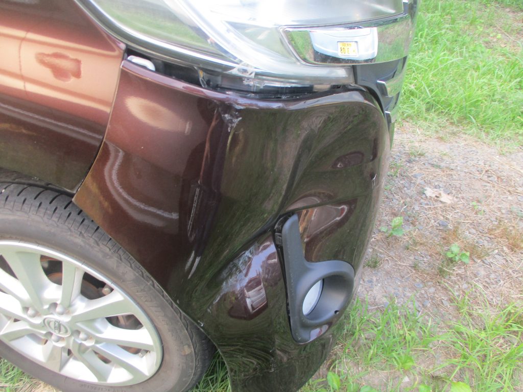 フロントバンパーの右側がボコッと大きく凹んで押し込まれた様子です。凹んだ影響で横のフェンダー寄りの部分が浮いています。今回はこちらの見立てで修理出来そうでしたので部品交換ではなく修復で受けました。