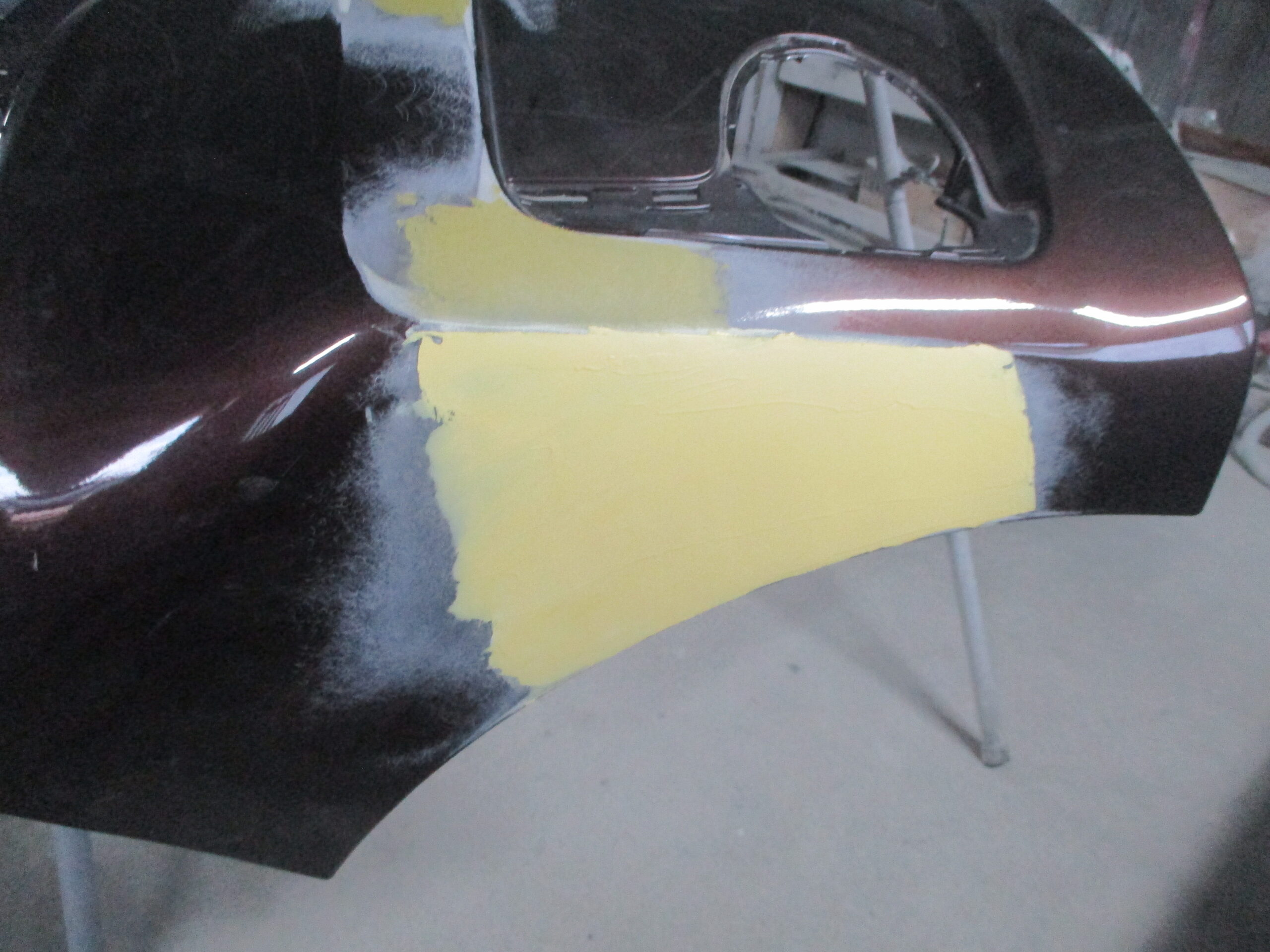 パテの次にサフェーサー吹いて下地修理が出来たら、ルークスの塗装になります。最初にカラー番号を調べて配合表から原色の数種類を選んでベースの色を作ります。そこから色合わせをしていき、最終的な色を作ったらルークスのフロントバンパーに塗装します。