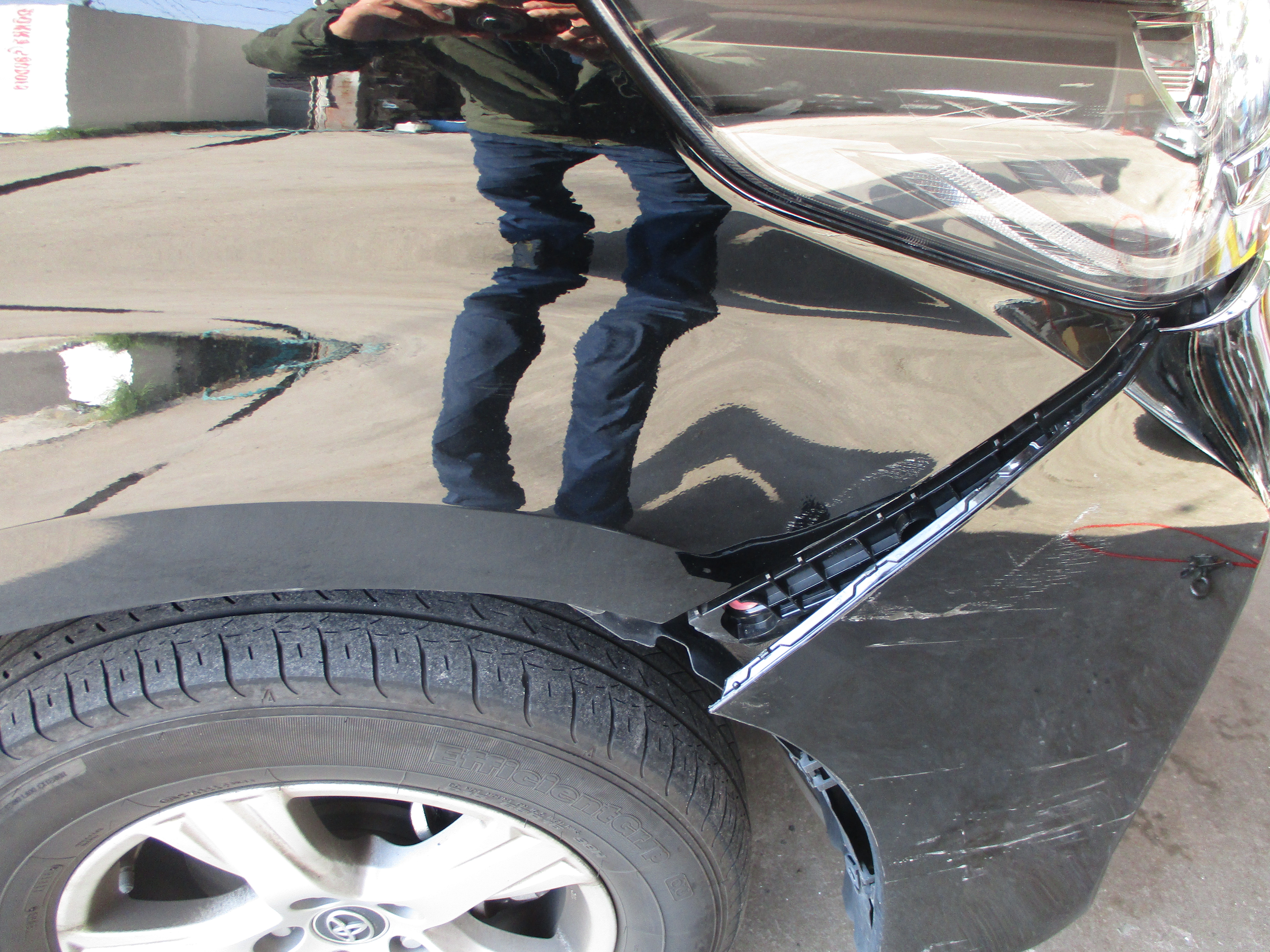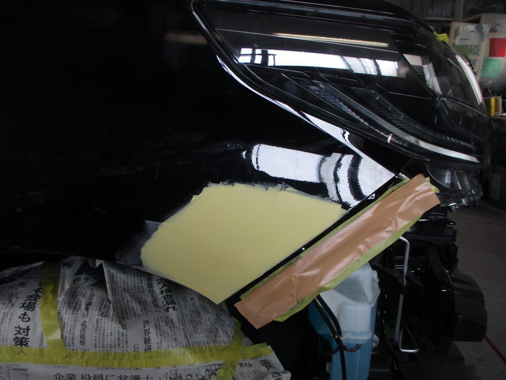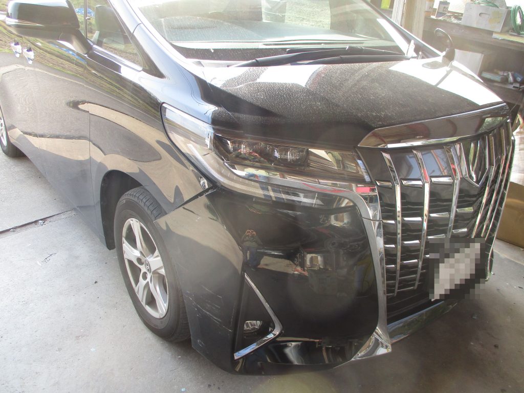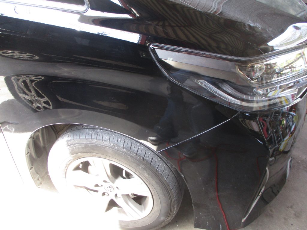 フロントの左側のコーナーが損傷していてバンパーは衝撃の反動で横に浮いてます。フロントフェンダーはバンパーとの境目辺りで凹んでいて細かい歪みもあります。さらにヘッドライトの横の取り付け部分が取れていました。ヘッドライトは補修で直します。