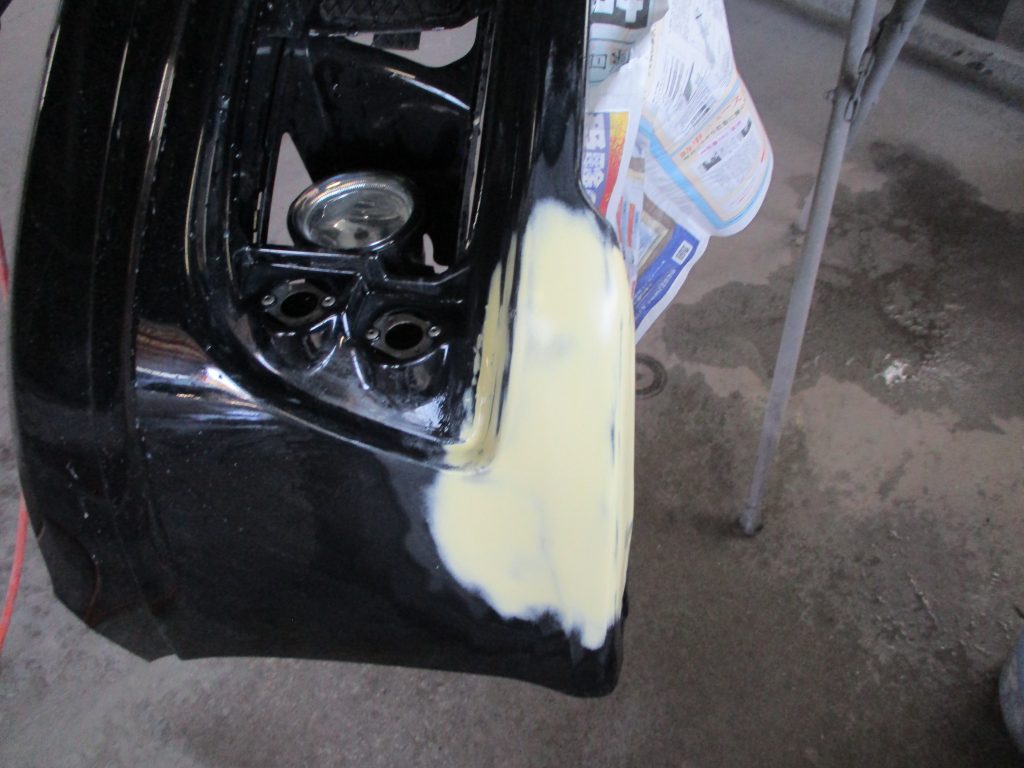 補修するのにボディーに付いたままでは直せませんので、まずバンパーを外しフォグカバーと補修付近のライトを取り外し、亀裂の補強するために電熱ピンを何個も裏から溶かし込み取れないように、ガチガチに固定します。次に表に付いているお客様が塗られたパテを全て削り落とし、こちらのパテで新しく再度塗り込み形を成形していきます。