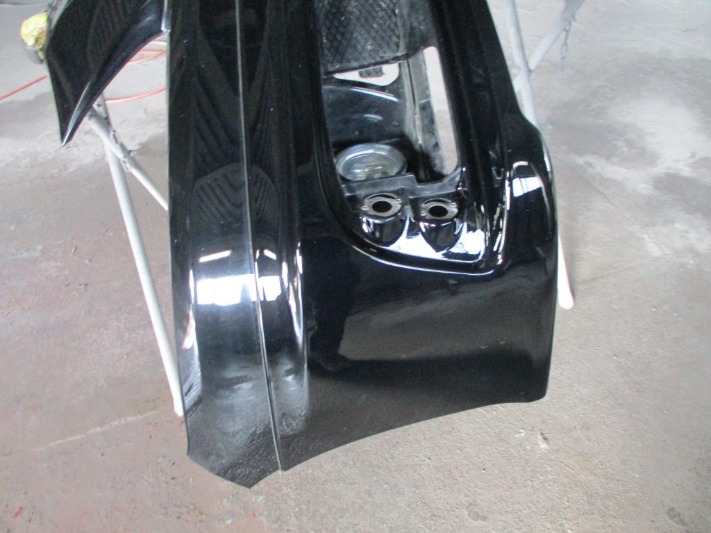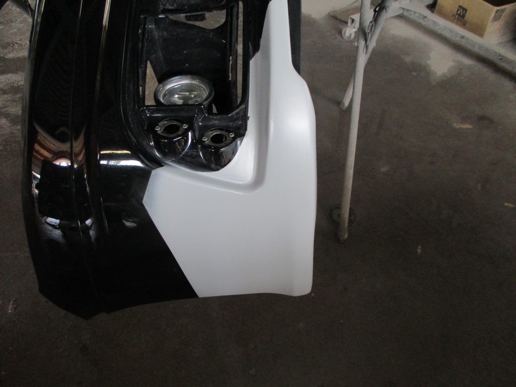 ある程度の形が整い歪みのない状態が出来ましたら、サフェーサーを吹き付けてしっかり乾燥させたら水研ぎペーパーで研いでいき塗膜が滑らかになるまで仕上げます。そしてフォグカバーも一度仮合わせして隙間の状態も確認して均一に揃いましたので、これで下地処理が終わりましたのでカラー塗装に移ります。