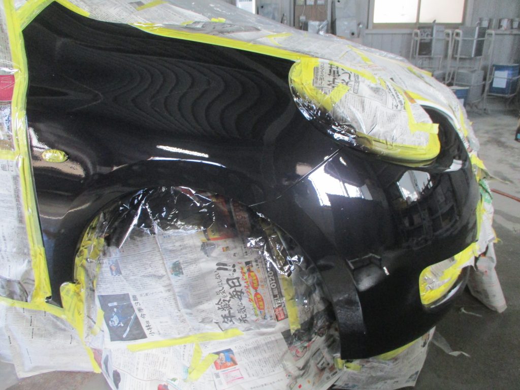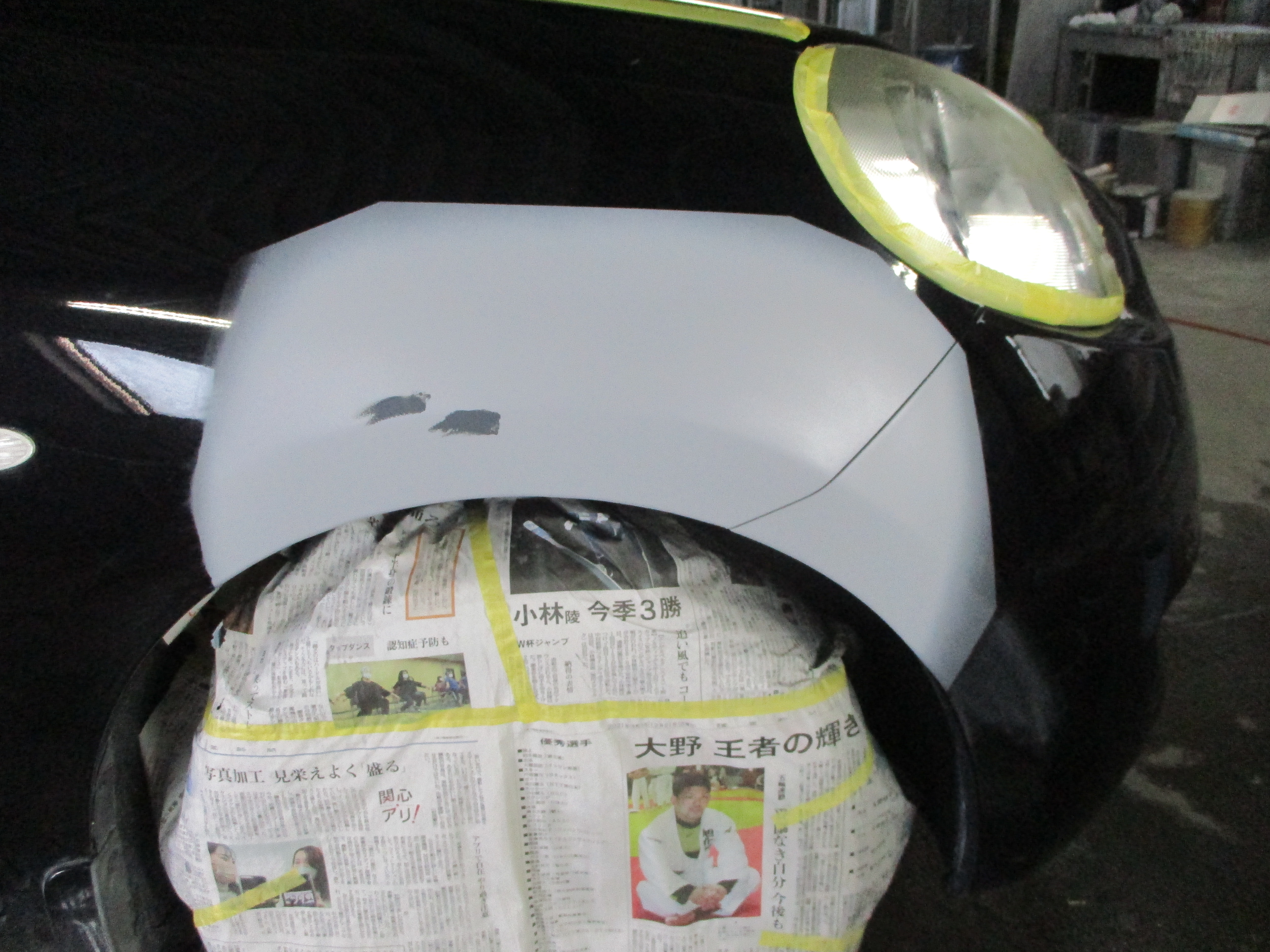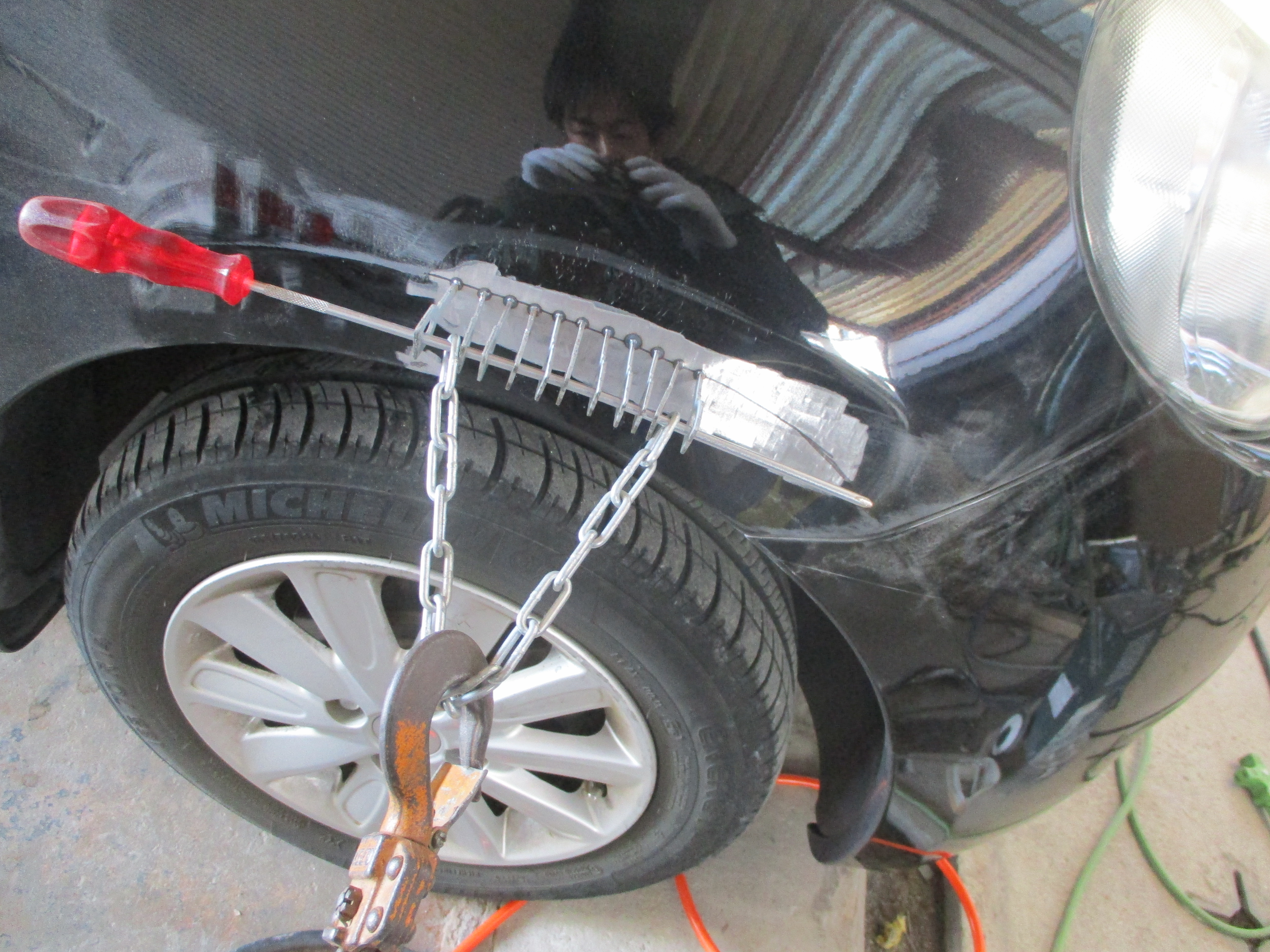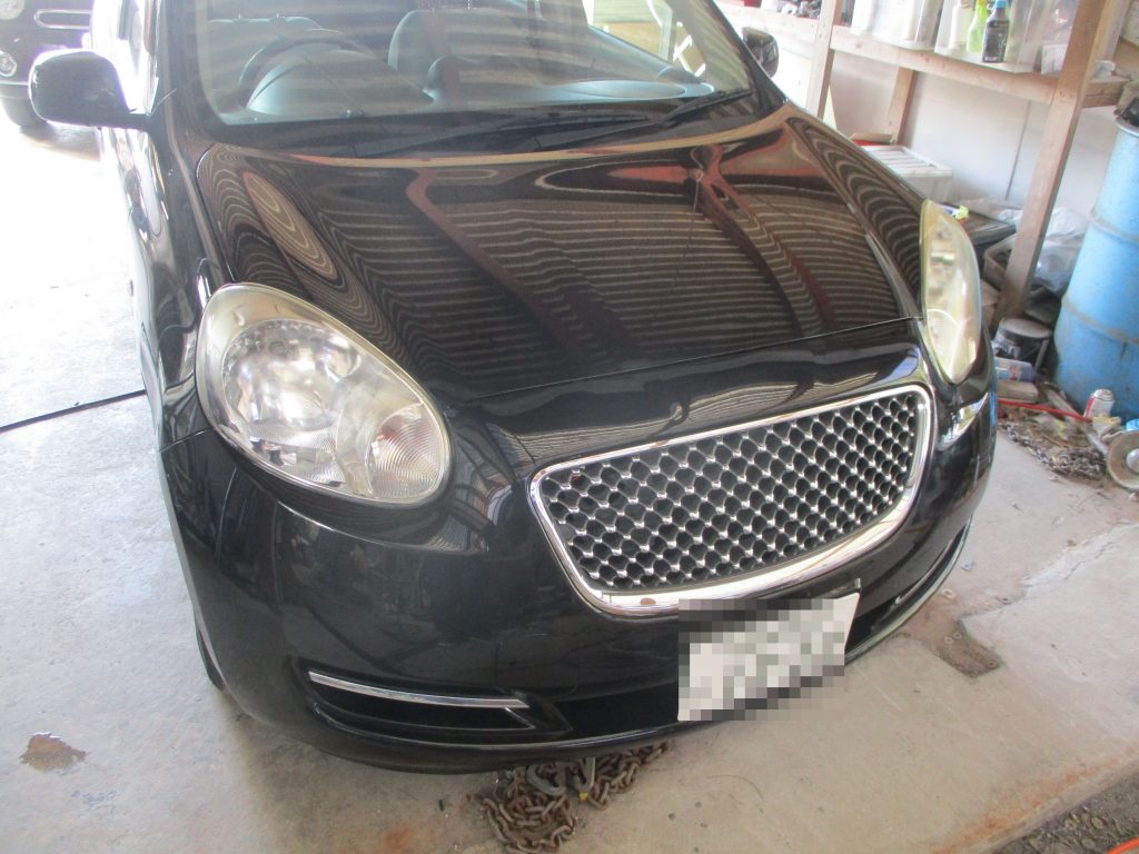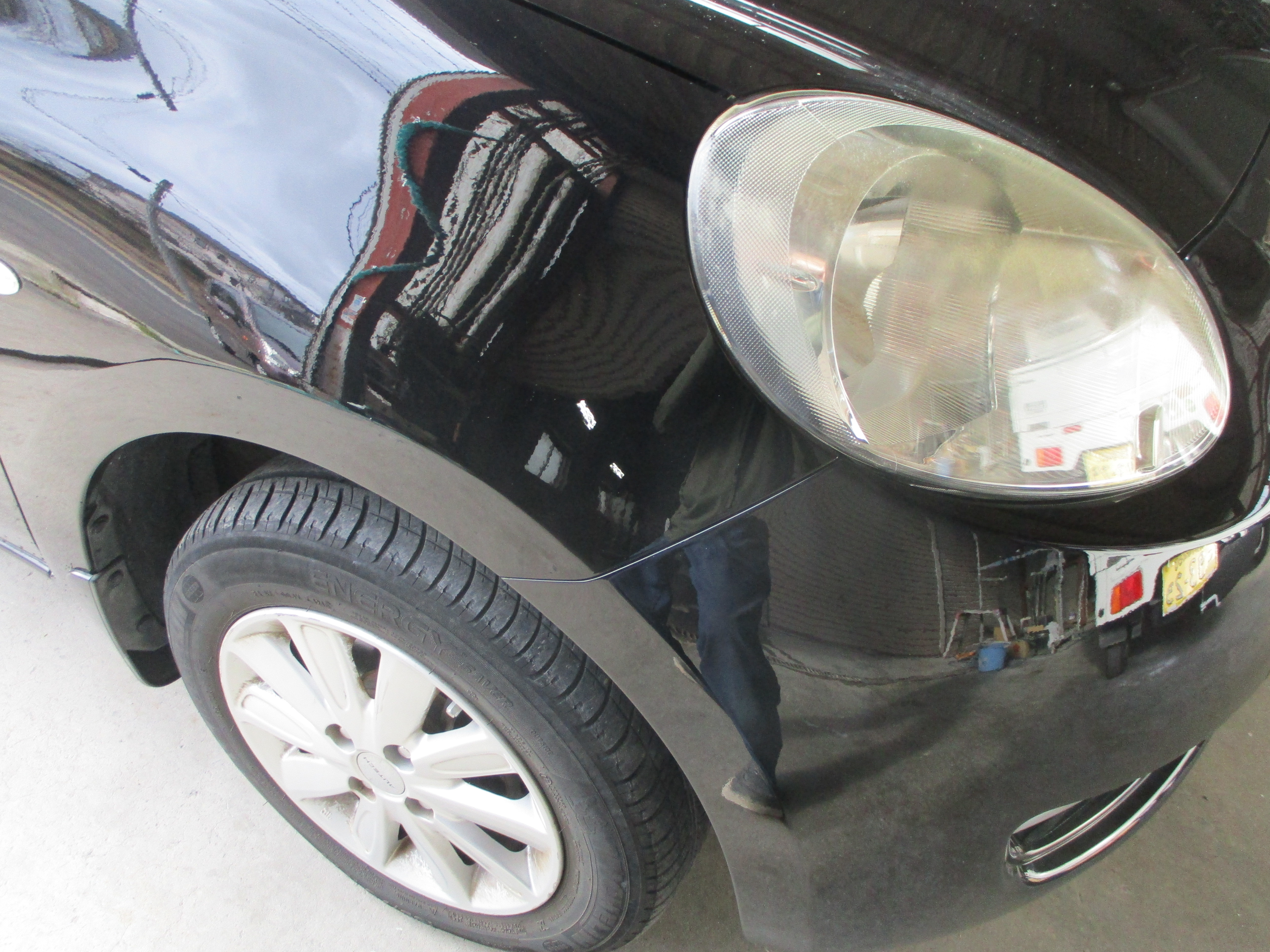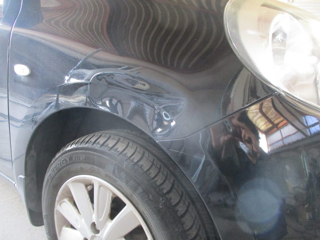 マーチのフロントフェンダーの下側のアーチしてる部分が潰れて凹んでいます。フロントバンパーの方もまたいでキズがあります。当て逃げとの事でしたので、なるべく予算抑えた修理を提案させていただきました。今回も部品を交換すると高額になってしまいますので板金修理での対応となります。