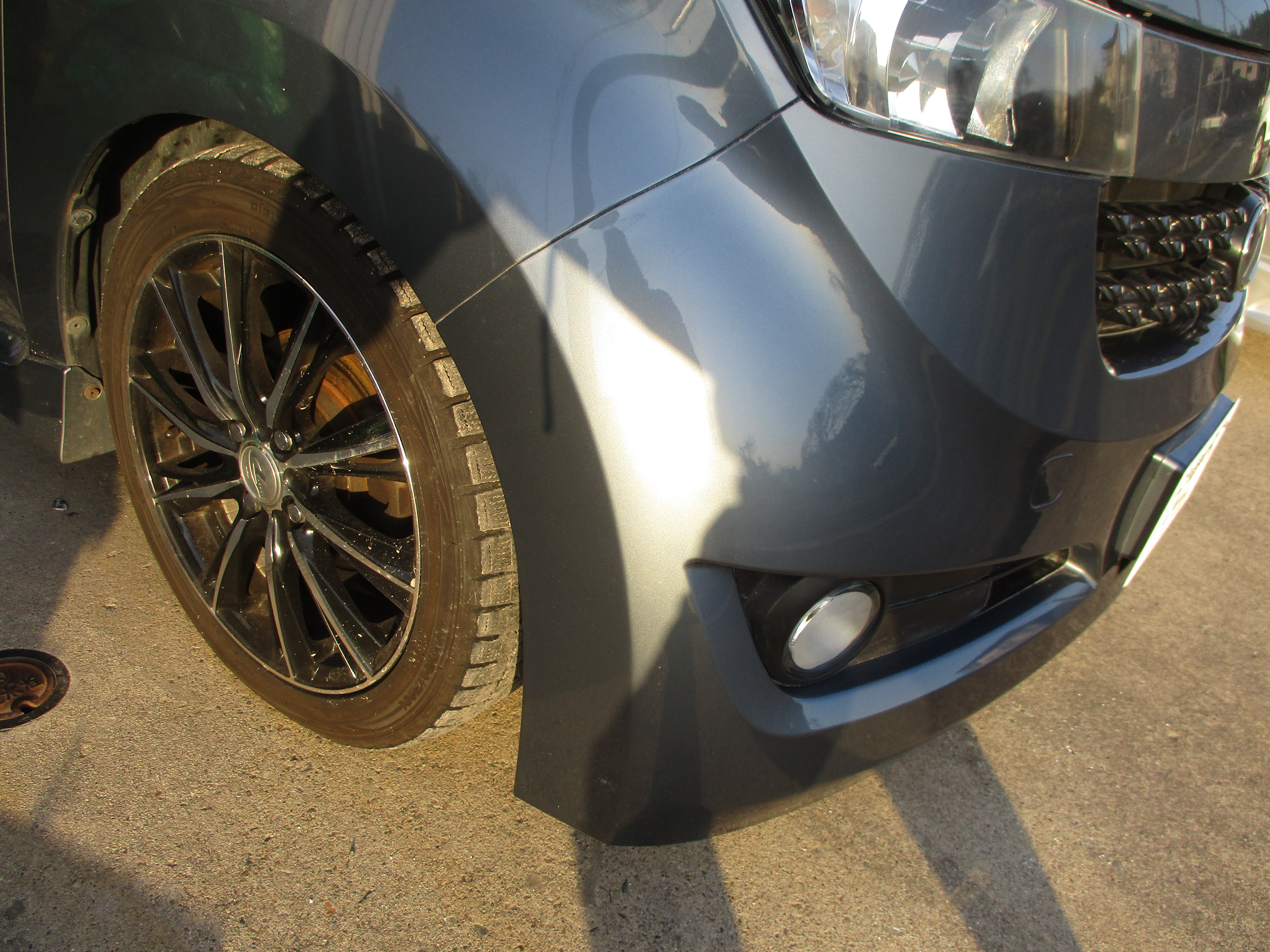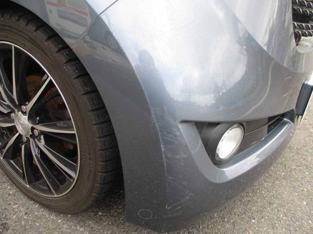 フロントバンパーの右側の角のライン辺りに縦に15センチ程擦り傷があり、こちらでの見積りをした段階でお相手との示談が済んでいましたので後日入庫となりました。