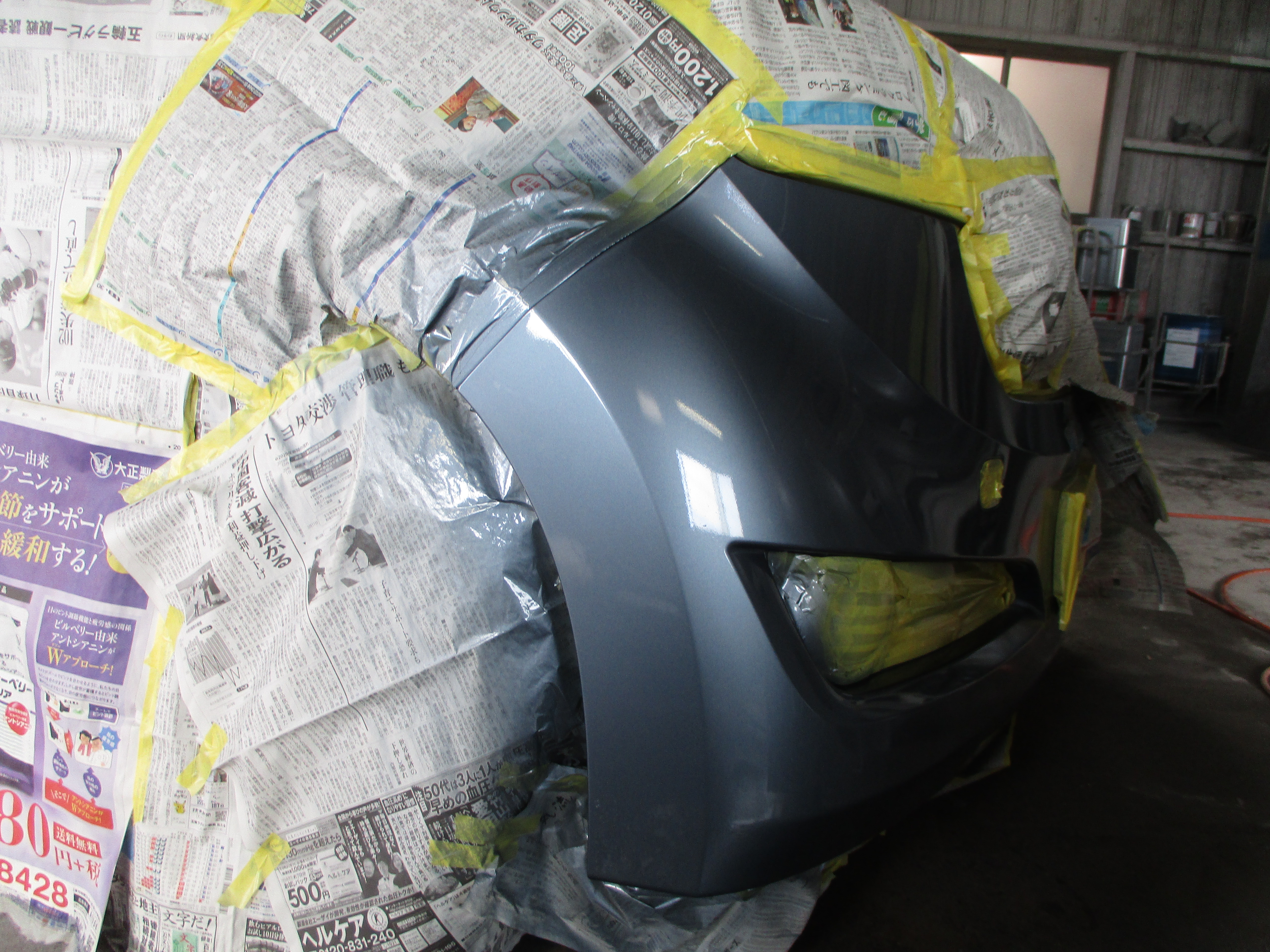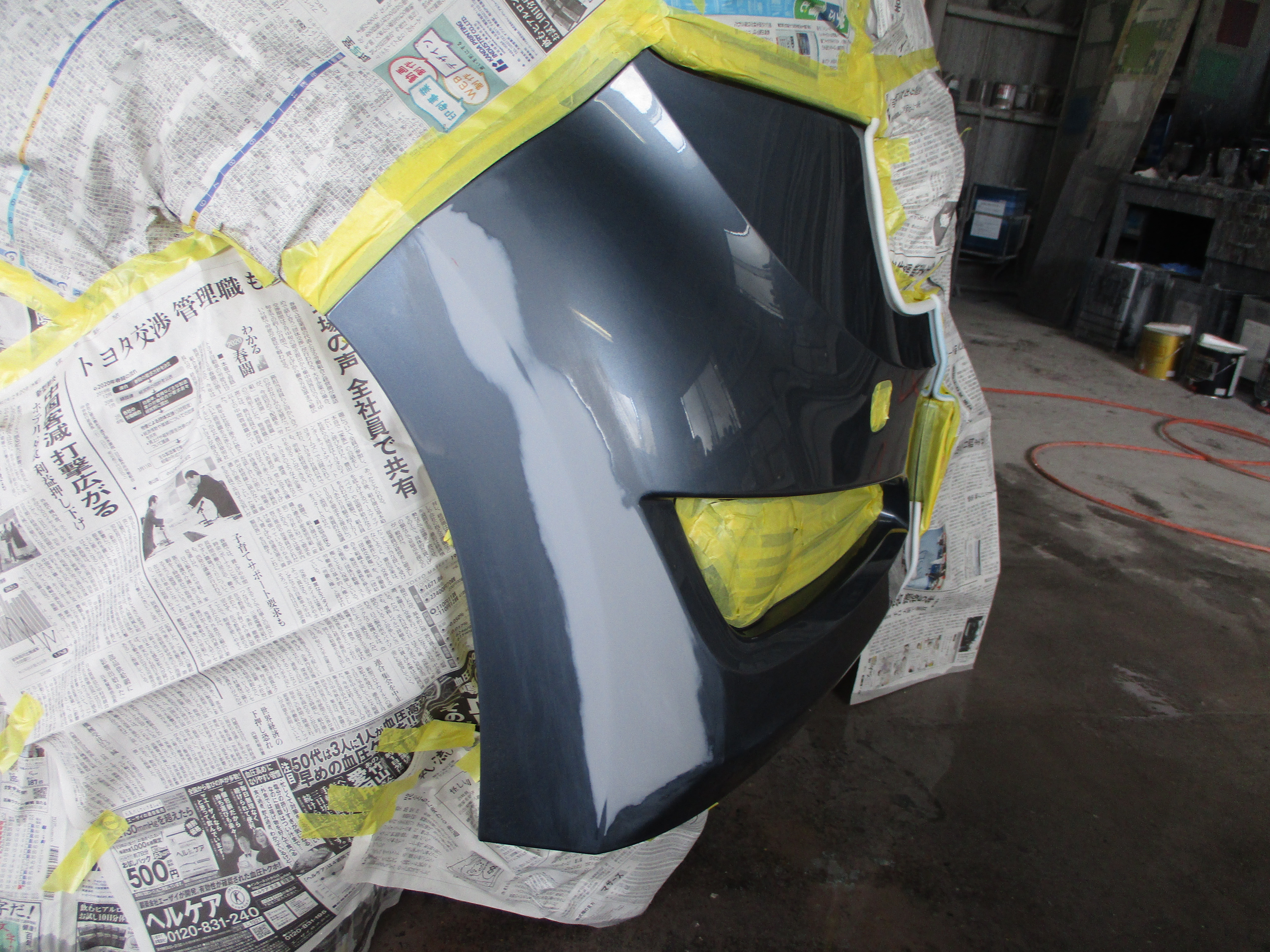 塗装の工程に入ります。最初にカラー番号を車体から調べます。調べたら配合表で原色の割合を見ながら細かく塗装する色を作り、何度も合わせ調色します。色が出来た後はバンパーにスプレーガンで吹き付け塗装をして色を染めていきます。