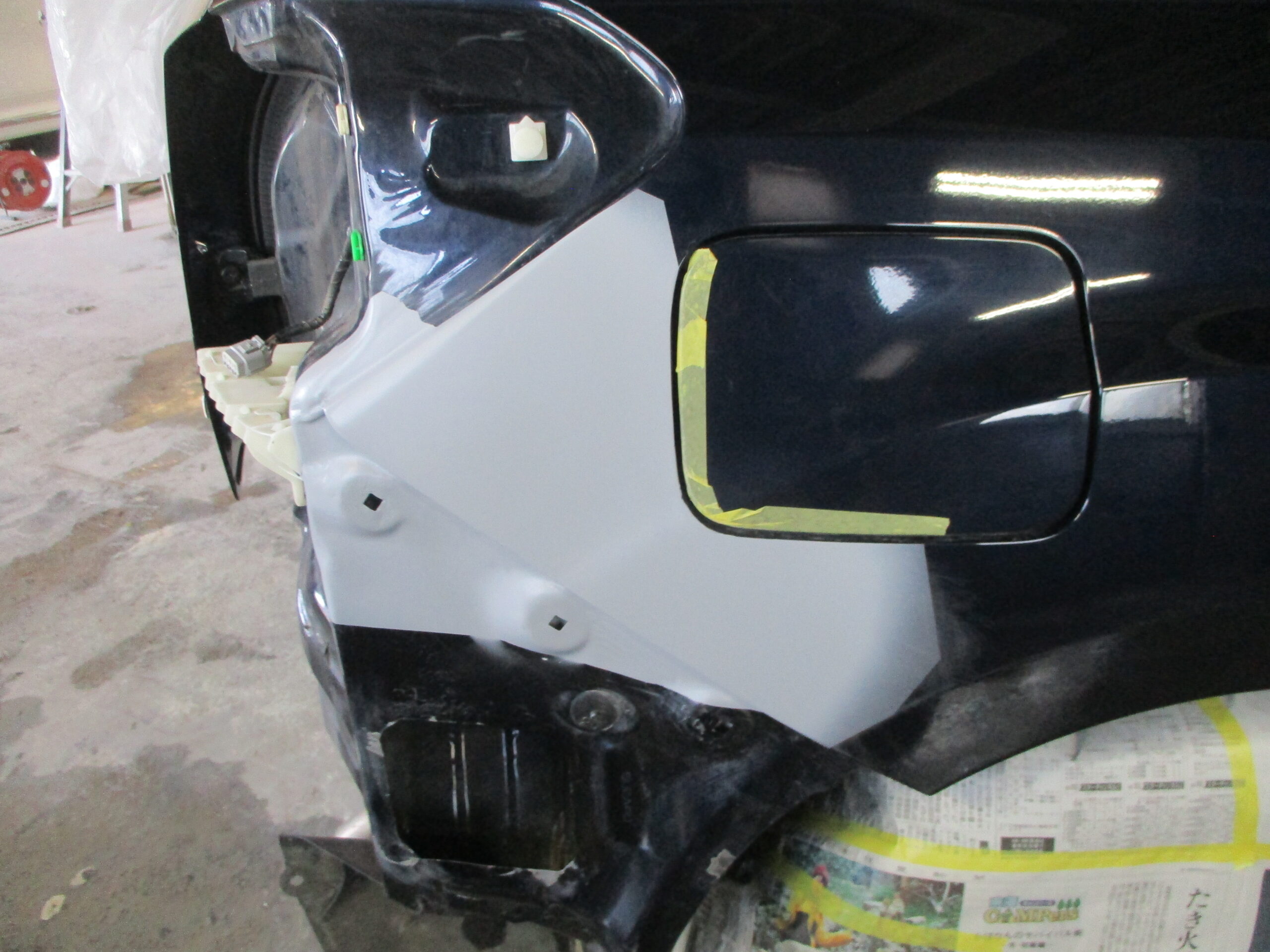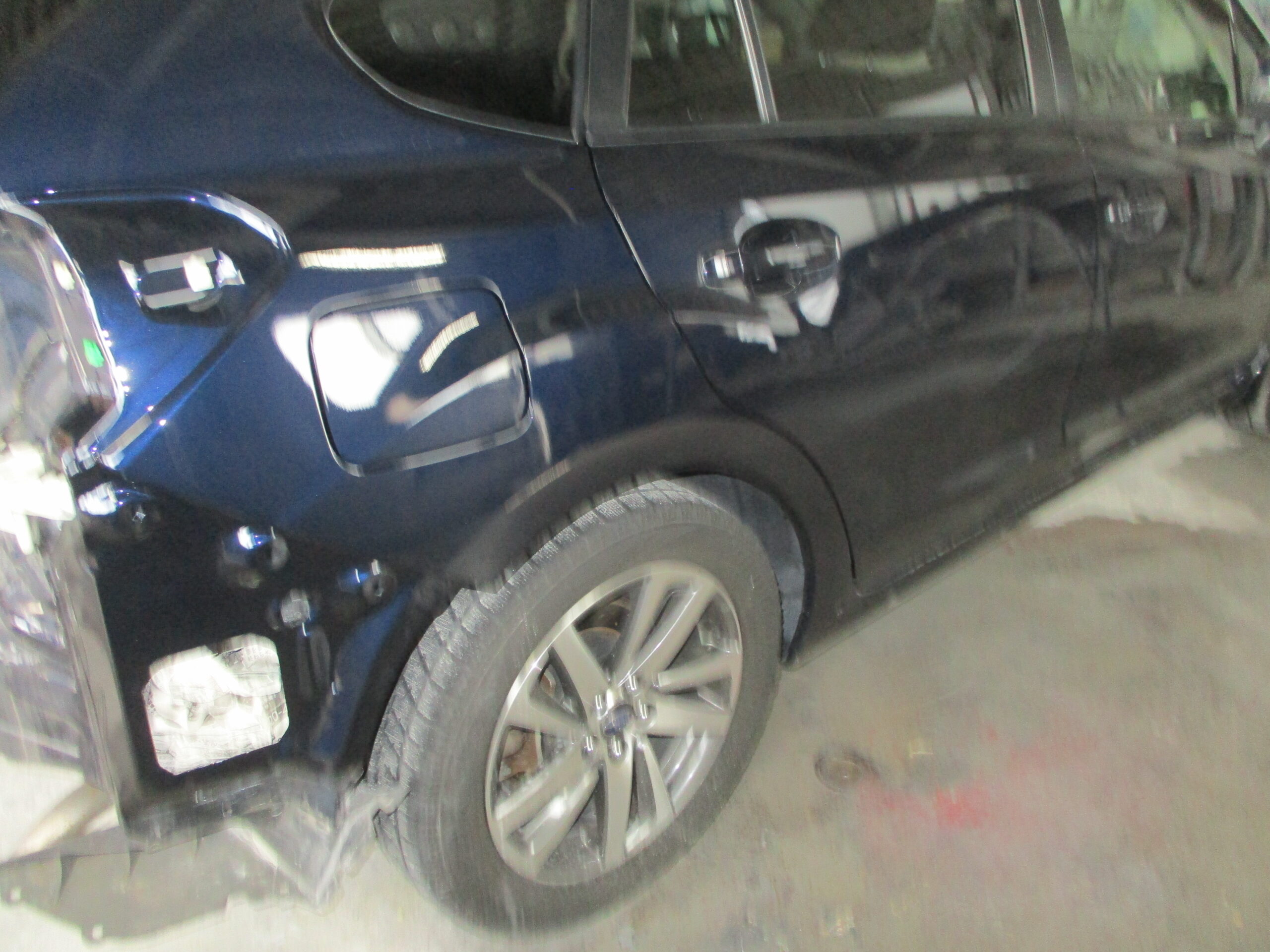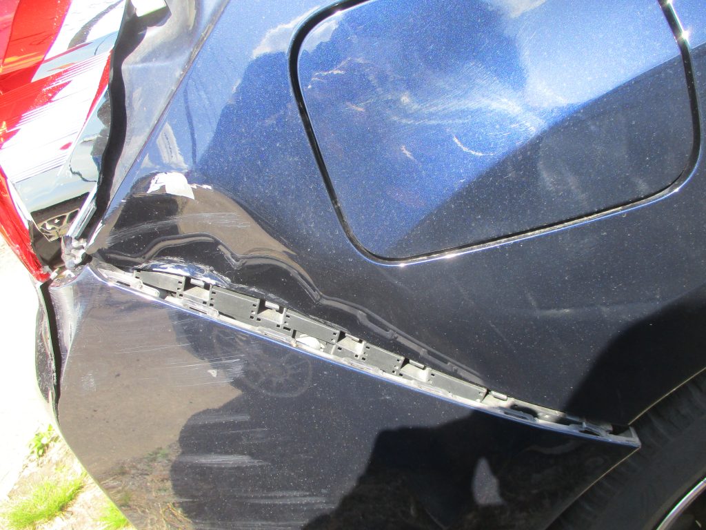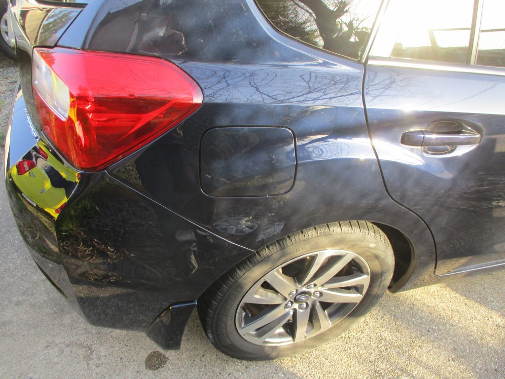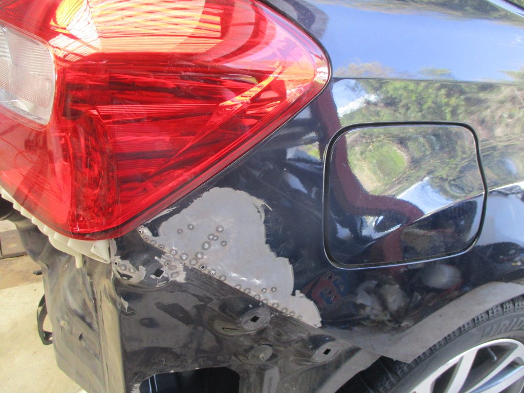 右のリアバンパーと右リアクォータの境目辺りで損傷していてリアクォータ側は特に深く凹んでいます。テールランプも表のレンズ部分が割れていて、こちらはリサイクルパーツで交換となります。