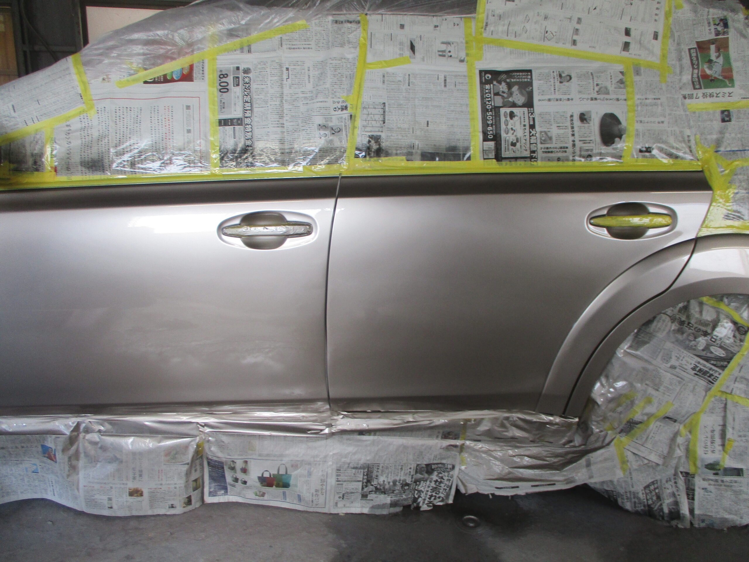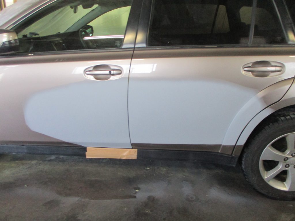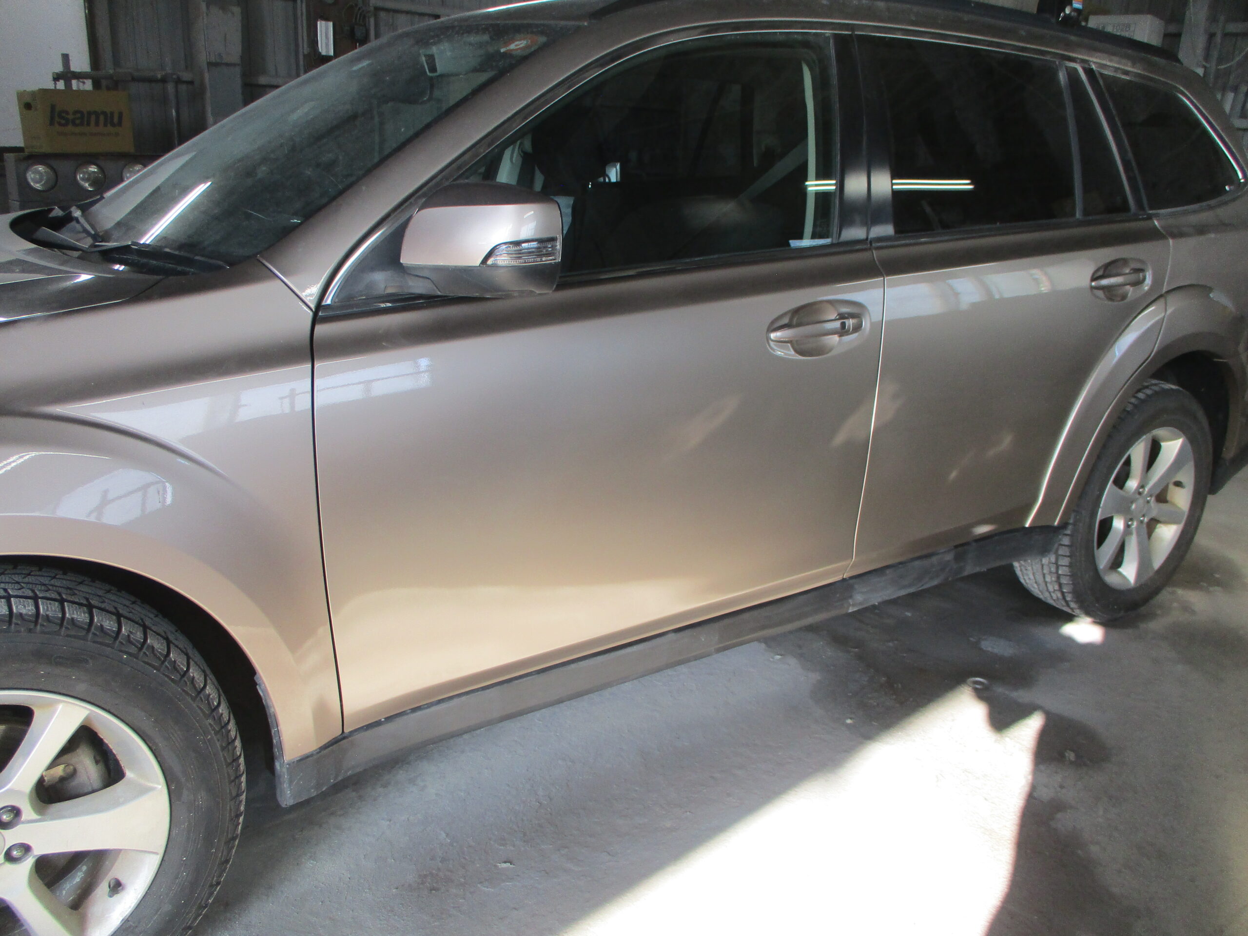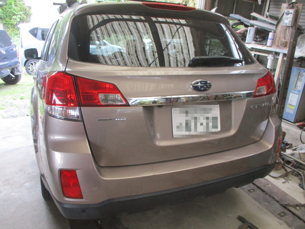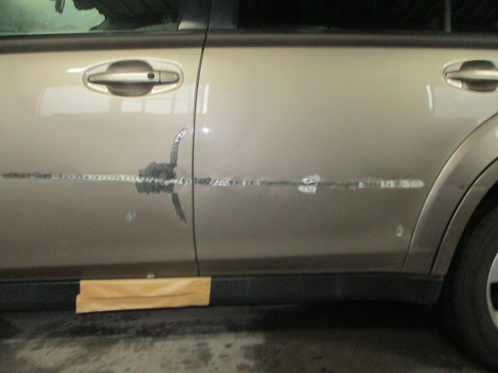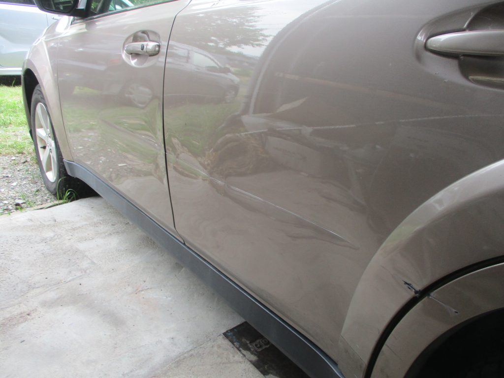 春日井市のお客様からスバル・レガシィアウトバックの左フロントドアと左リアドアのキズ・ヘコミの板金・塗装のご依頼をいただきました。