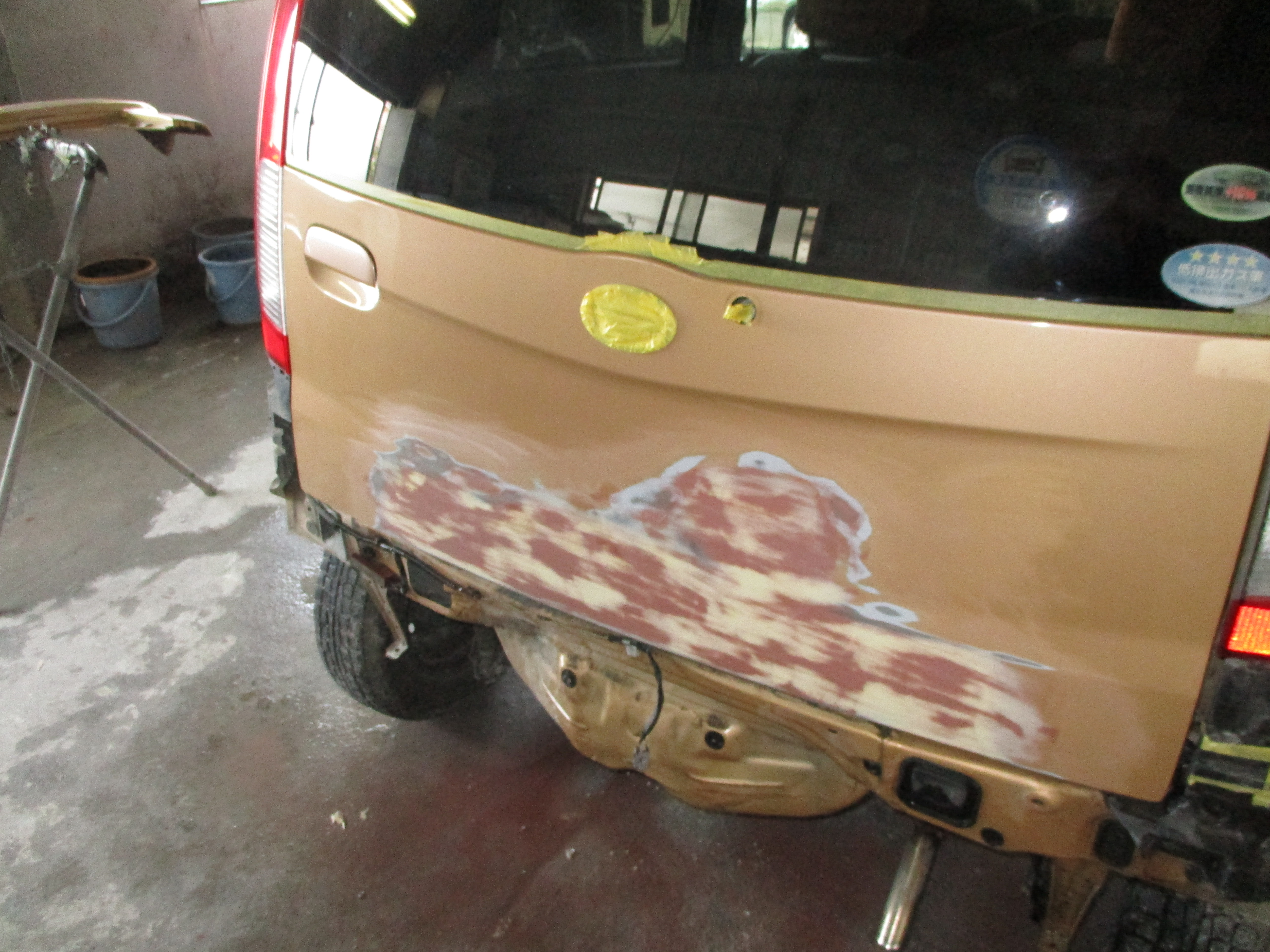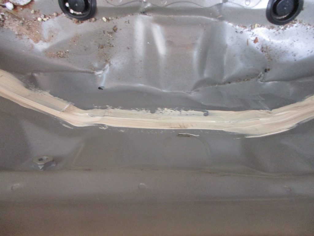 リアバンパーは何箇所か凹んでおり、中のバックパネルもブツかった影響で真ん中周辺は押されて凹んでて、鉄板とのつなぎ目のシーリングも剥がれてます。