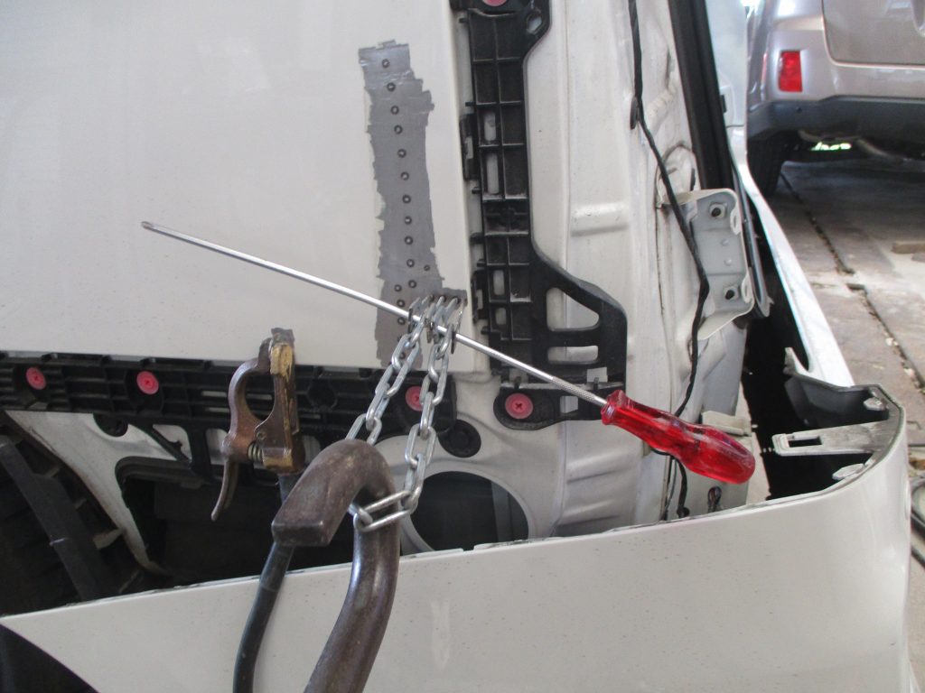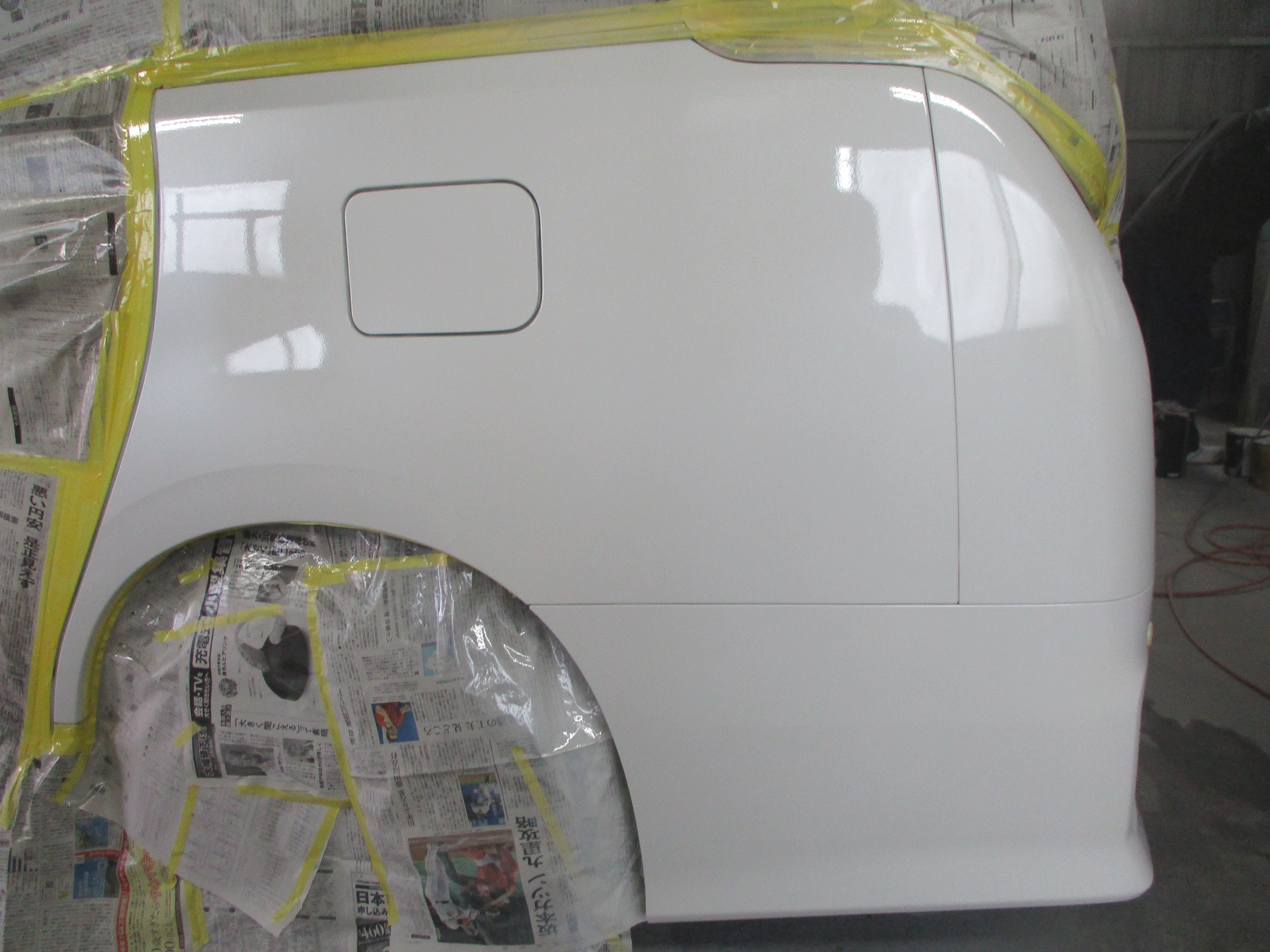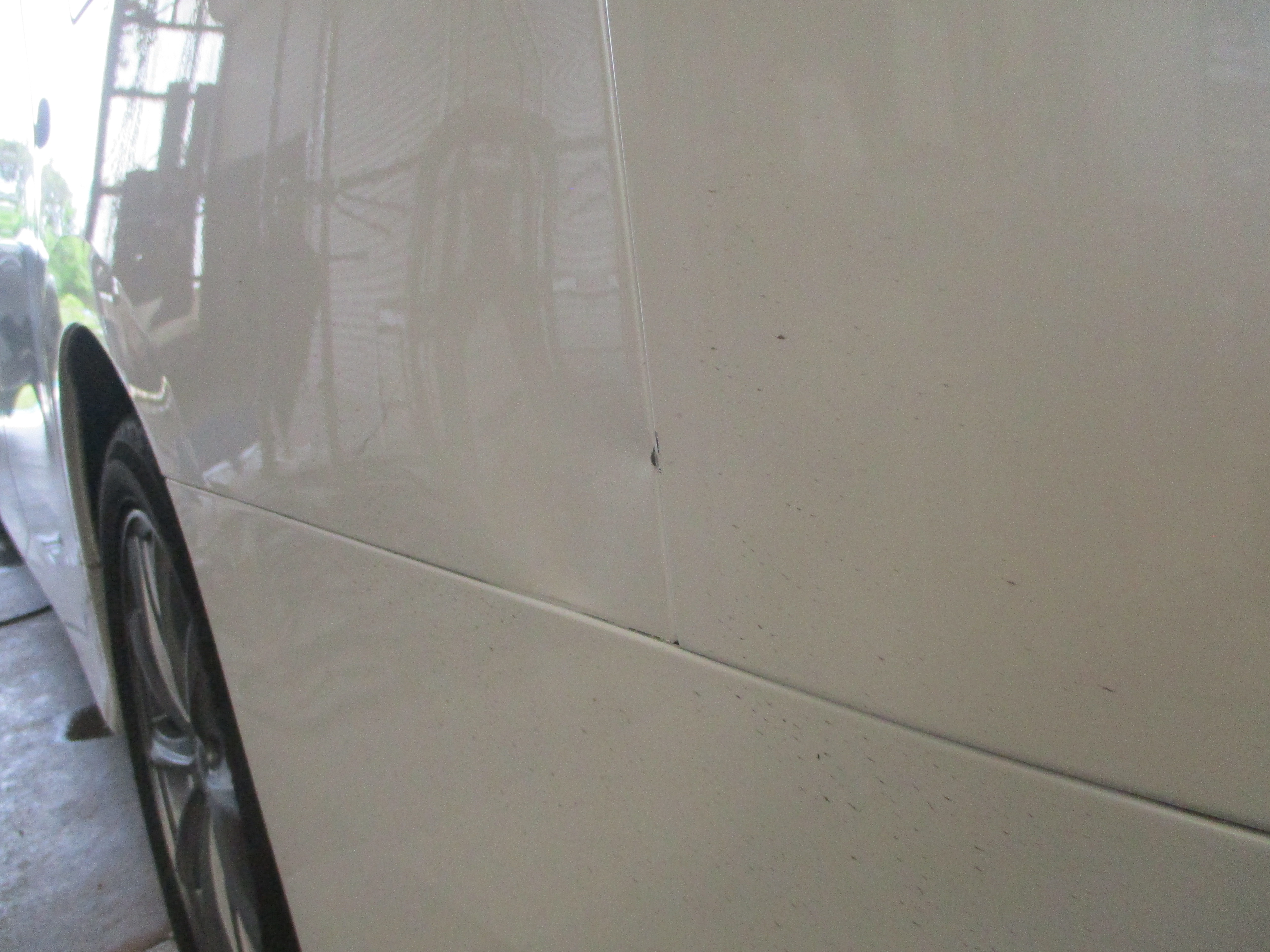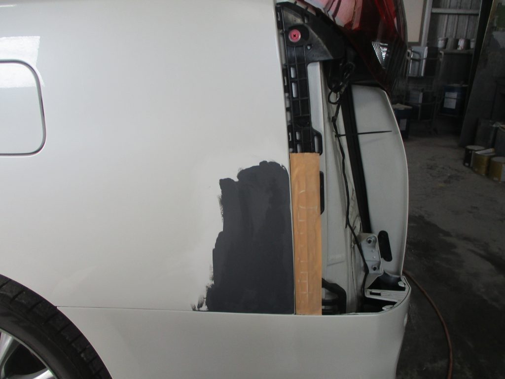 損傷箇所は左リアクォータとリアバンパーなのですが、リアクォータはリアバンパーとの境目付近に縦にヘコミがありリアバンパーも少し傷があります。今回は板金修理が可能な依頼でしたのでお見積りを最初に提示してから、改めて入庫していただきました。