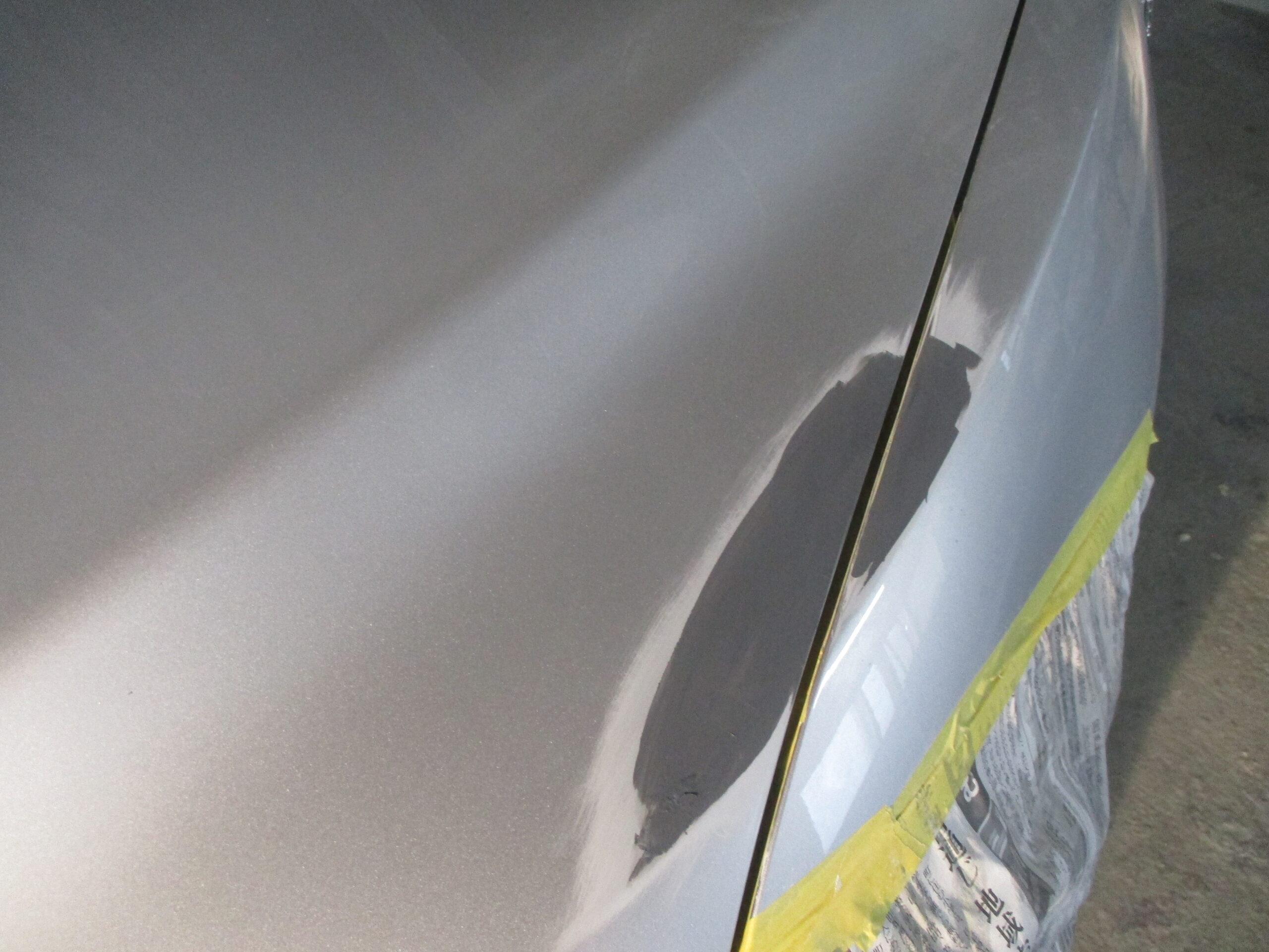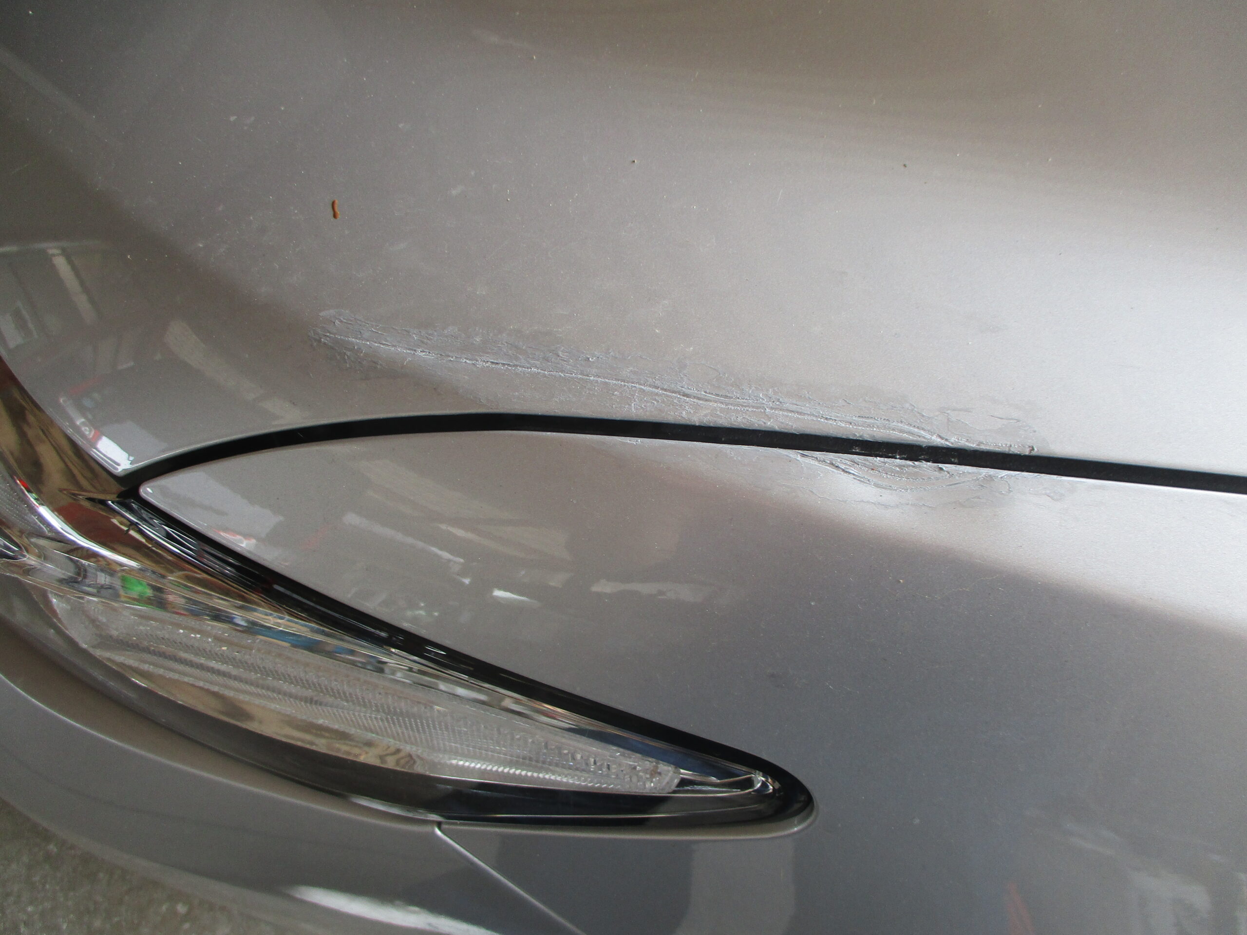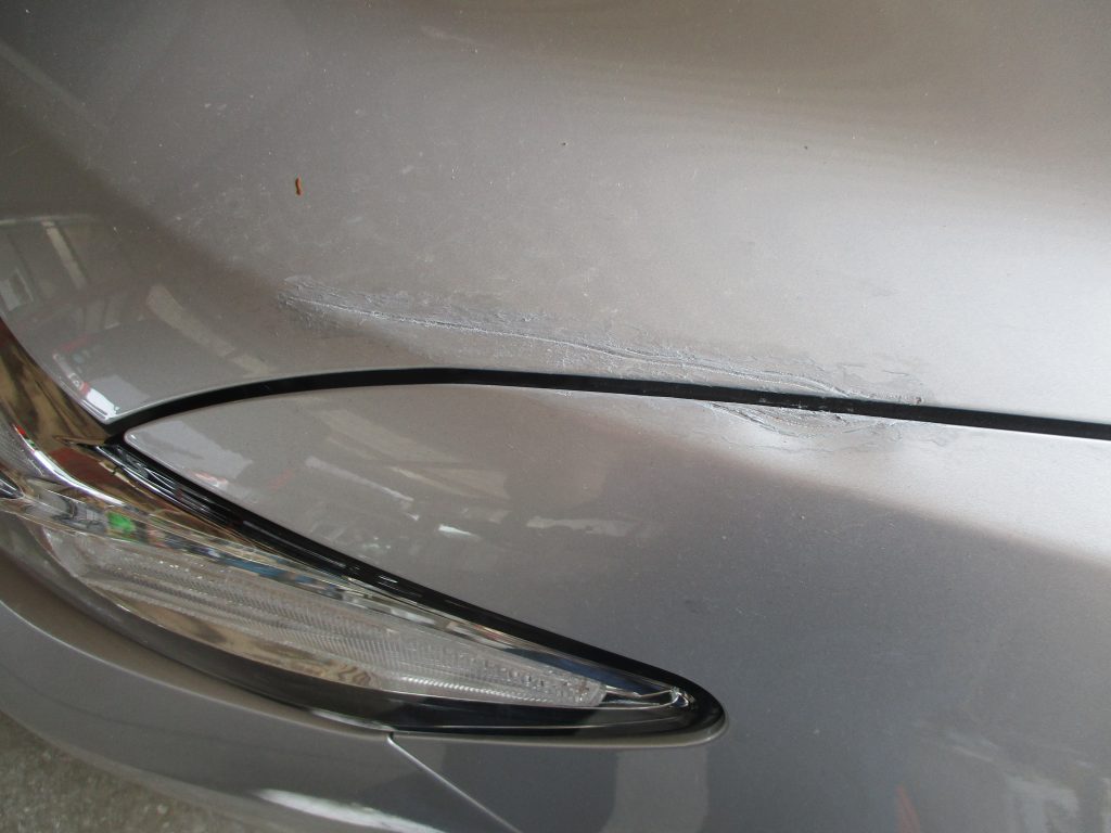 インターネットで検索していて弊社のホームページをご覧になってお電話をいただきました。今回はボンネットとフロントフェンダーに又いで15センチぐの傷と凹みがあります。