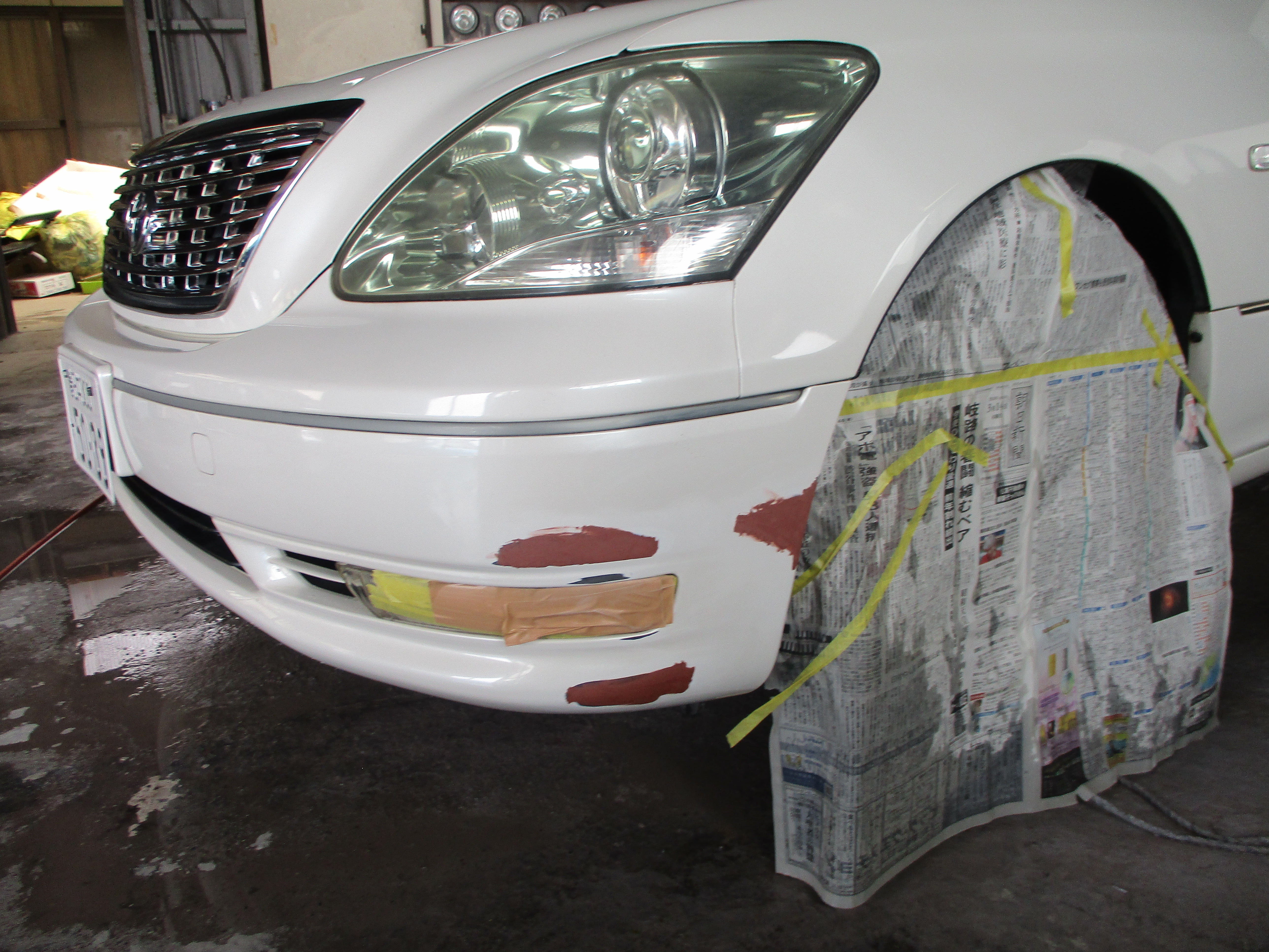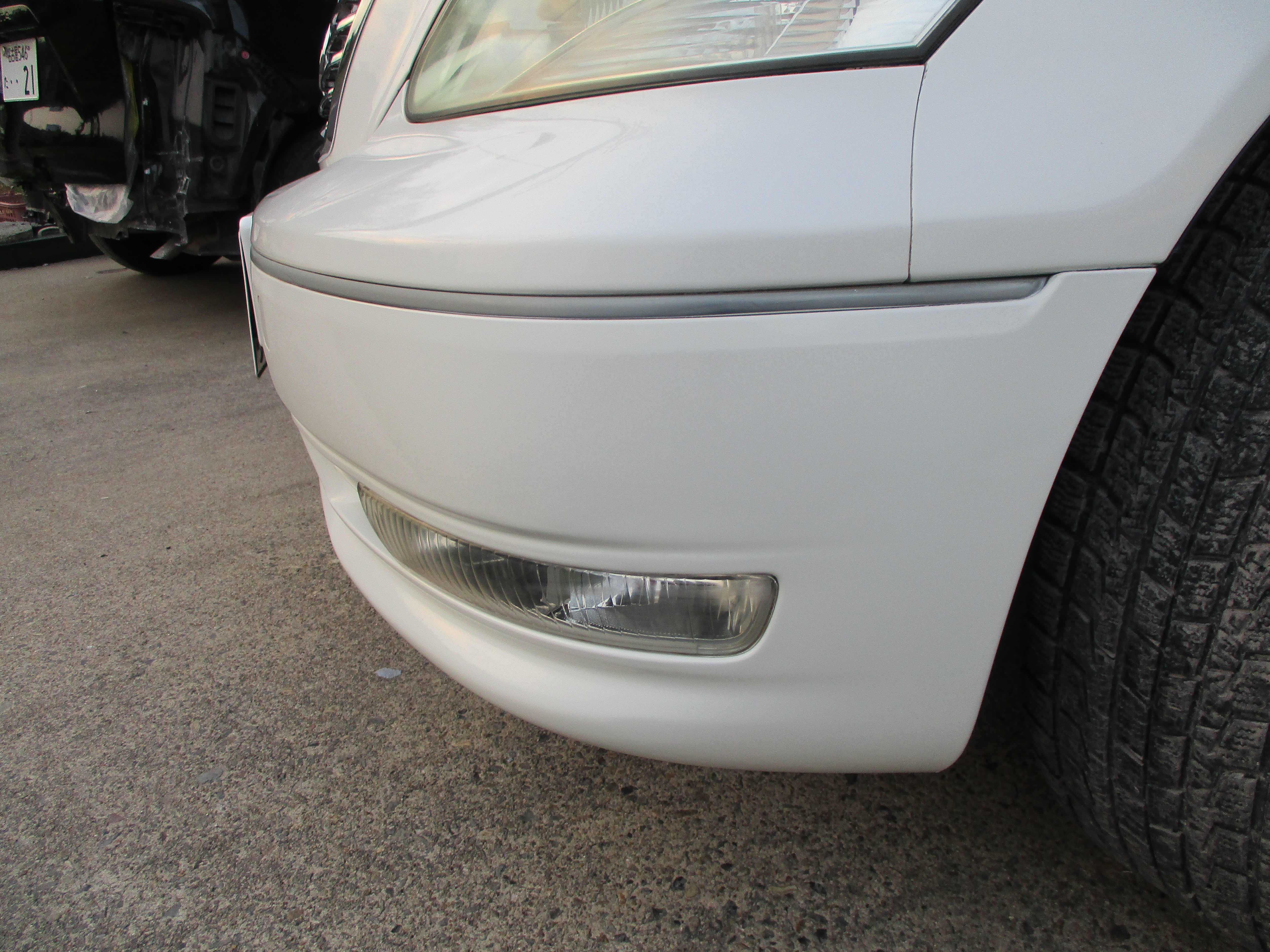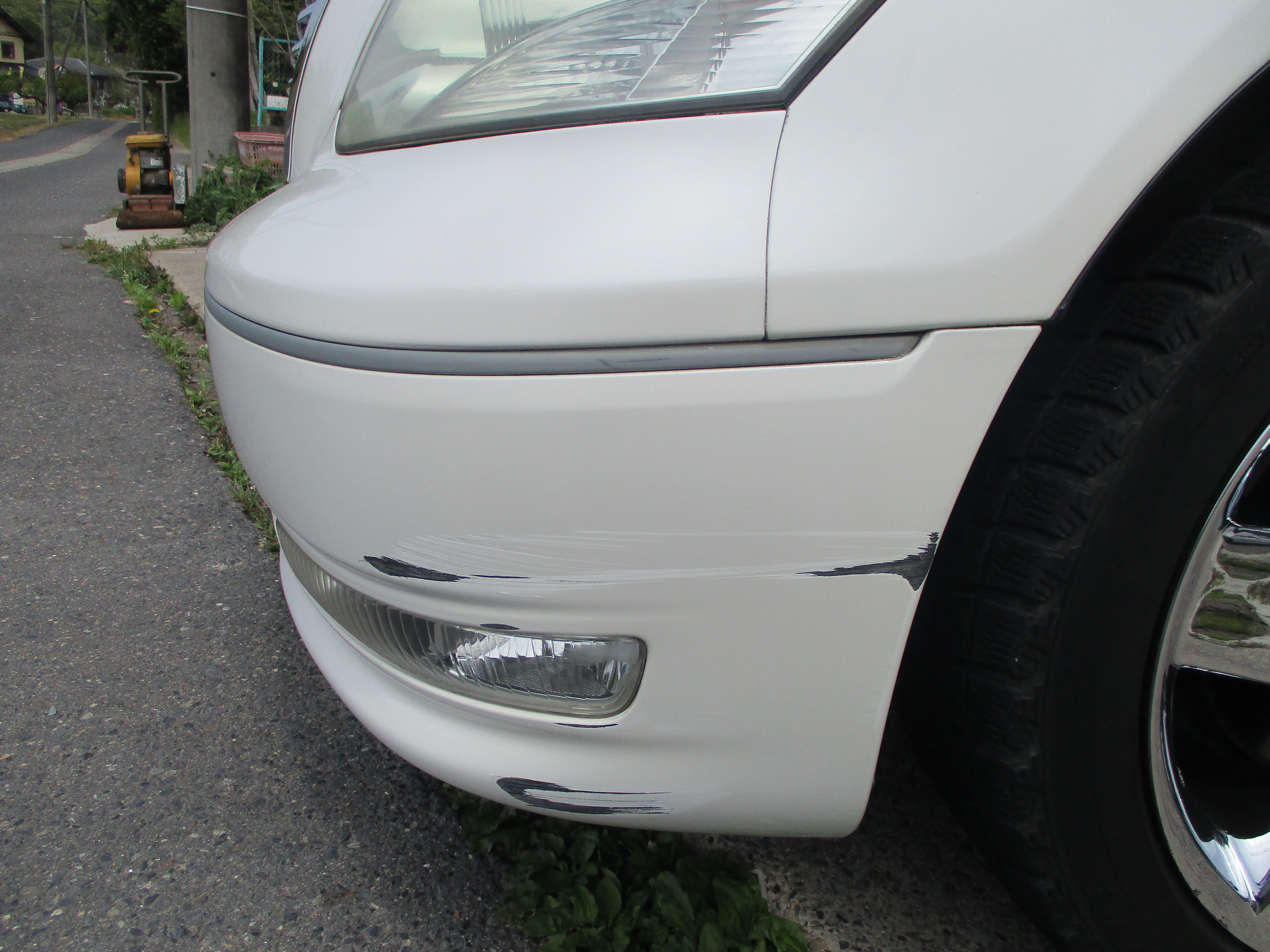 左側のフォグランプの辺りに、3か所の擦れたキズがあり、ホイールハウス近くの端の方は深く傷付いてます。直せますかねーとおっしゃってましたが、サイオ板金でしたらこれぐらいの傷なら朝飯前ですので、早速全力で修理します。