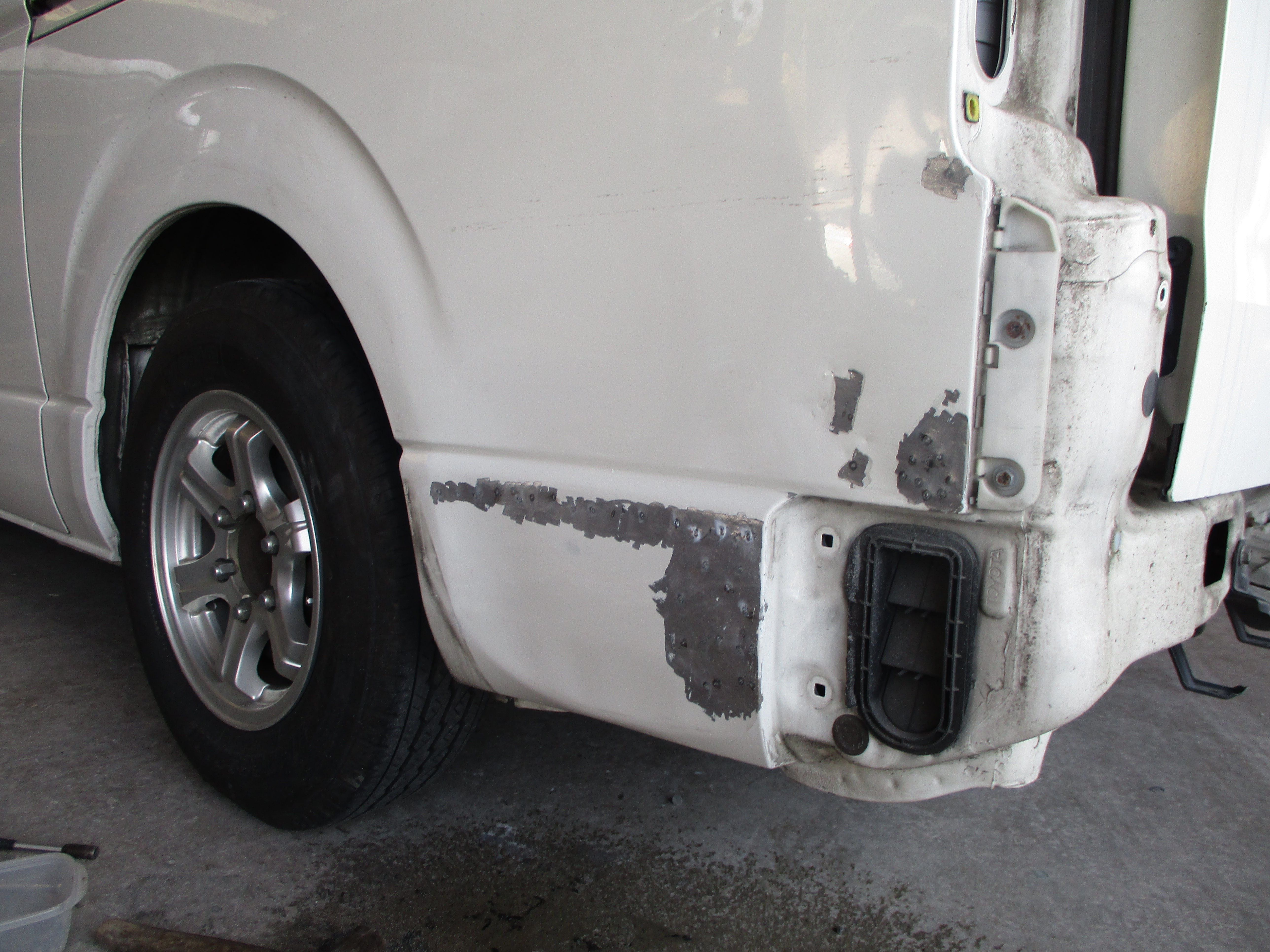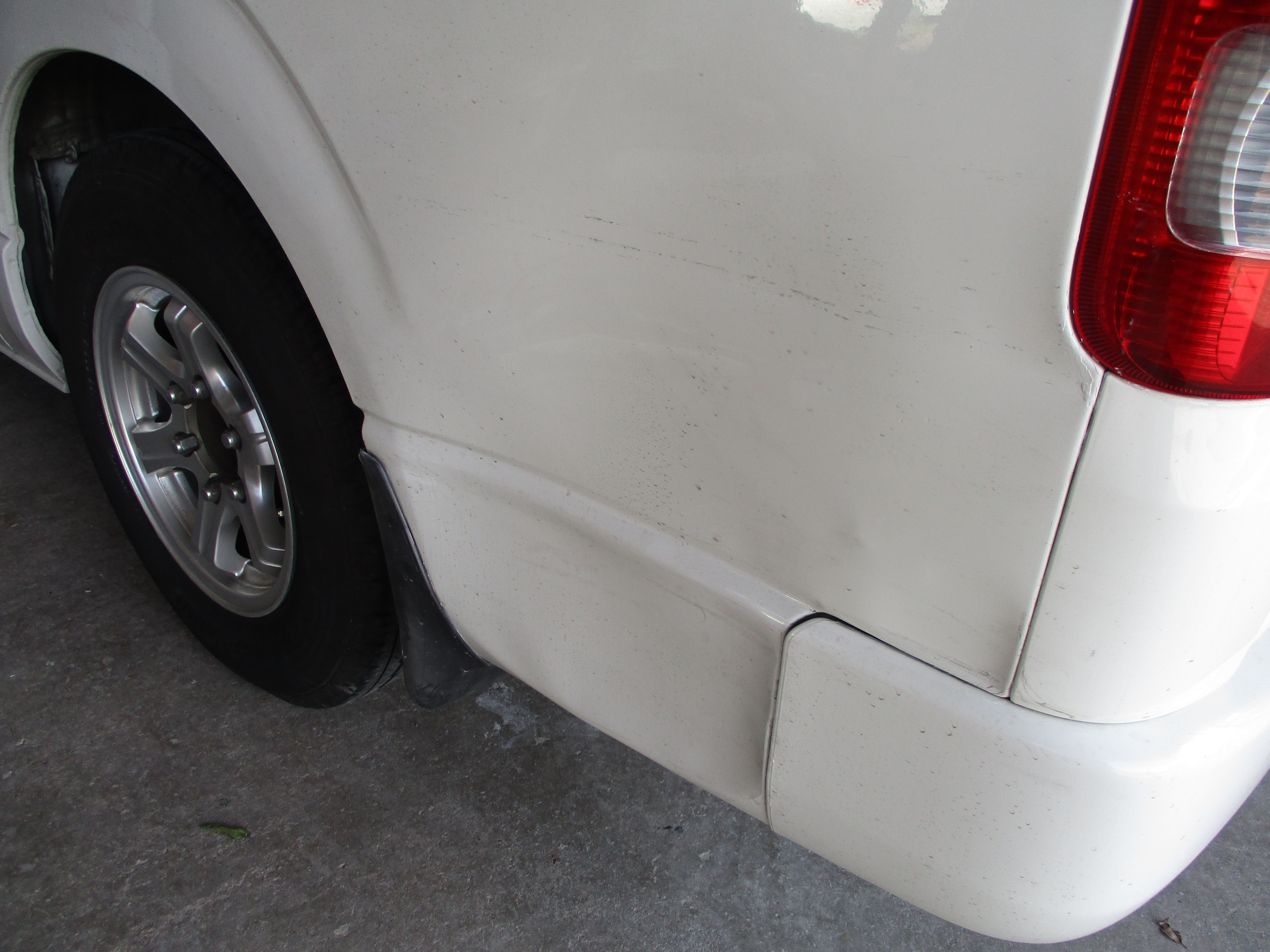 リアクォーターの損傷が、リアバンパー側の広範囲に渡るおおきな損傷なのですが、なんとリアバンパーには全然キズヘコミがありませんが、リアクォーターのヘコミが左テールランプの高さまで達しています。ハイエースの損傷の面積も広いので板金に時間は掛かりますが、交換するよりも早いお時間で終わりそうでしたので早速板金していきましょう。