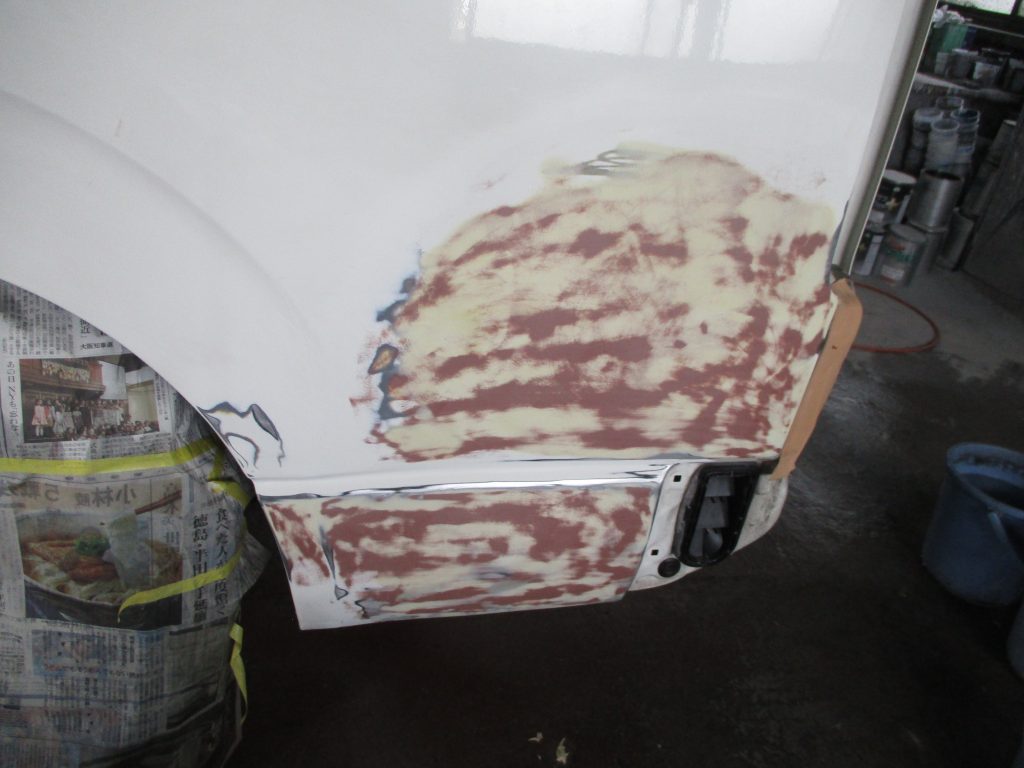 板金が終わりましたら、引き出した部分にファイバーパテをまんべんなく厚盛していき、サンダーで削って低い部分に2,3回塗り重ねます。そして高さがほぼ整ったら、柔らかい中間パテでさらに表面をツルツルに仕上げていきます。修正作業が終わりましたらサフェーサー塗り、画像の茶色い部分のラッカーパテで細かい巣穴やピンホールを埋めて、水研ぎペーパーでにしっかり下地処理出来ましたら、いよいよ塗装に移ります。