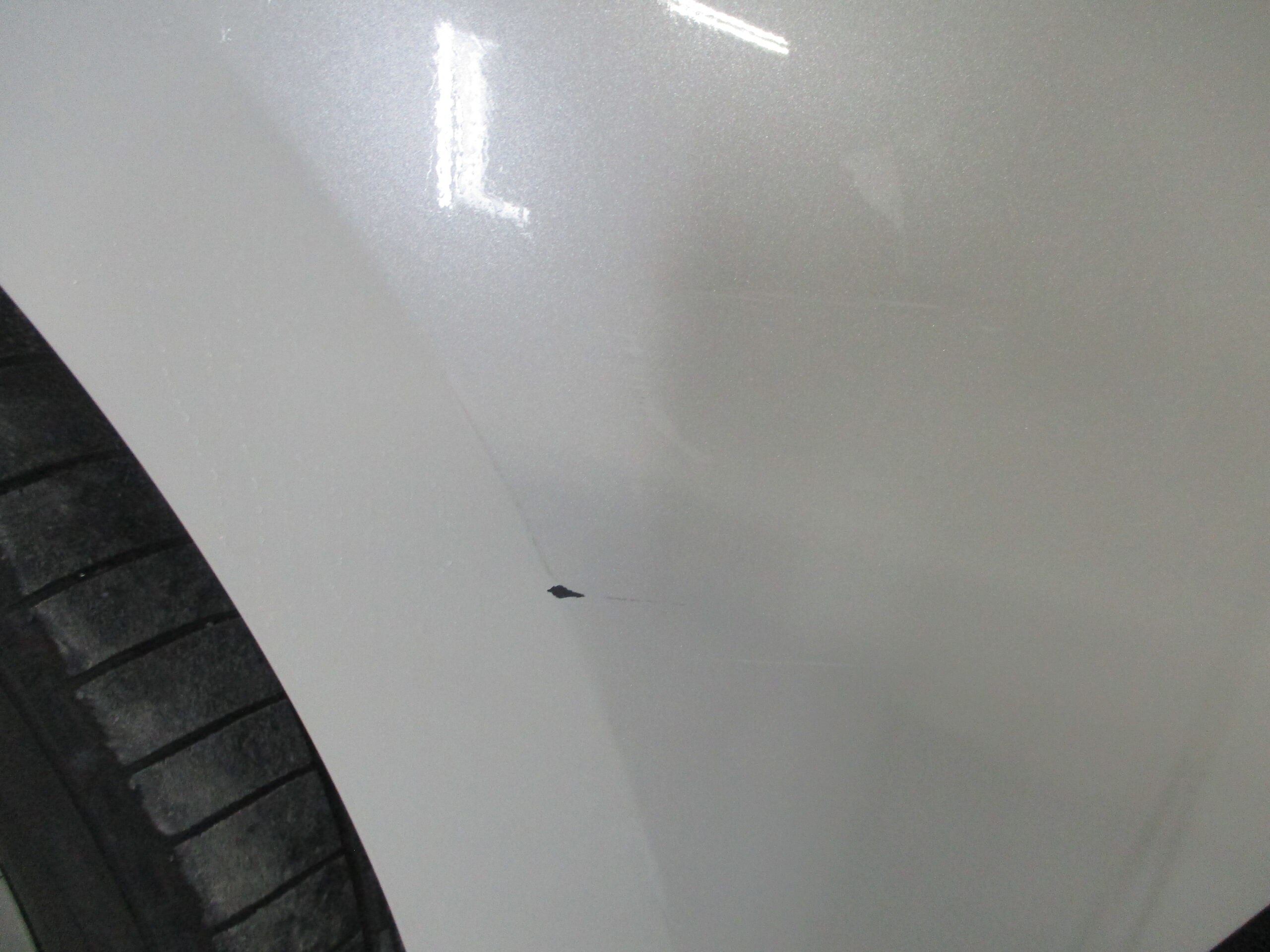 ハリアーのフロントバンパーの右側に横に擦り傷が入ってて一部下地が見えています。今回は対物事故で車両保険での修理になります。