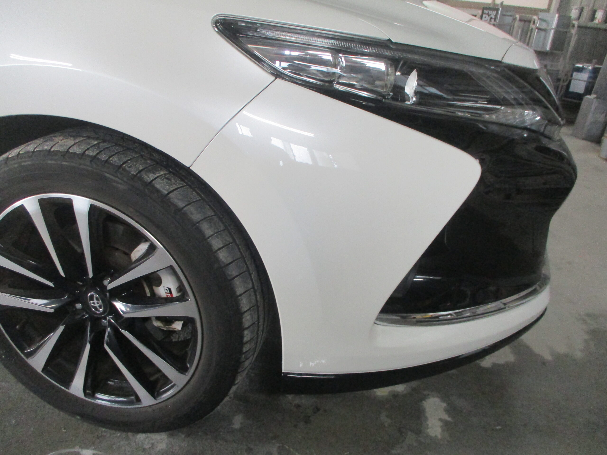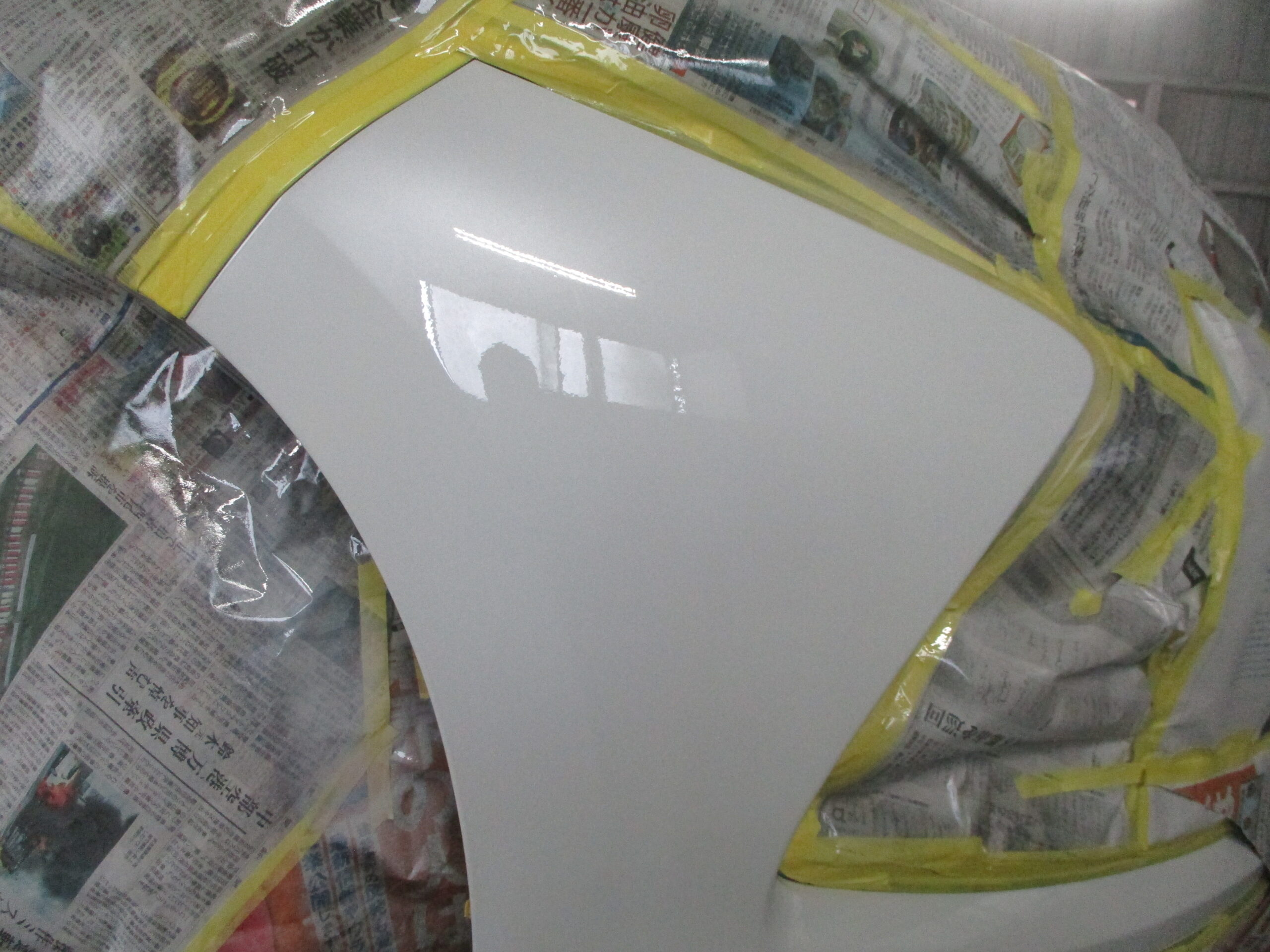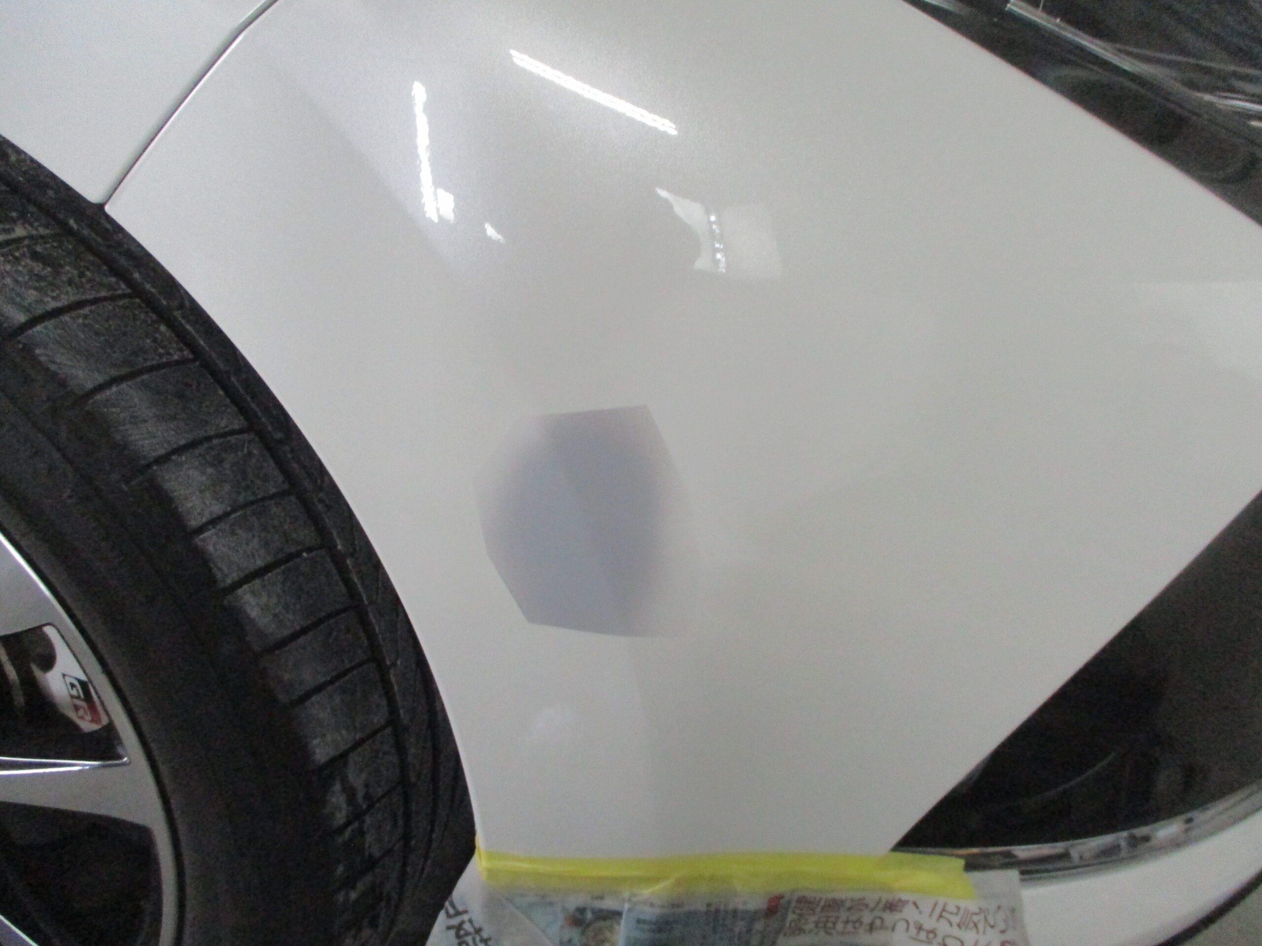 塗装の工程です。まず車体に塗装する色を作りますが、コーションラベルからカラー番号を確認して配合を調べたら、原色を混ぜていきベースの色が出来たら色味を合わせて最終的な色が完成したら、色が他のパネルに付かないように養生してフロントバンパーを綺麗に塗装します。
