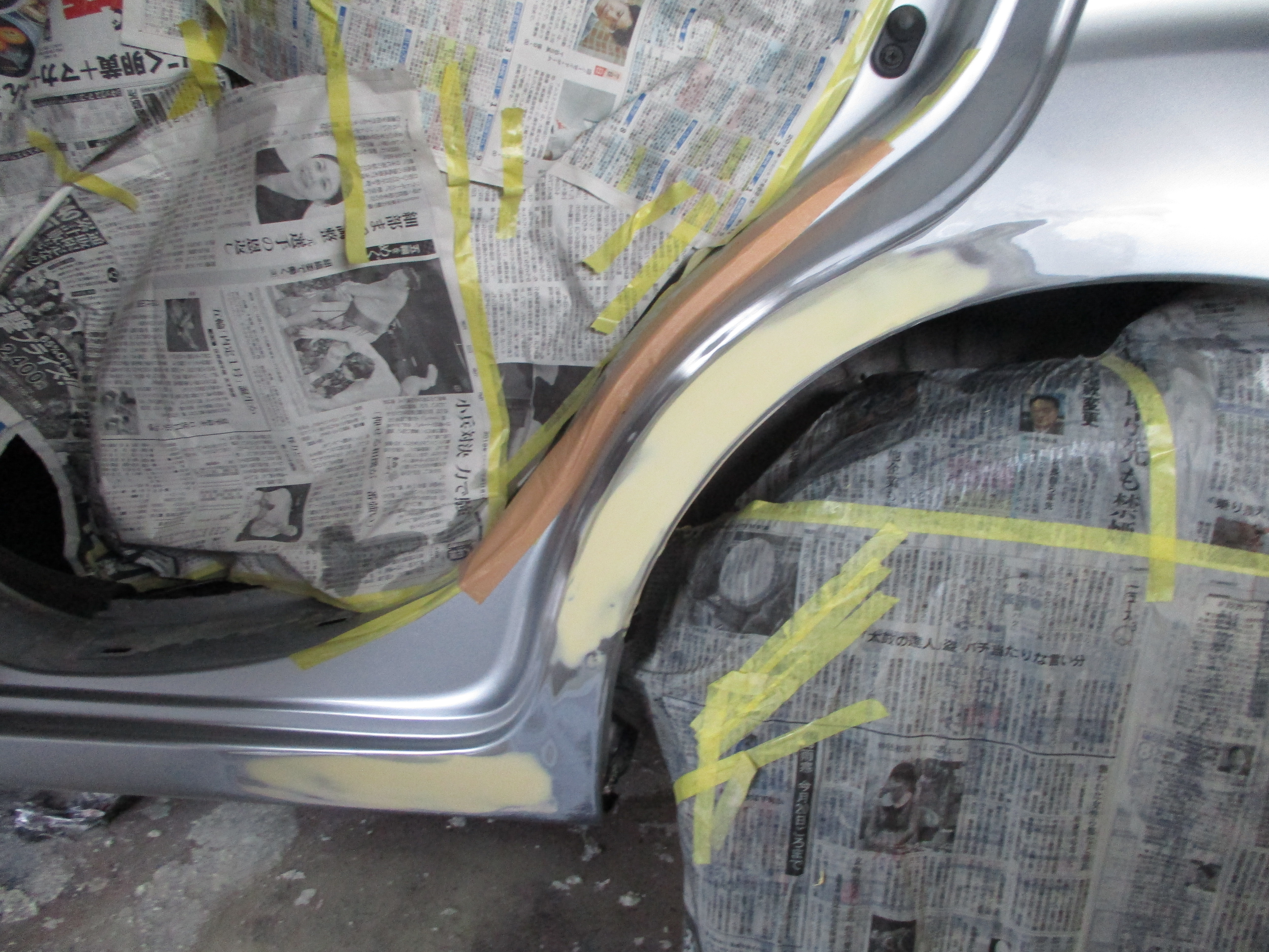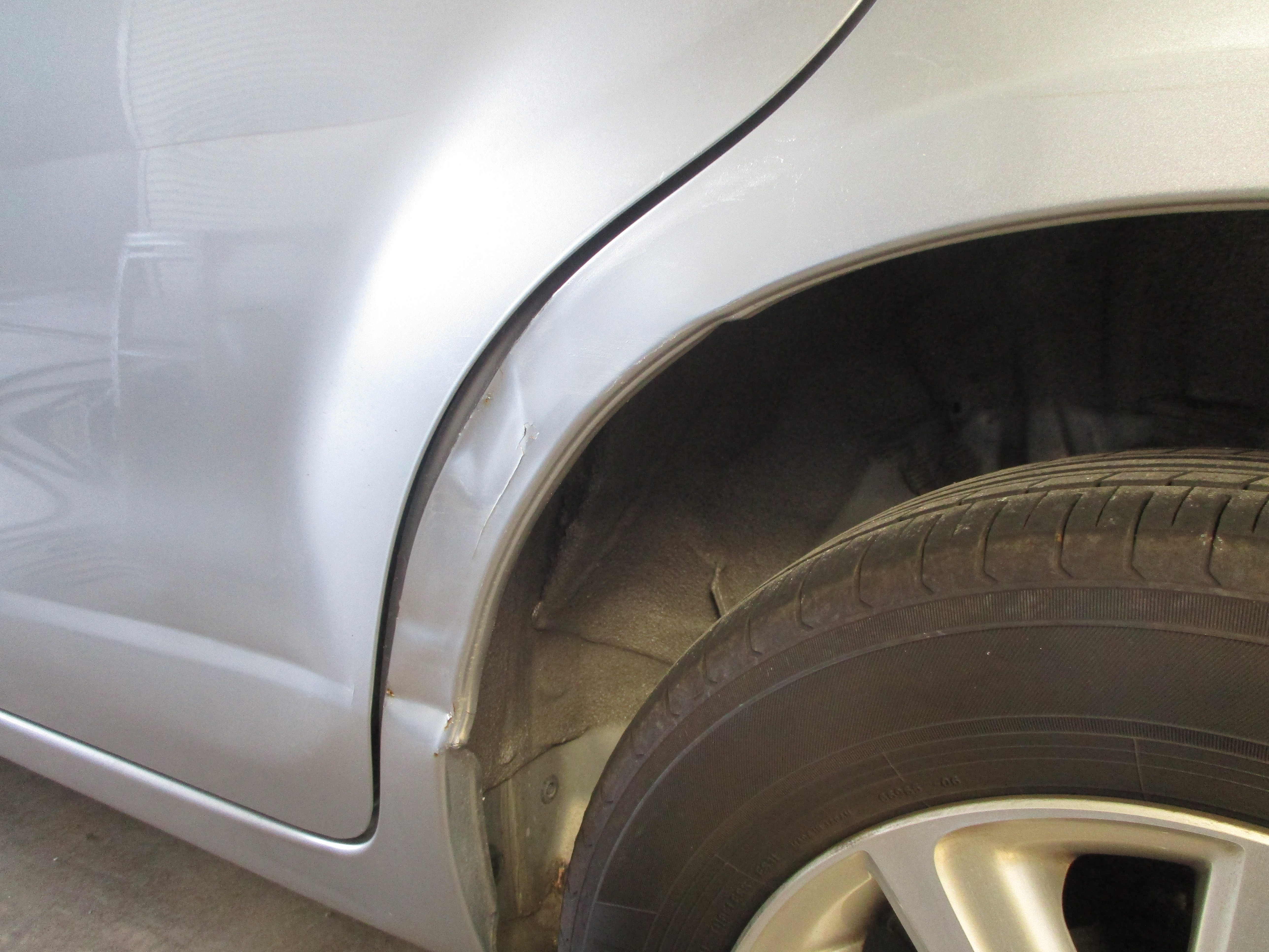 左リアクォータは細くアーチした所が深く凹んでいて、すぐ隣のリアドアと比べると1センチ以上凹んでいるのが分かります。リアドアにもヘコミがありましたが今回はリアクォータのみ修理依頼となります。