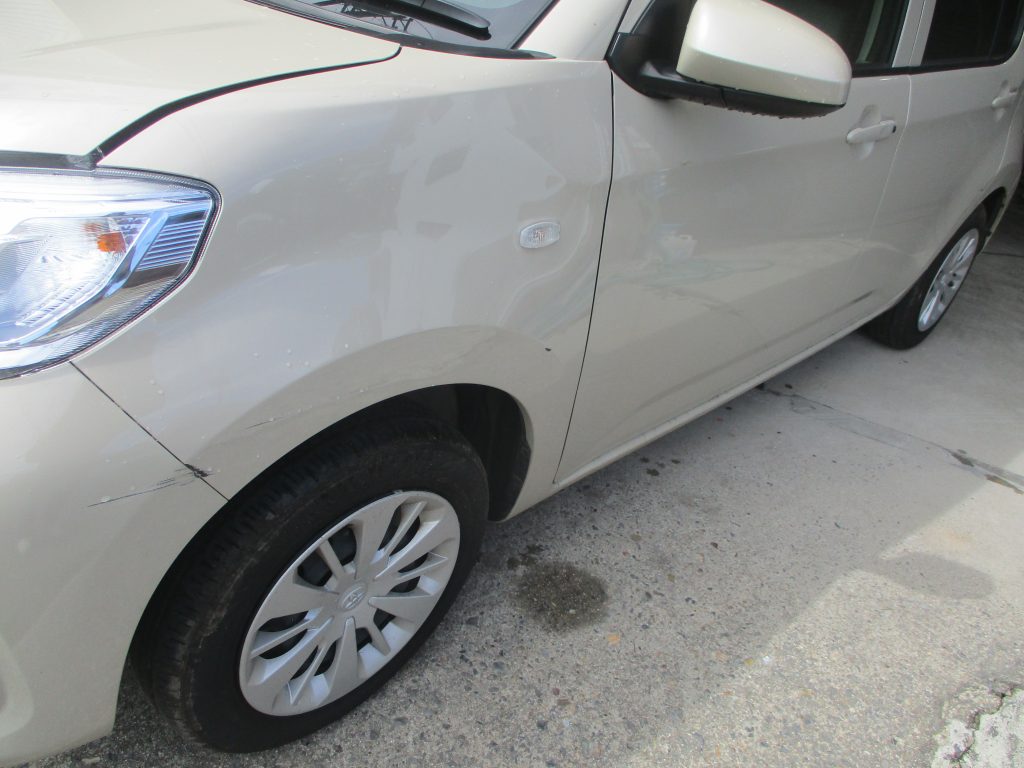 今回はフロントバンパーにからリアバンパーに掛けて側面のヘコミ傷が入っています。お客様曰く壁に擦ったとお聞きしました。低速でしたがそれでも凹んでしまったので落ち込んでいられました。出来るだけのお安いお見積りを提示させていただきました。