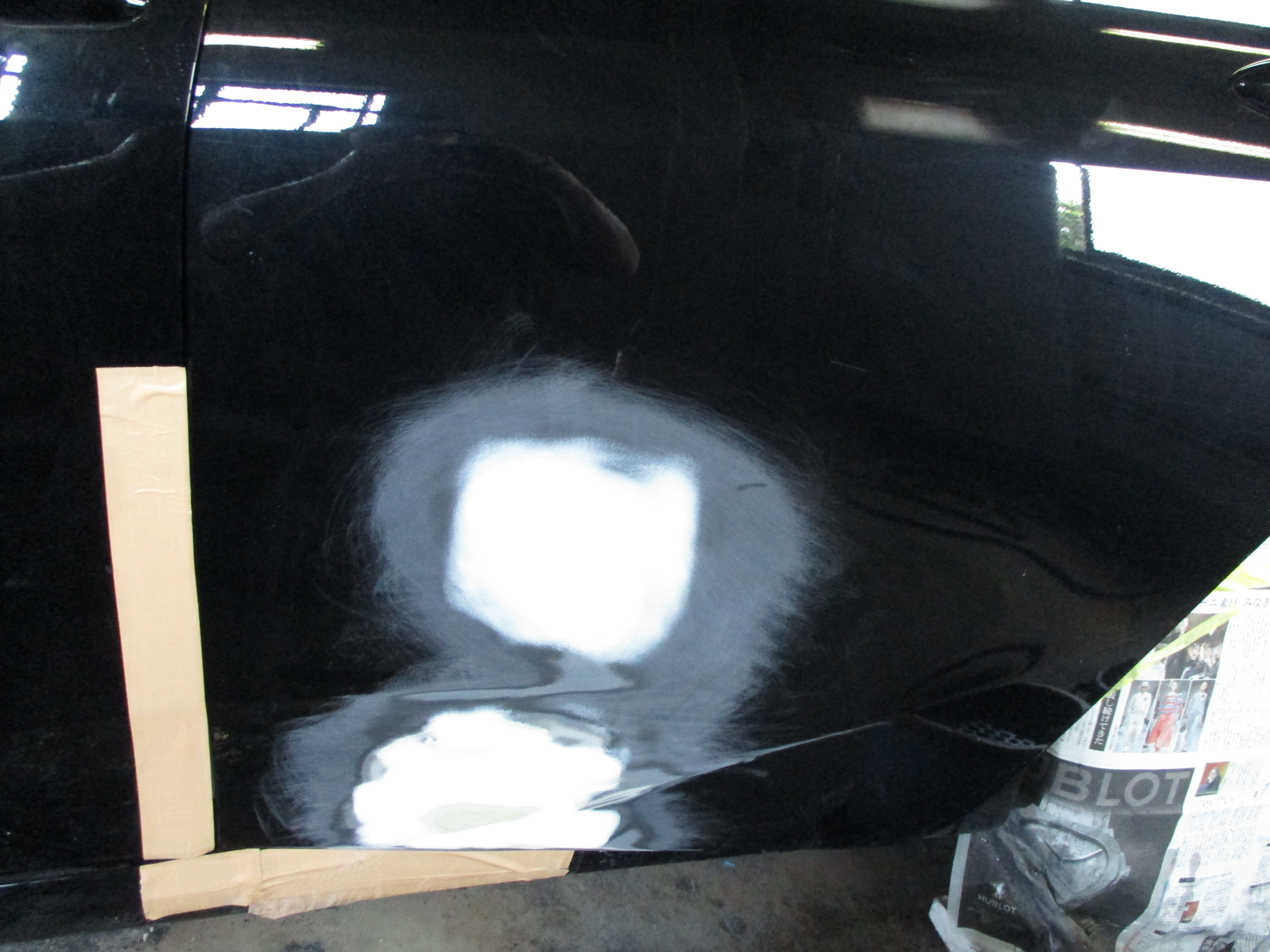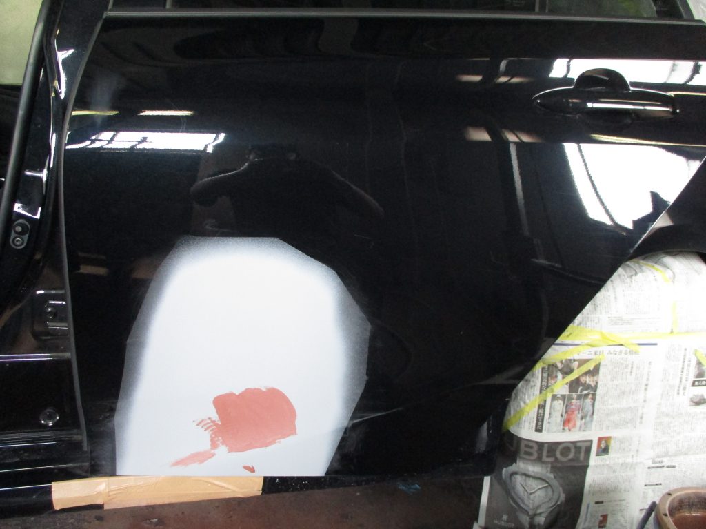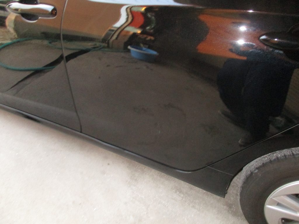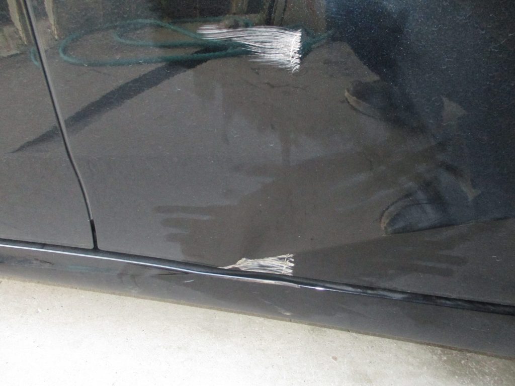 左リアドアの真ん中と下側に1ヶ所ずつヘコミと傷があります。ドアの下側の損傷のすぐ下のパーツにも傷がありますが、今回は磨きだけで綺麗にします。
