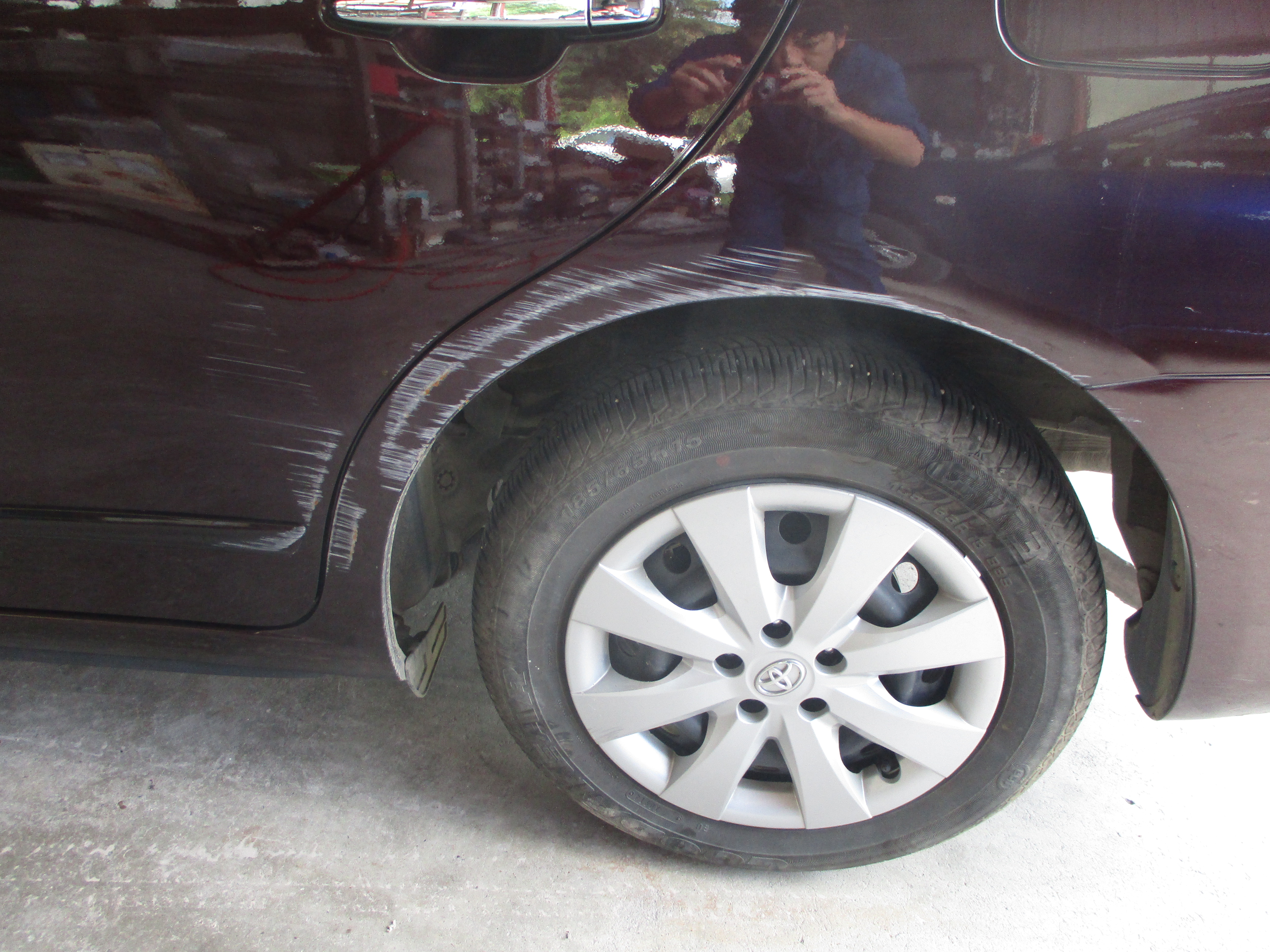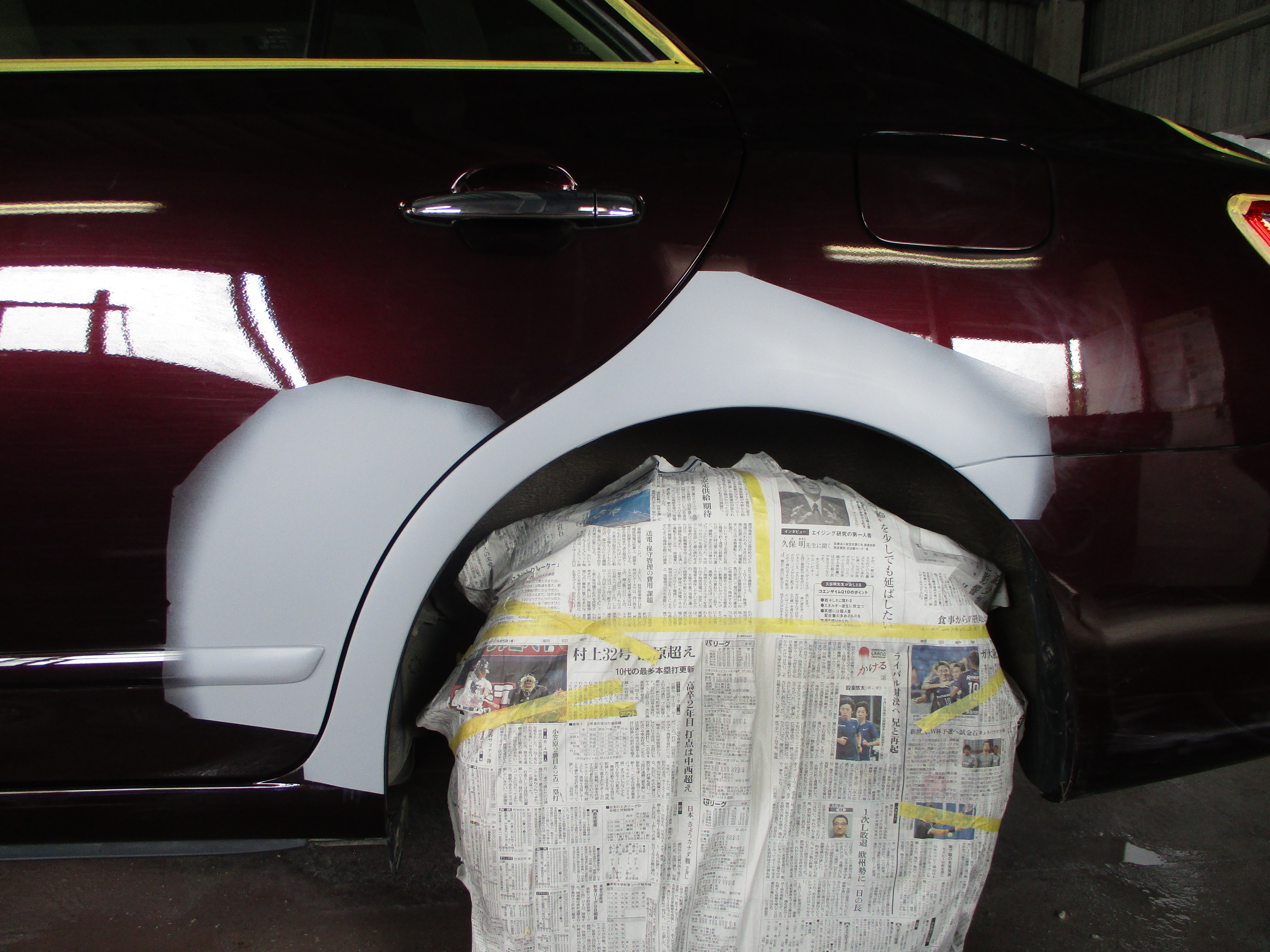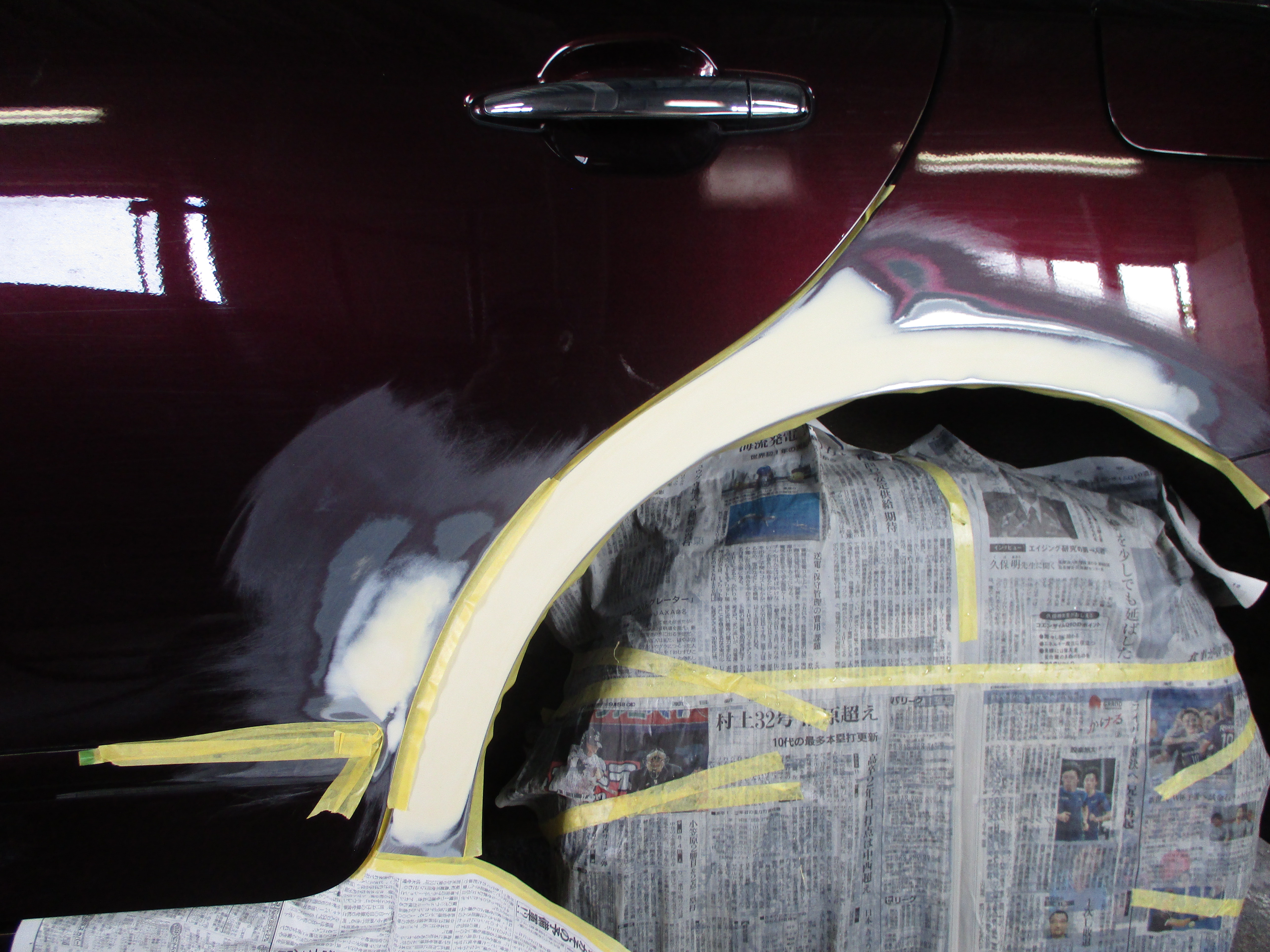 リアクォータのアーチ部分が傷が広くて全体に薄く凹んでいるので、軽いヘコミも少しあるので板金して、全体に押されてますがパテでしっかり形を作ります。リアドアとリアバンパーにも傷がありますので直します。