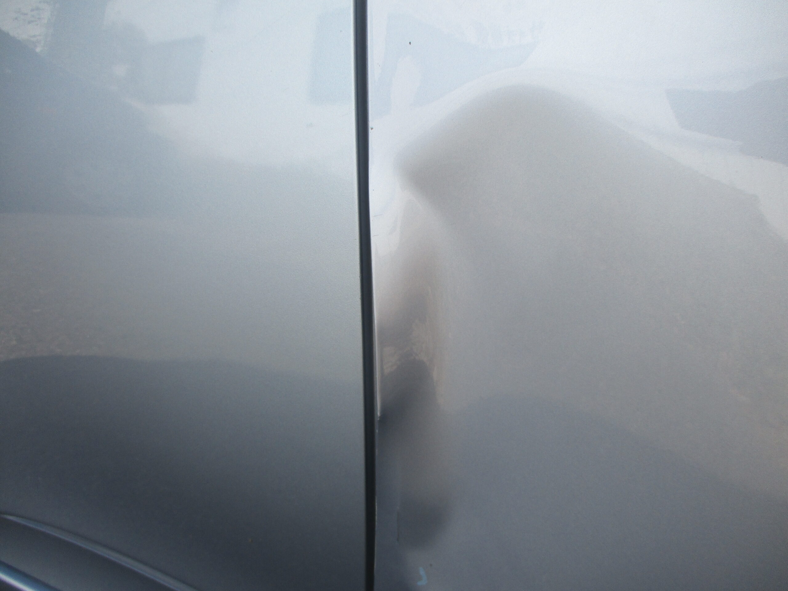 右のフロントドアがリアドア付近までボコッと深く凹んでいます。事情をお聞きしたところ、社用車との事でなるべく交換ではなく板金で修理出来ないかと、ご相談を受けましたので部品交換ではなく板金で直しました。