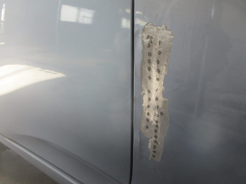 板金修理で、ある程度の高さがで出来たら、次にパテを修理箇所にしっかり塗り込んで乾かして固まったら、パテを機械で削り何度も塗り重ね平らな形を作ります。最後はサフェーサーで仕上げます。
