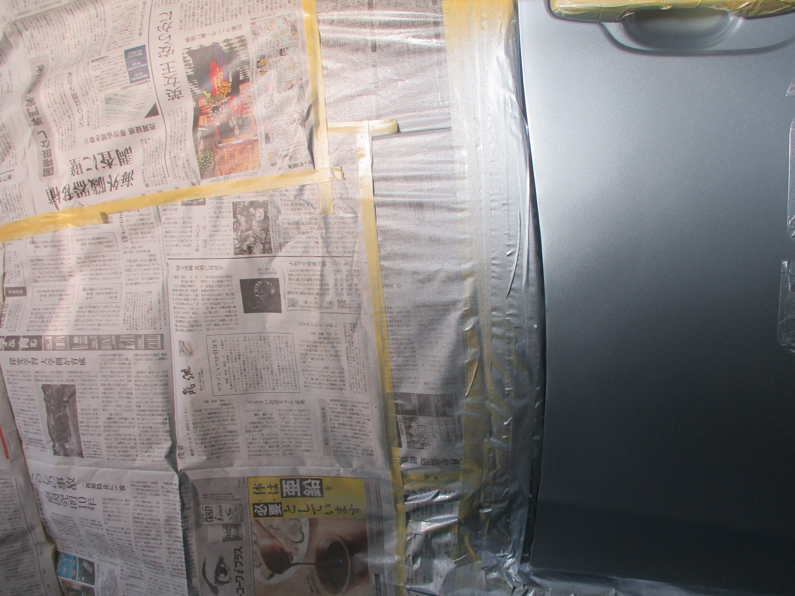 フロントドアのに塗装する色を作ります。最初に車体のコーションプレートからカラー番号を確認したら、カラー番号の配合を調べて配合表に基づいて色を作ります。作った色を車体に合わせながらさらに調色します。ミストが塗装しない部分に飛ばないように養生して、最後は作った色をフロントドアに塗装します。
