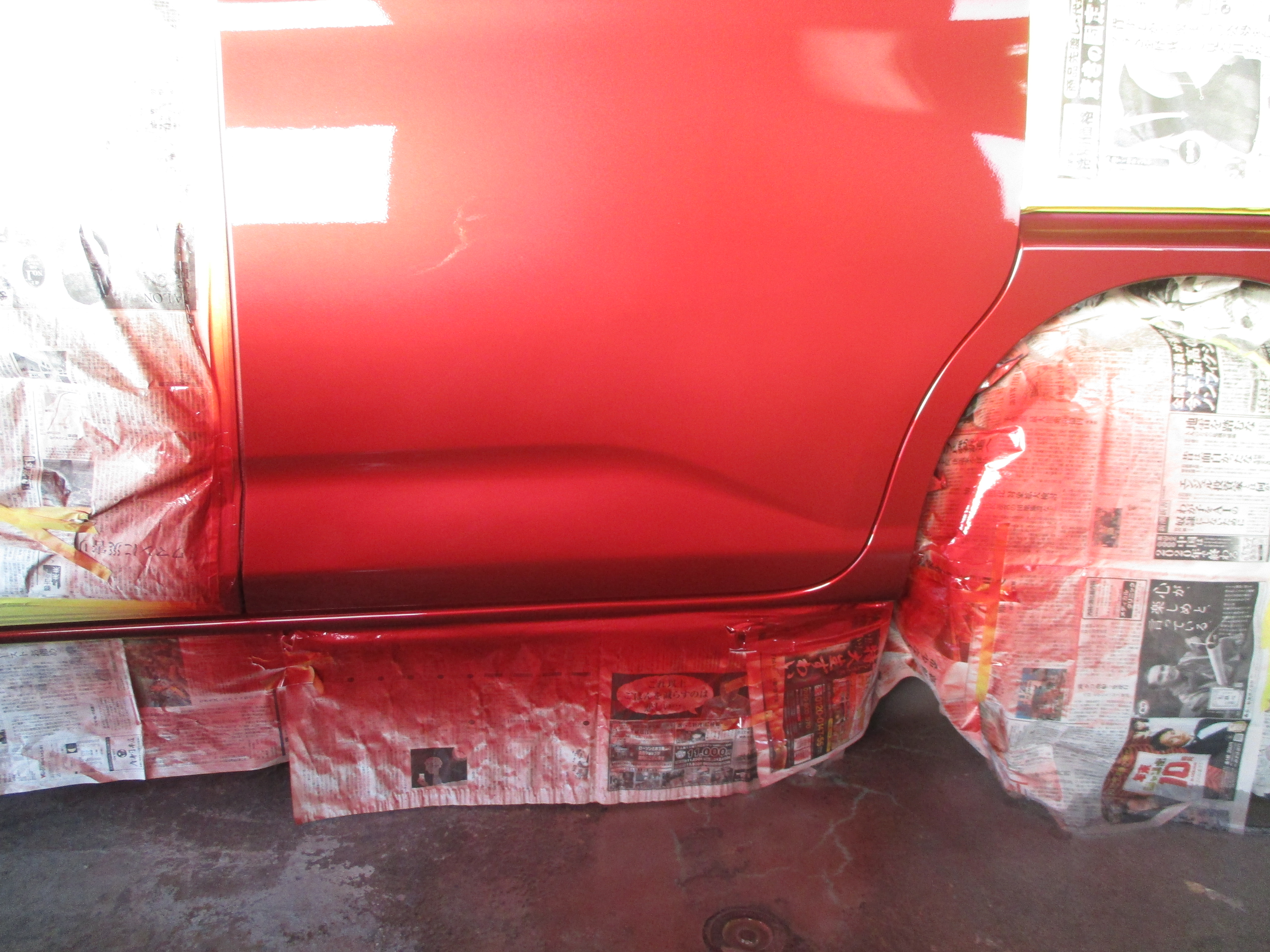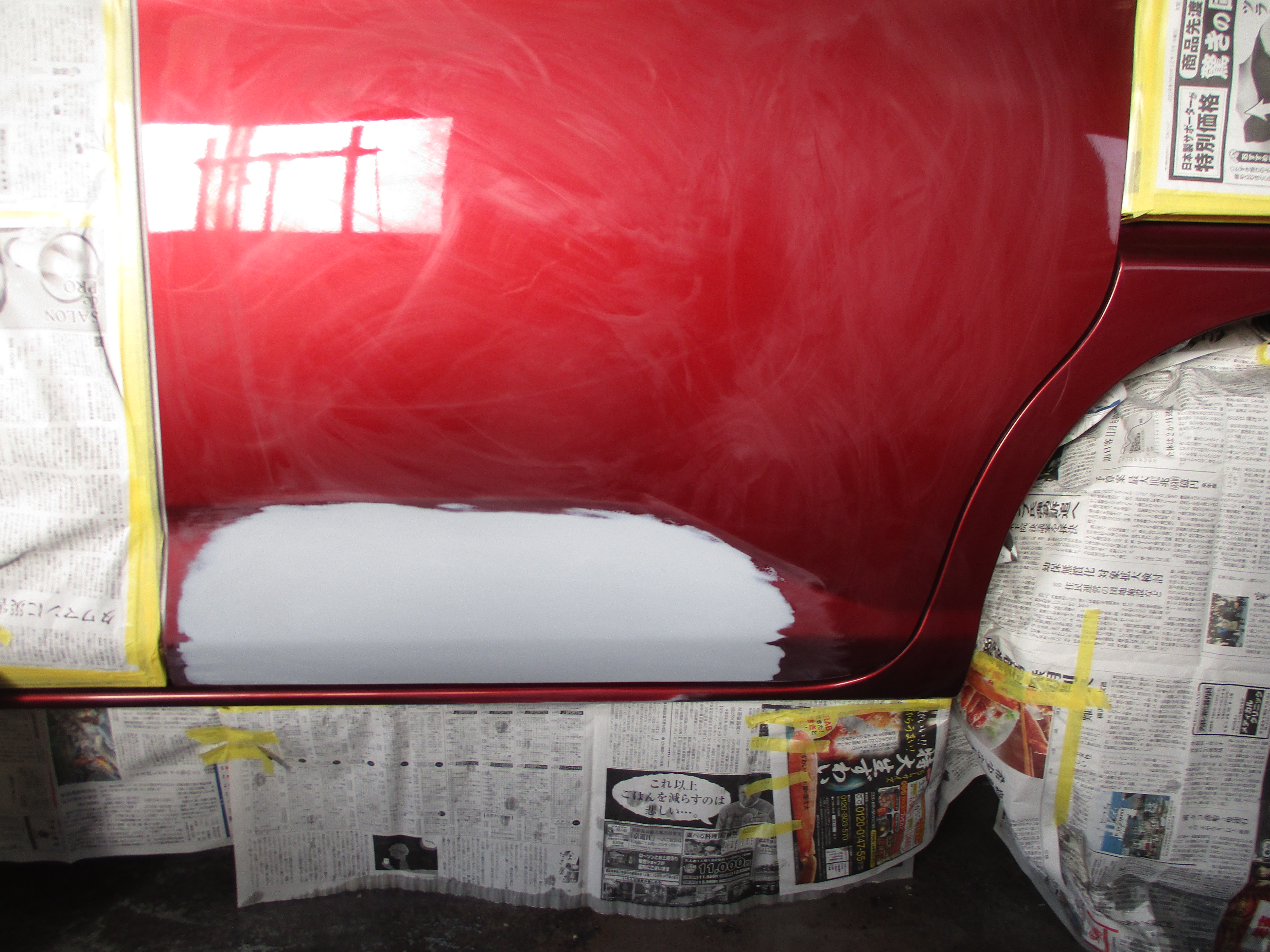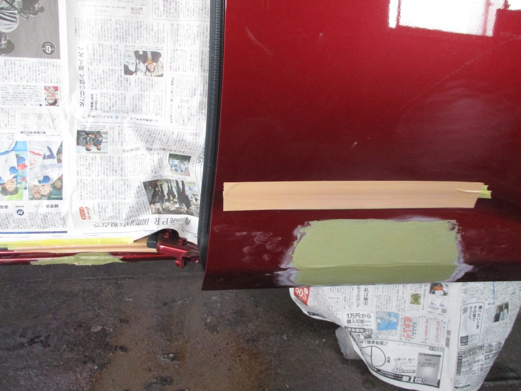 パテ処理で施した箇所に今度はサフェーサー塗装して、サフェーサーの研磨やしてツルツルして足付けをして最終下地が終わりましたら、塗装の色を調色していき、現車と見比べながら色を合わせていき、周りのマスキングをして、上塗り塗装をしていきます。