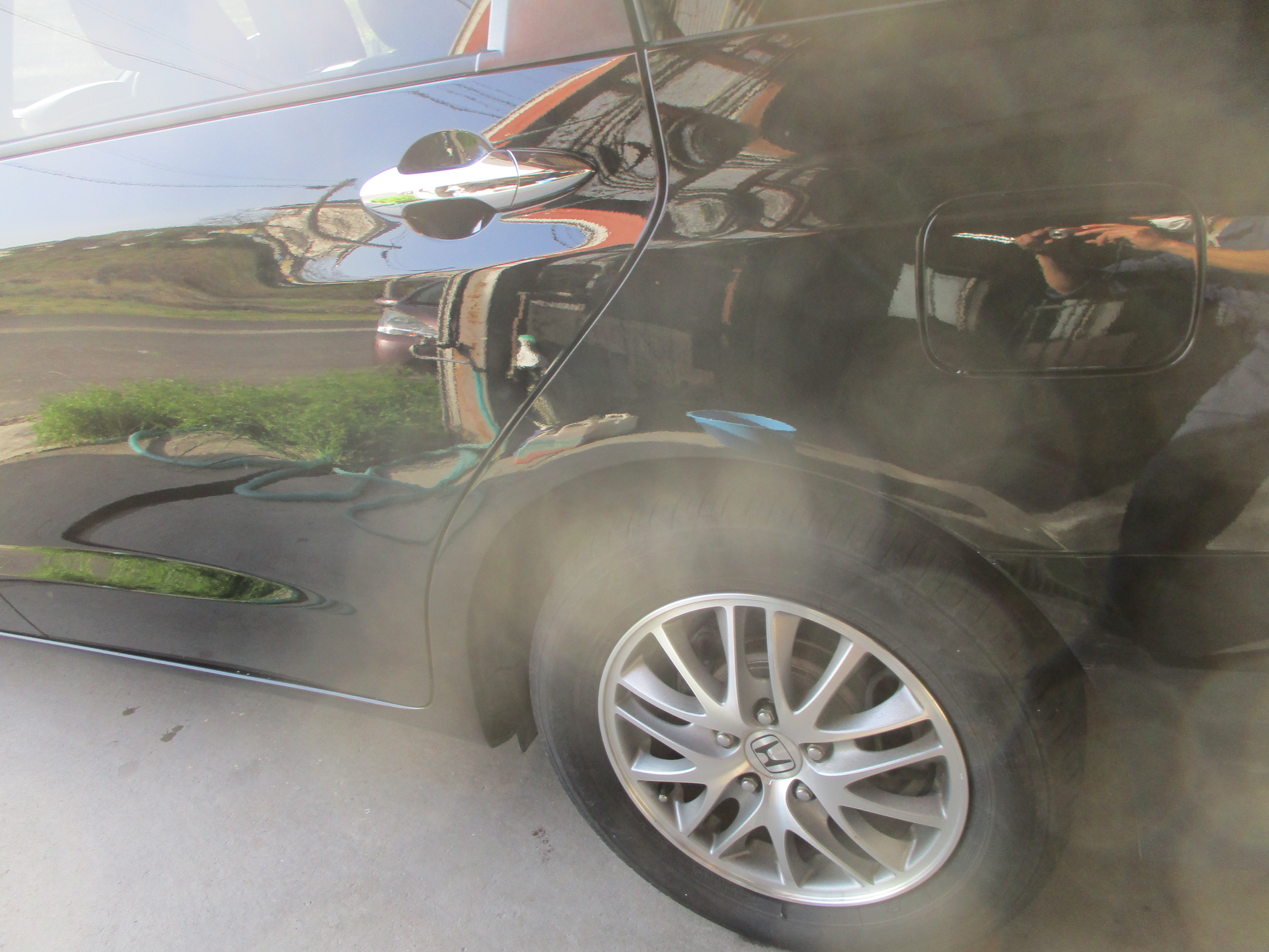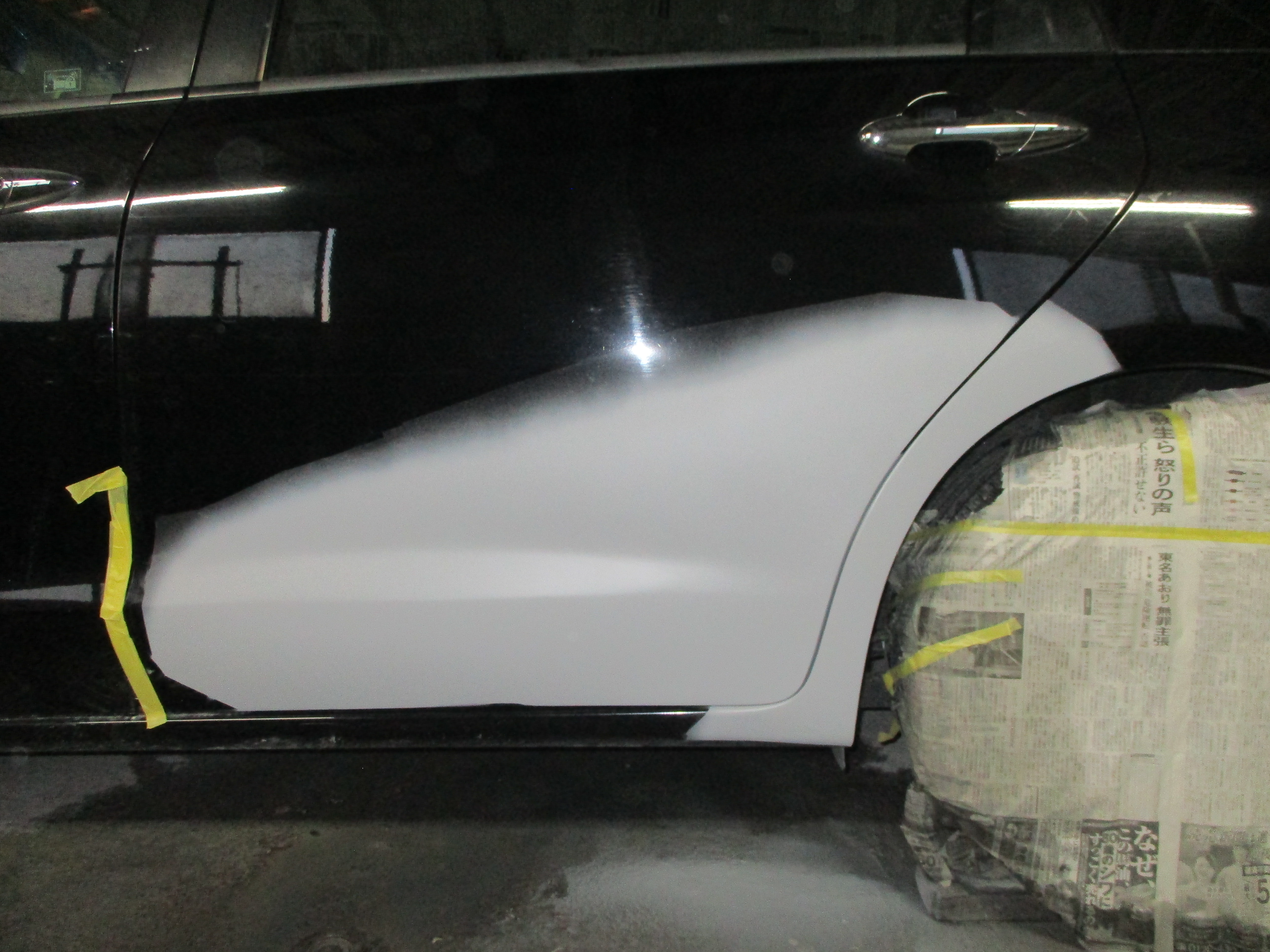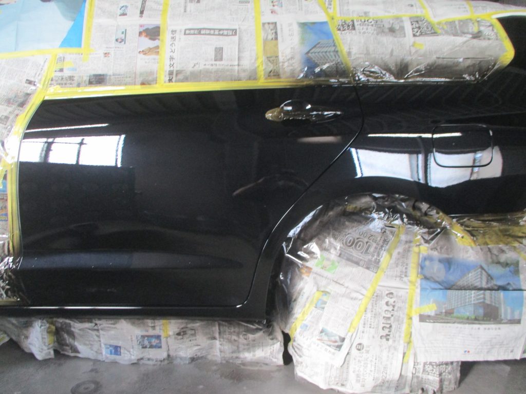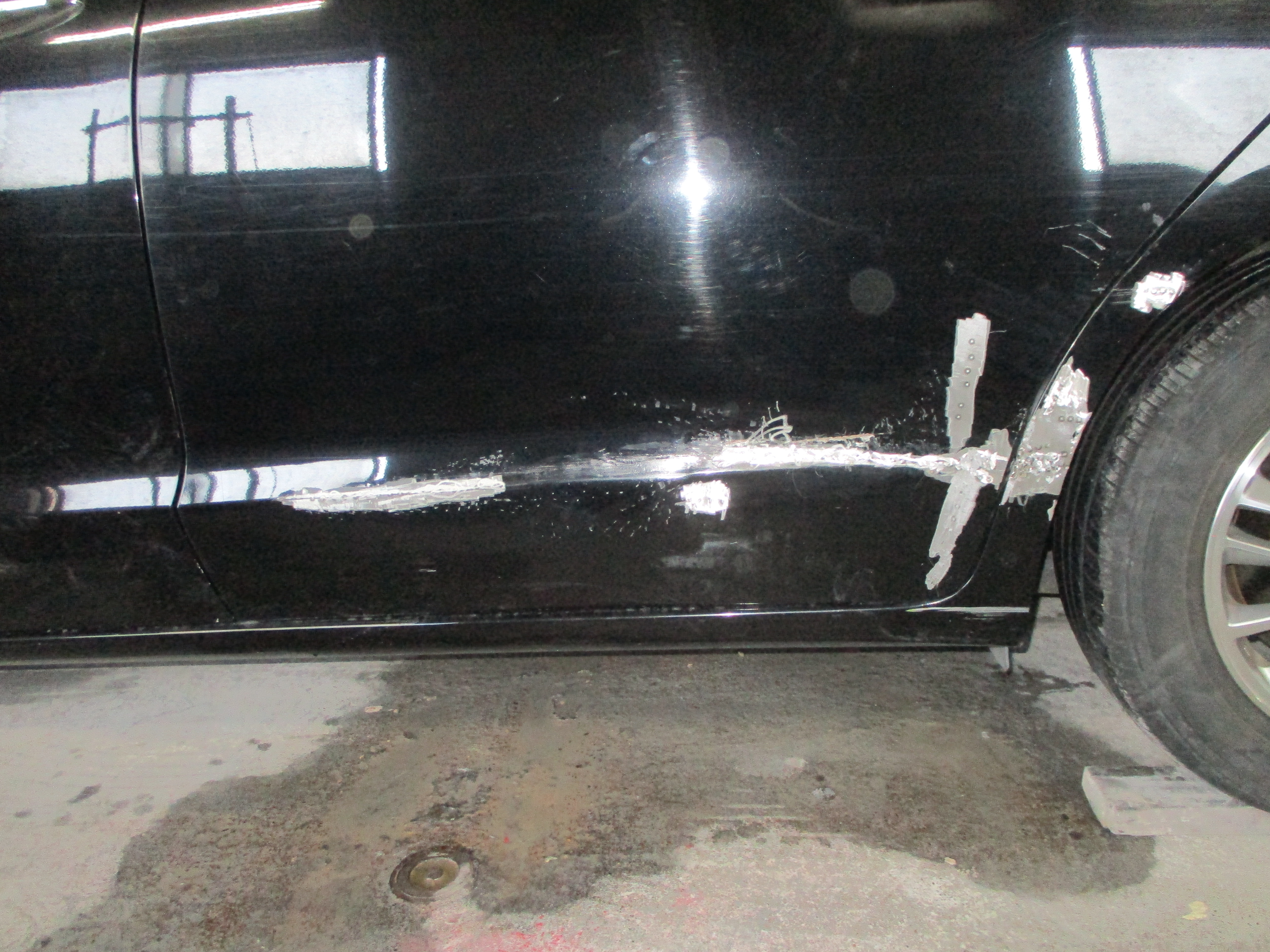左のリアドアがラインが凹んでいて変形していました。すぐ後ろの左のリアクォータもその延長で同じく凹んでいます。お見積りの時点では部品交換しなくても、なんとなく見映え良く形になってればといいですよとおっしゃてたので、板金での修理で直しました。