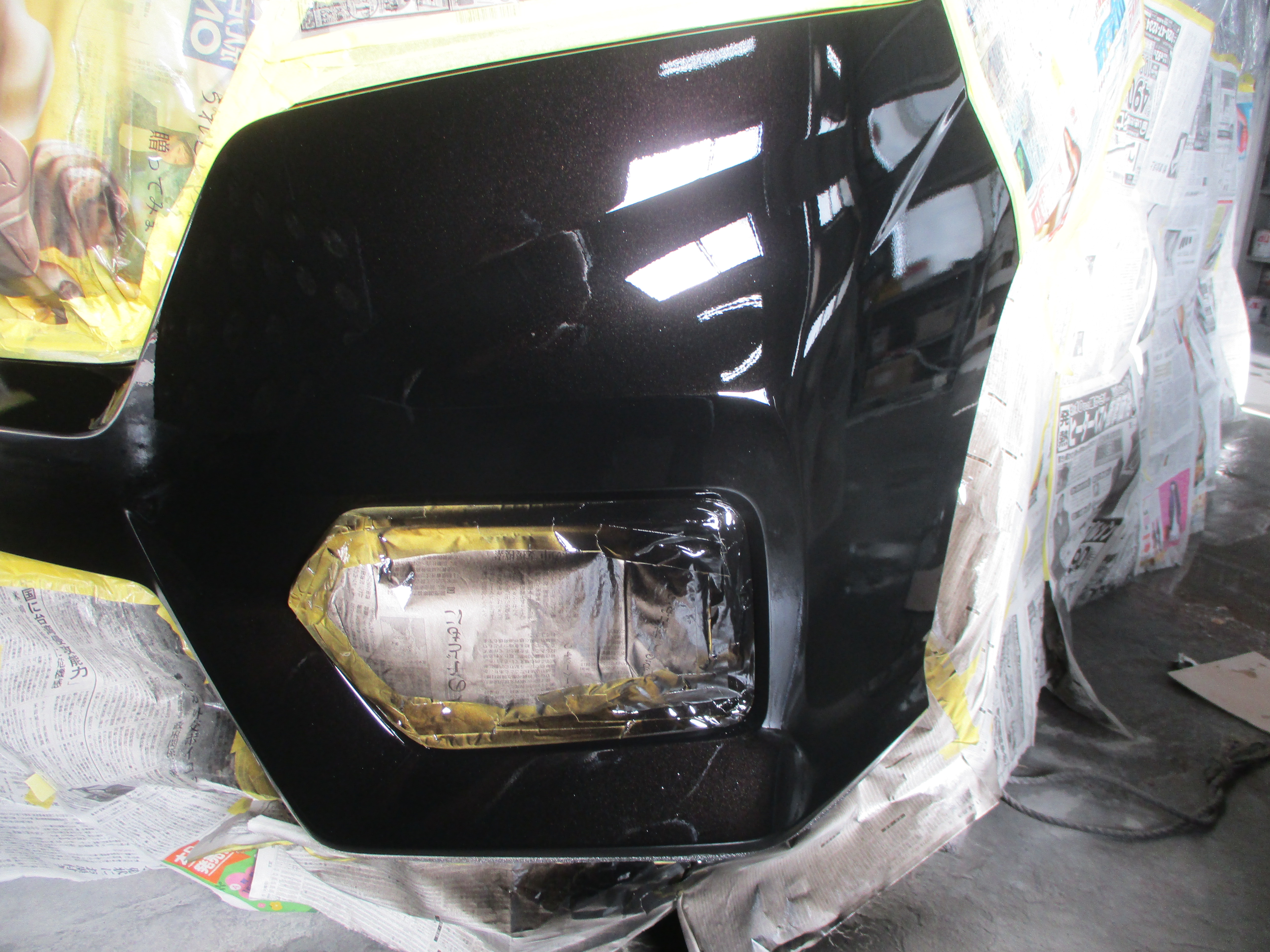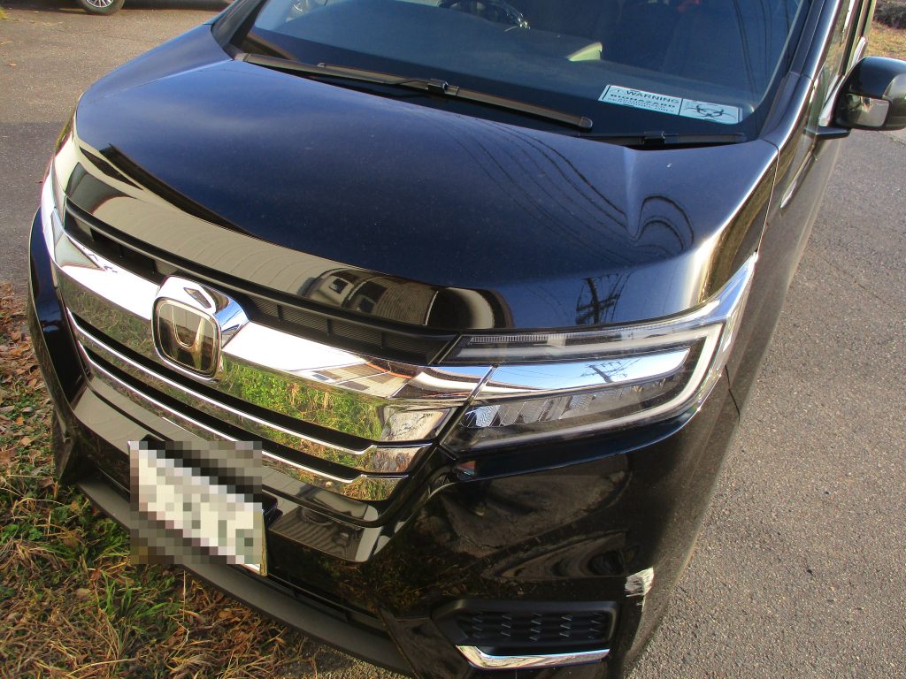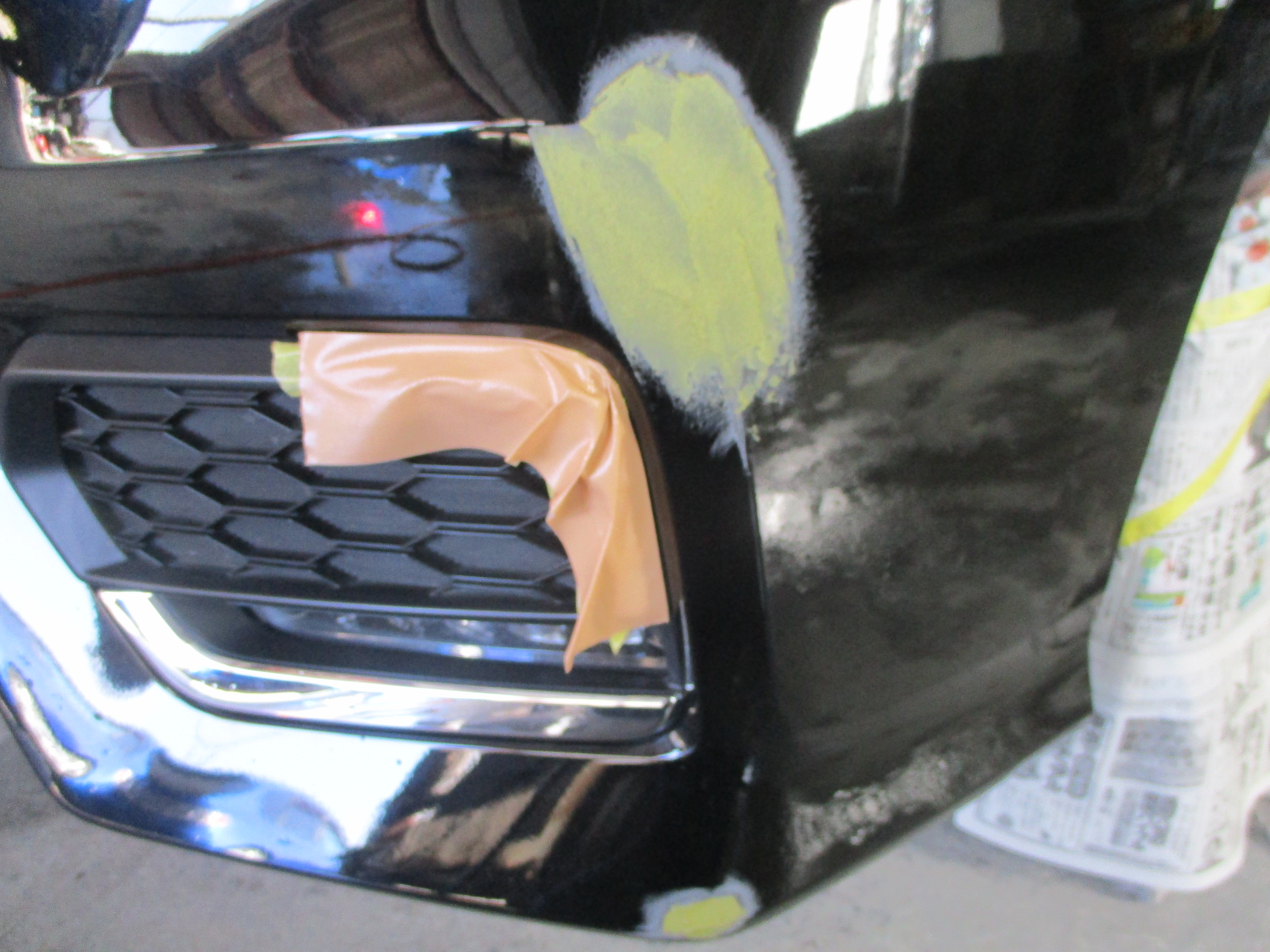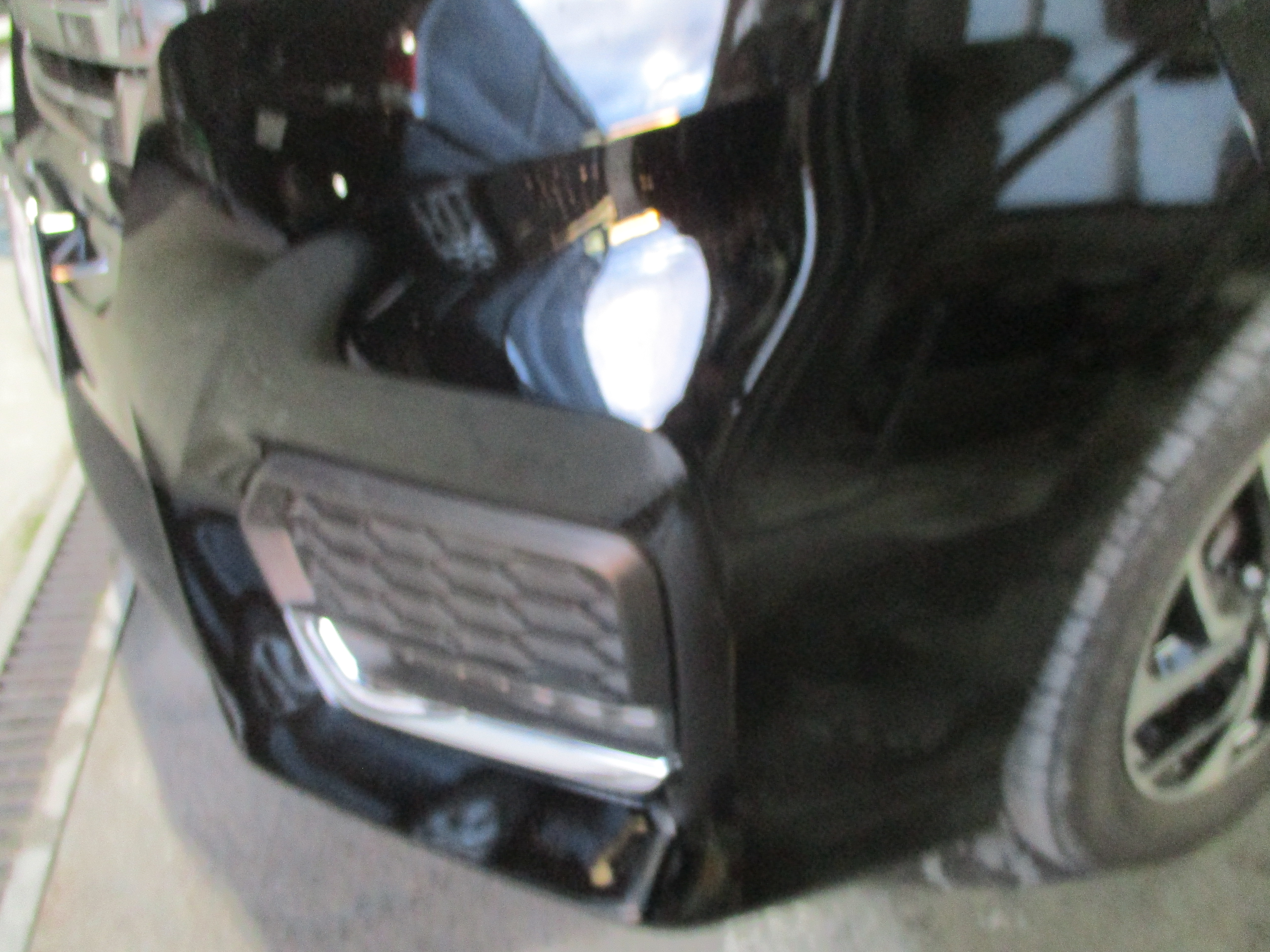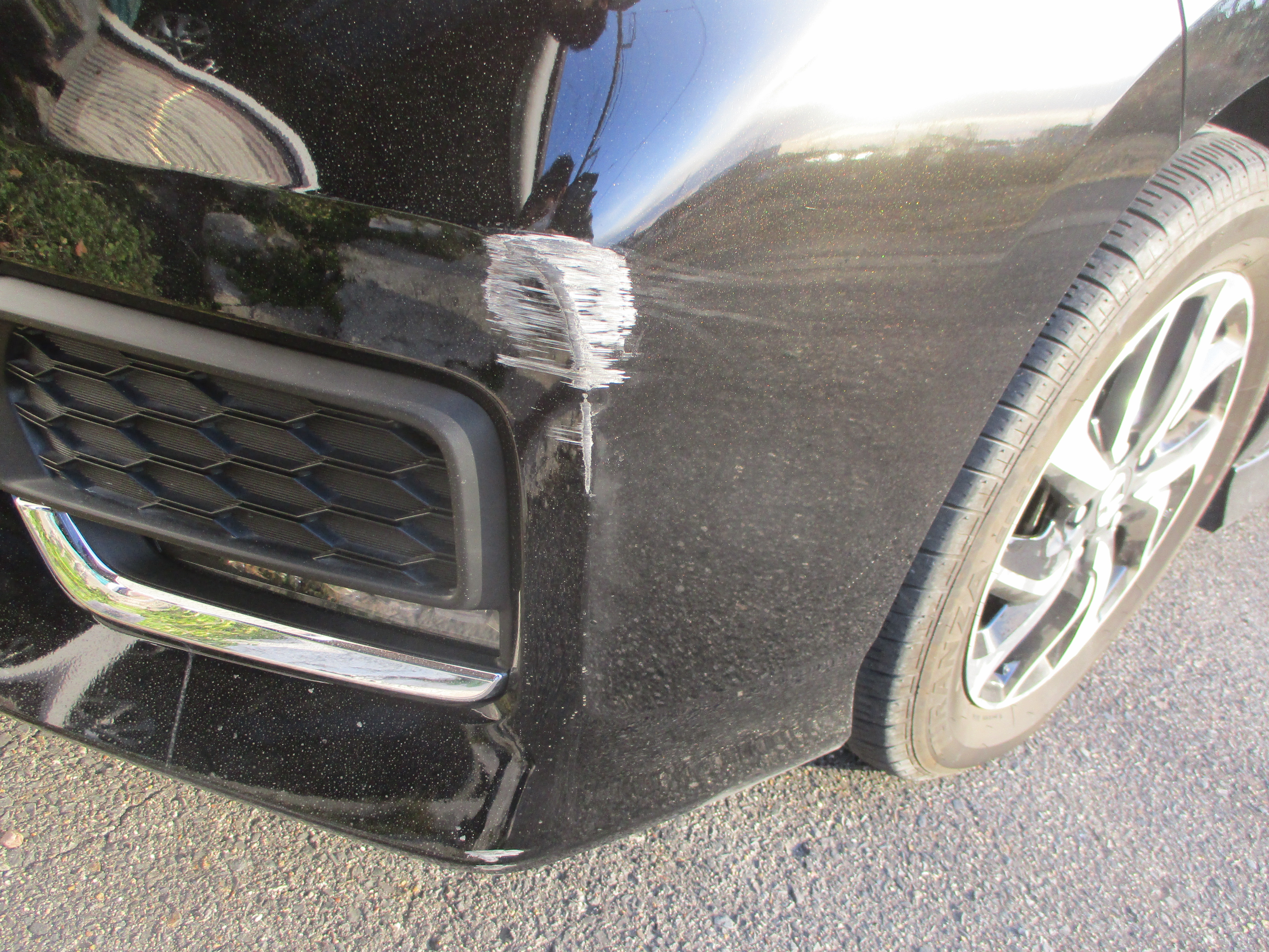 フロントバンパーの左側の角の辺りに縦に上側と下側にキズと少しのヘコミがあります。