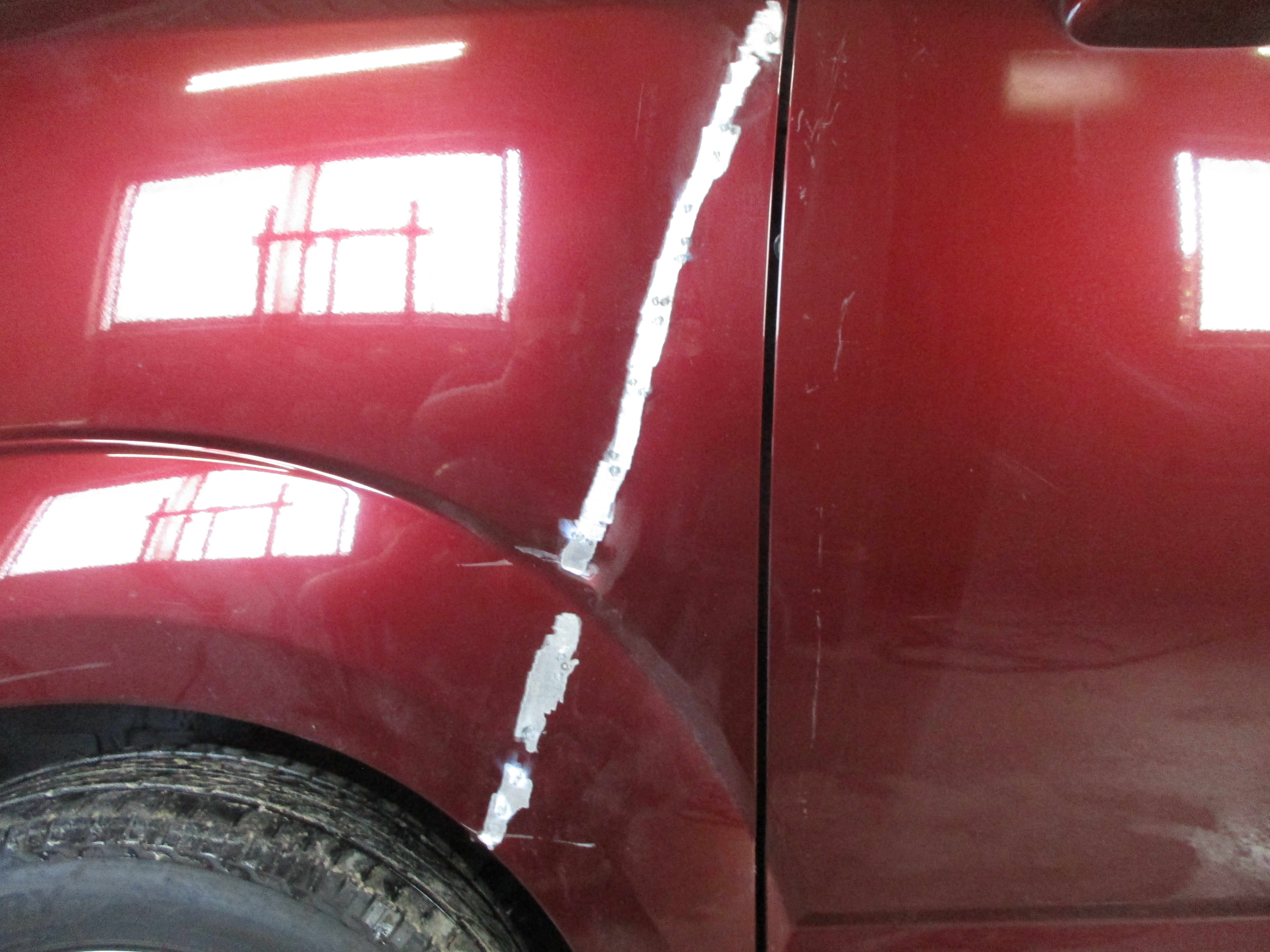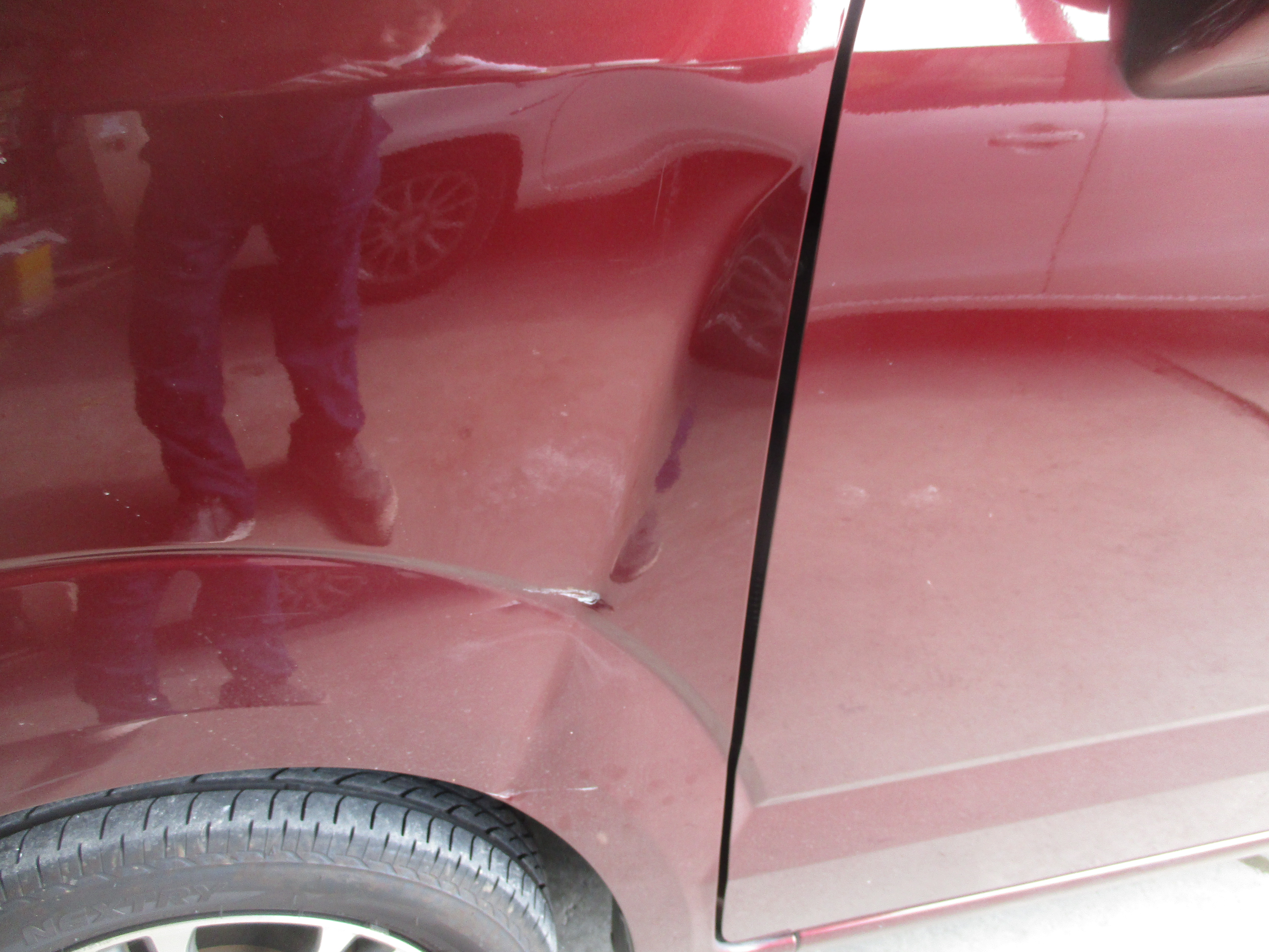 左フロントフェンダーのフロントドア寄りに斜めに20センチ以上の凹みがあります。今回は板金での対応となりました。