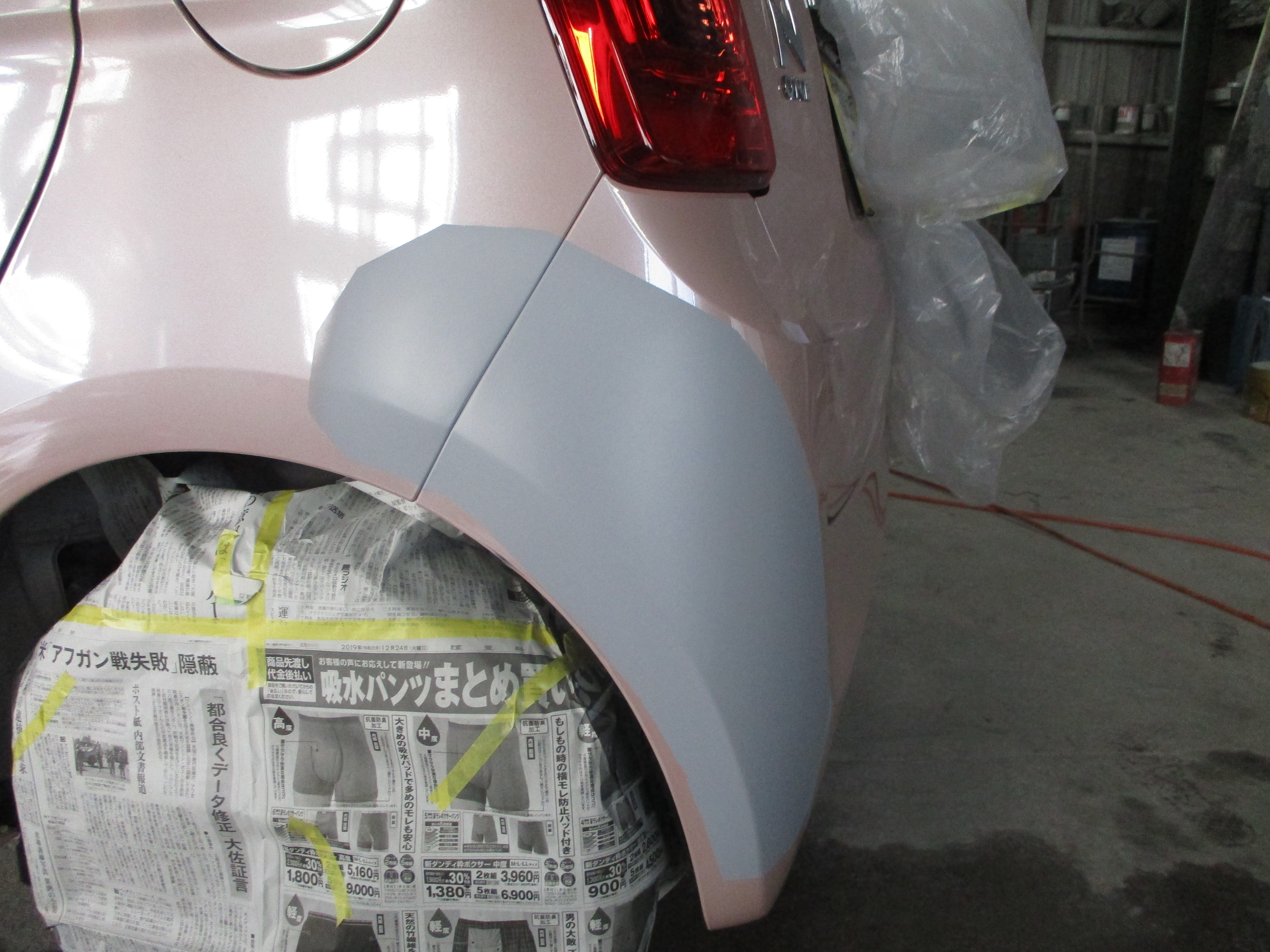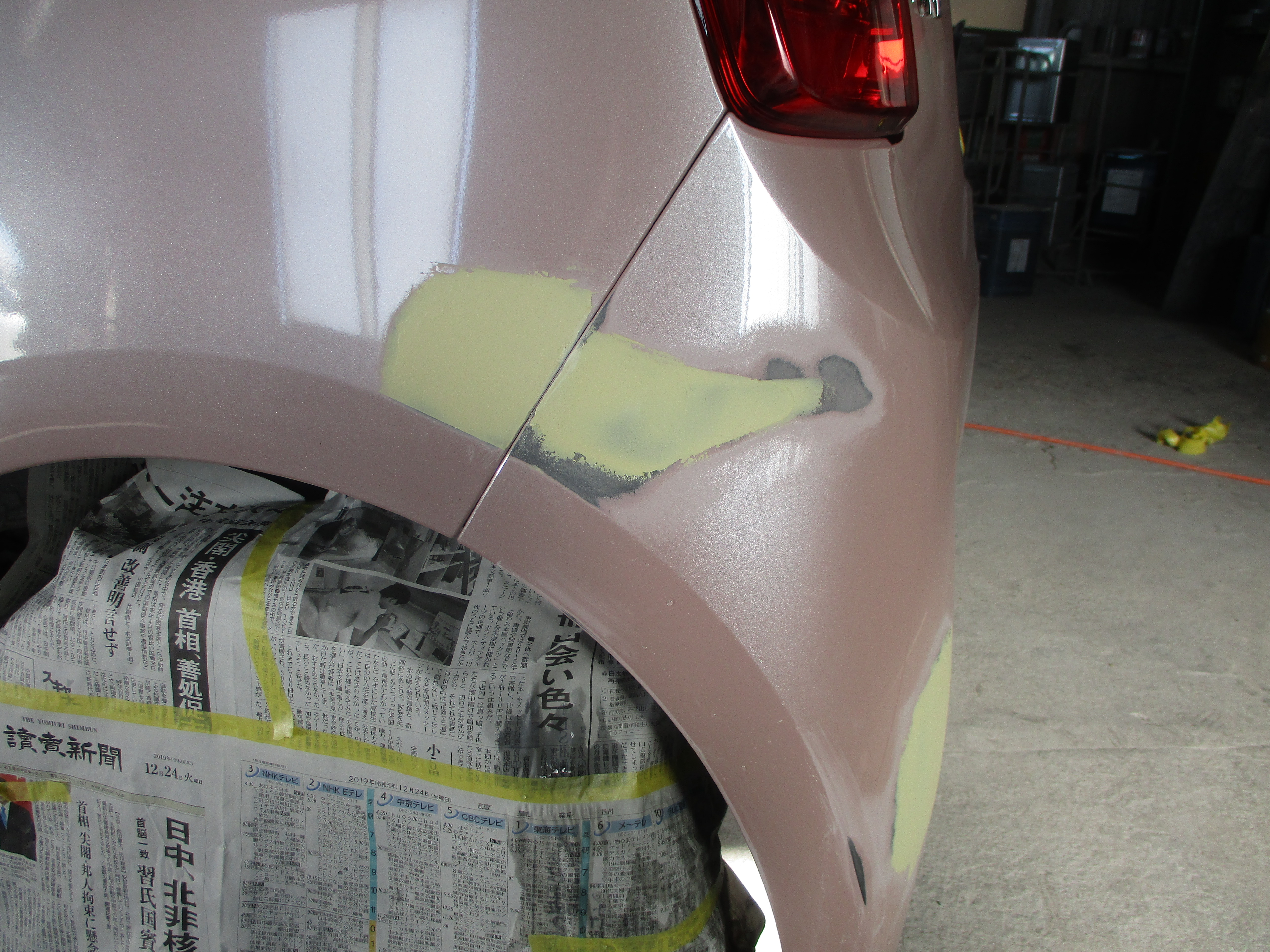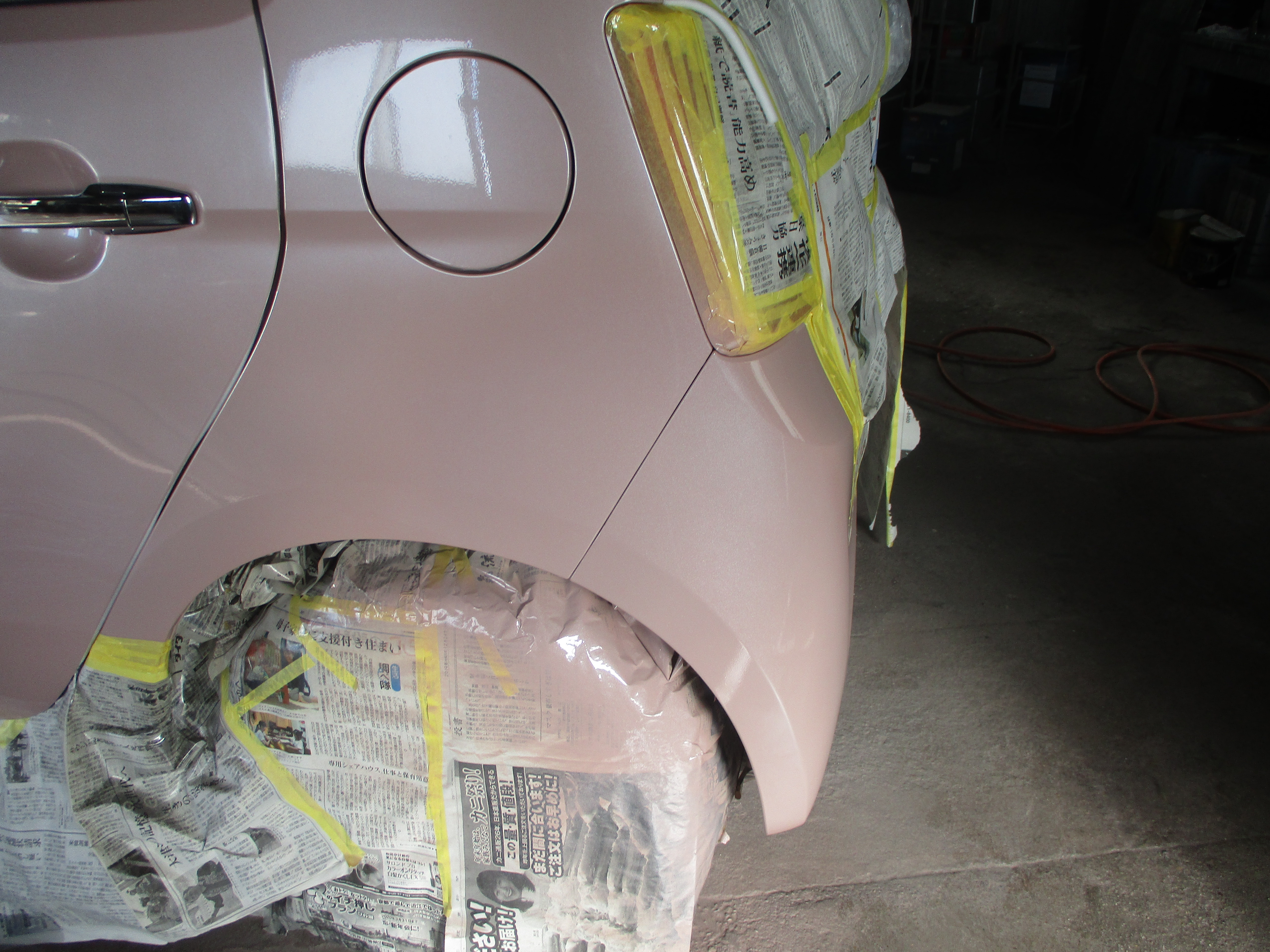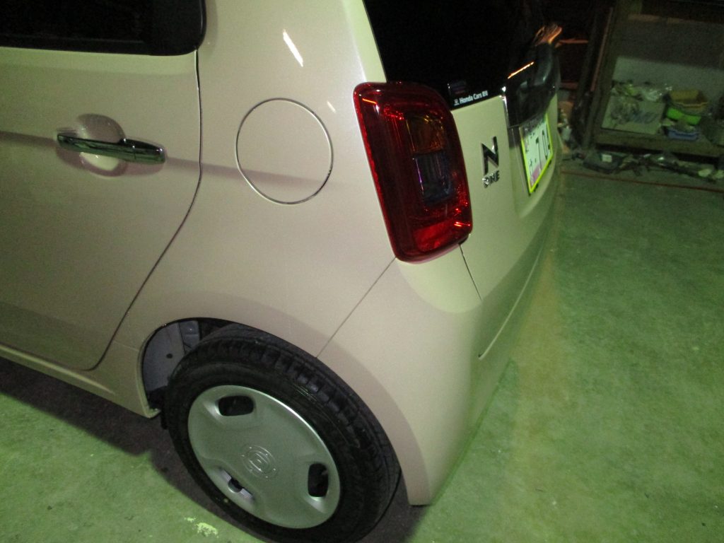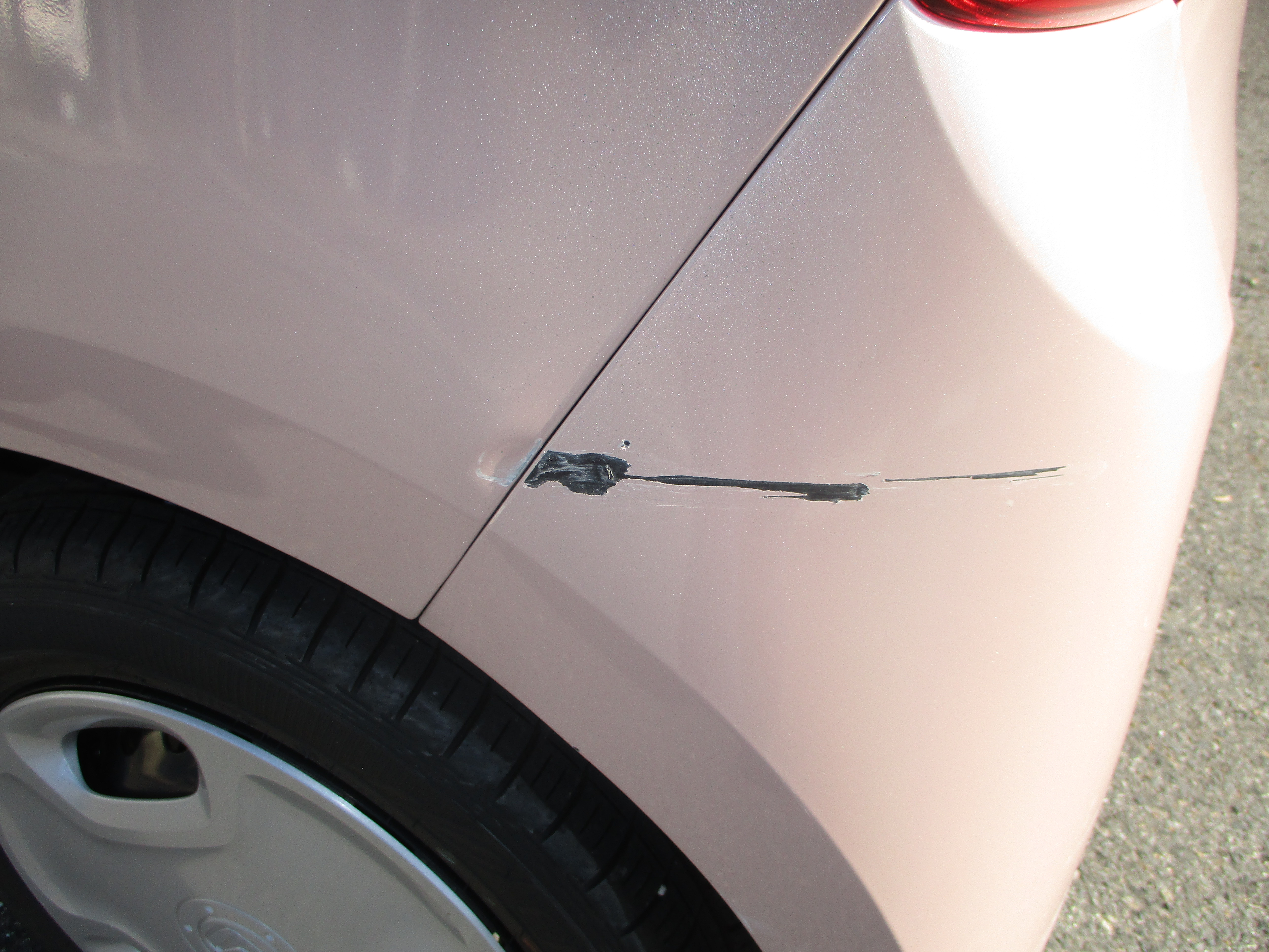 リアクォータの後ろ側の境目辺りにポコッと小さいヘコミがあり、そのすぐ後ろから横に15センチほど引っ掻いたようなキズがあります。境目の修理は隙間を意識しながら直すので今回はその部分が仕上がりのポイントになります。