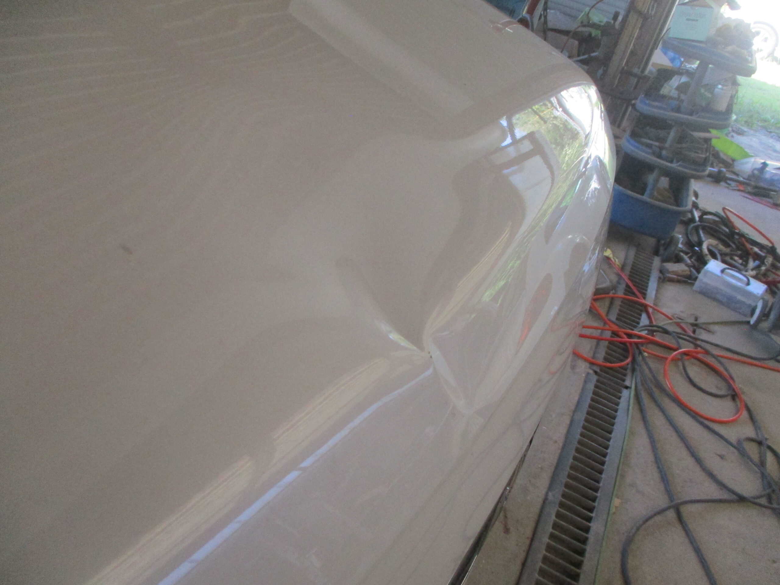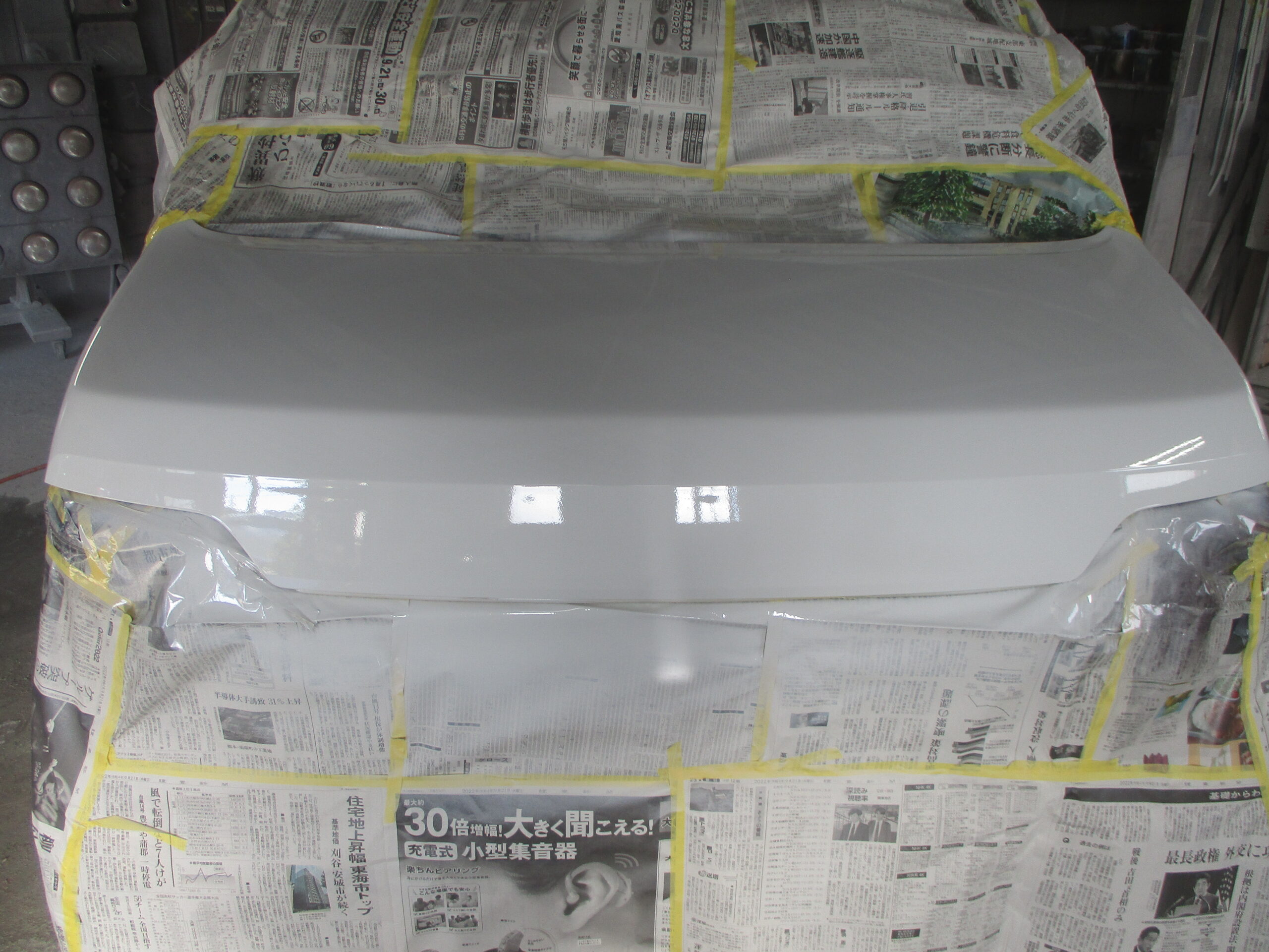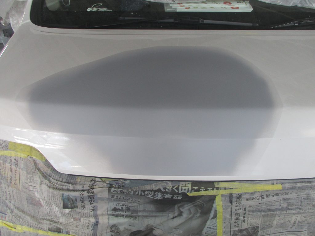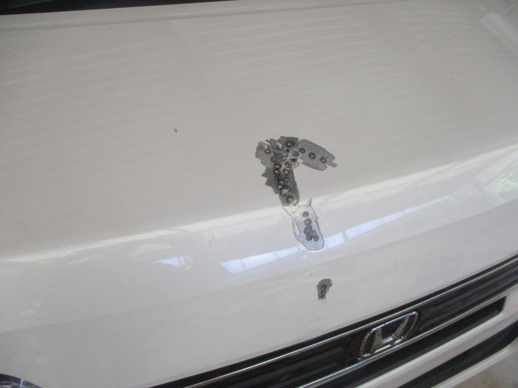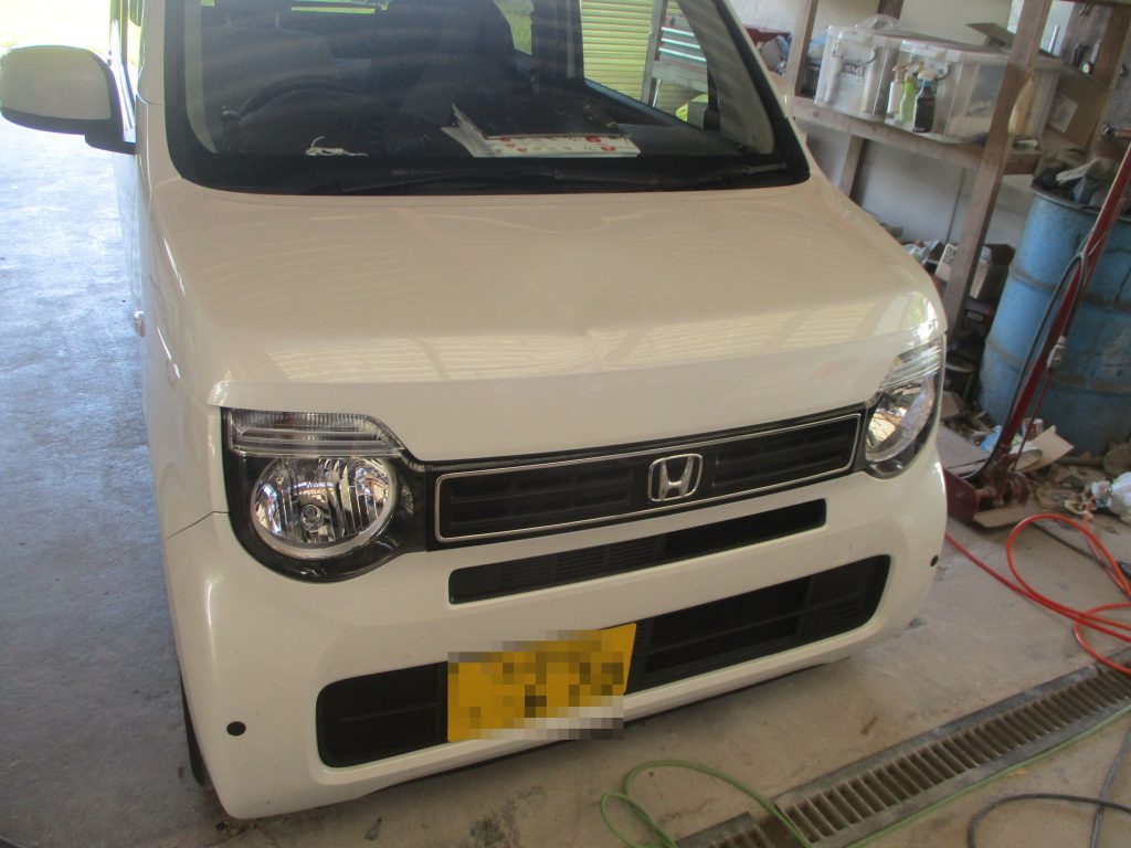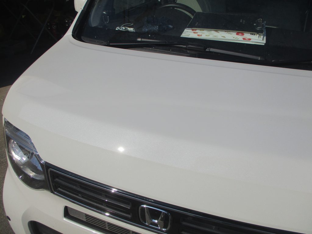 N-WGNのボンネットの真ん中の先端側が深く凹んでいます。ディーラーですと部品交換となるため板金で修理出来ないかとご相談されました。当社では板金で修理が出来るのでお見積りを提示して後日に入庫されました。