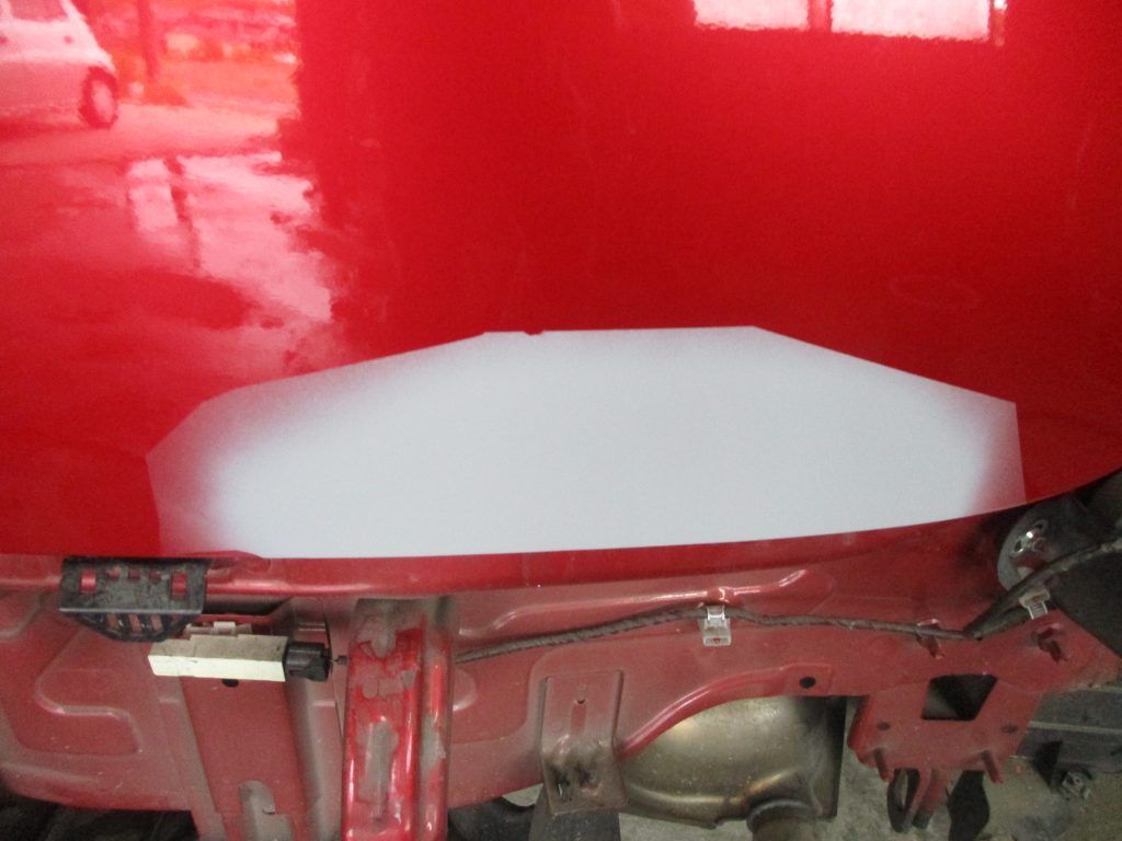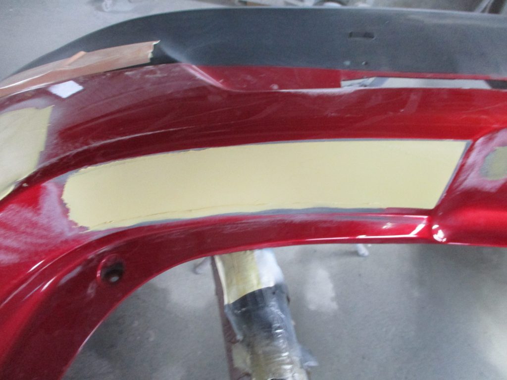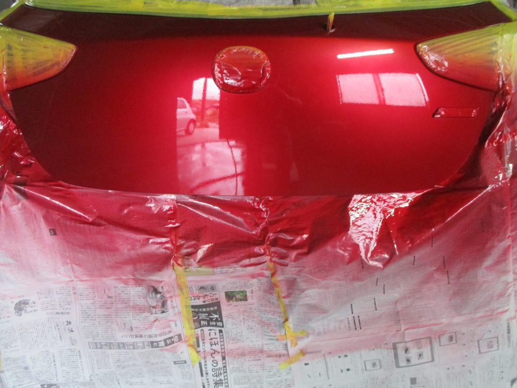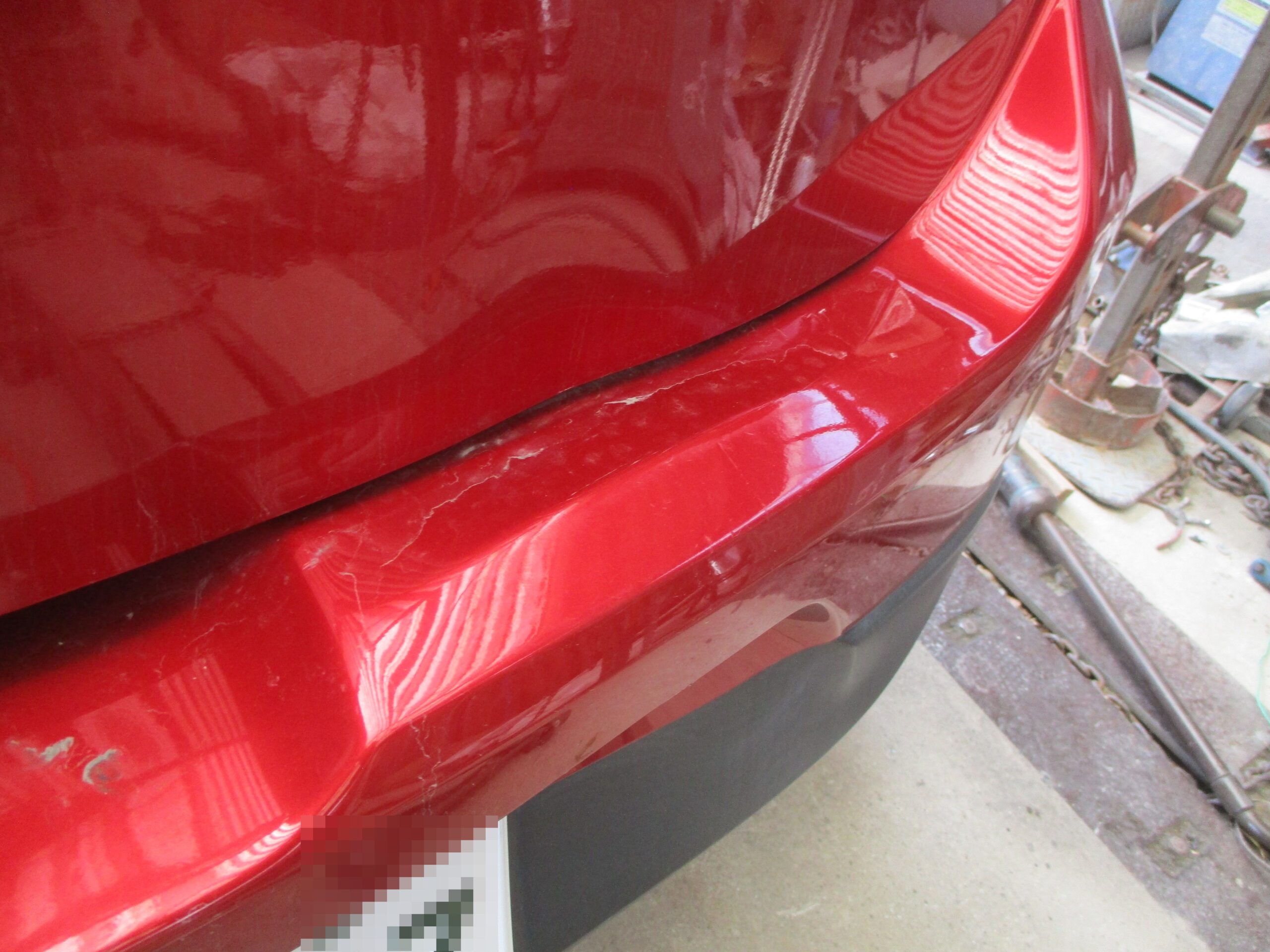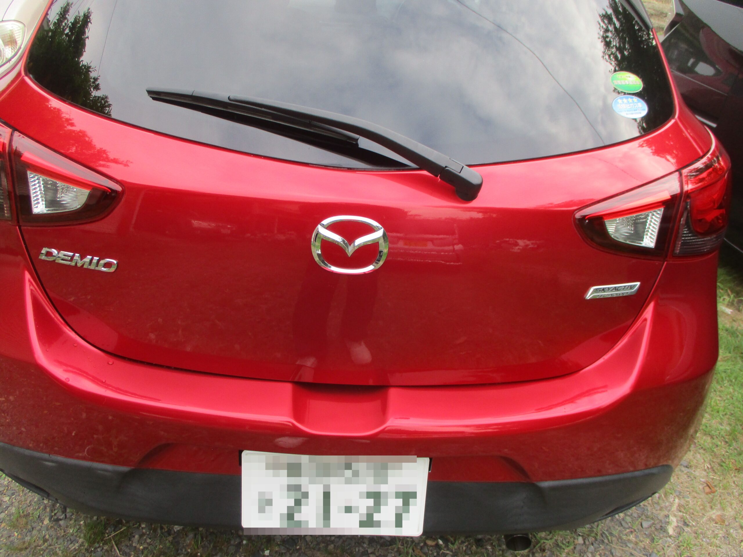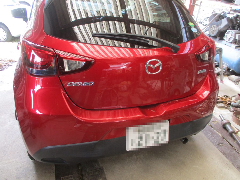デミオのバックドアの下側が凹んでいて、すぐ下のリアバンパーは正面から押し込まれた影響で上が膨らんでます。どちらも予算を抑えるので修理で直します。